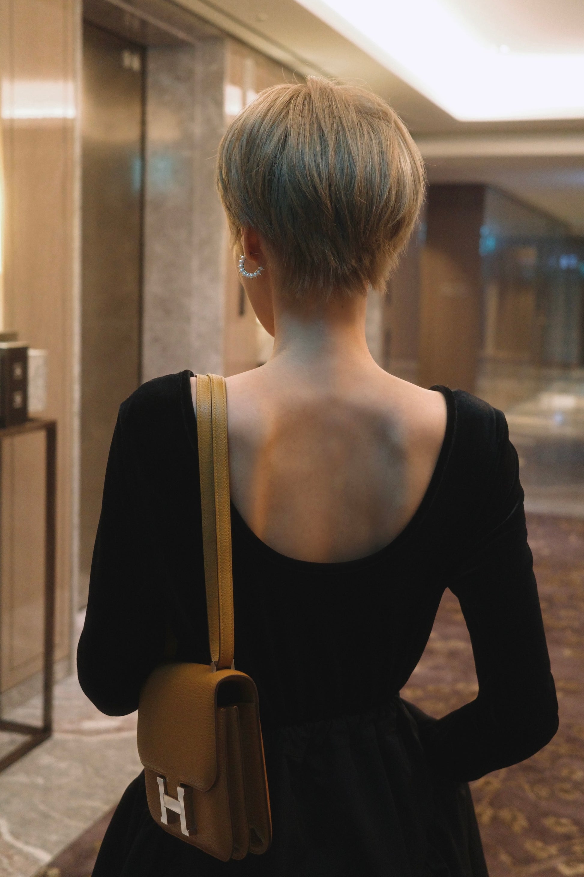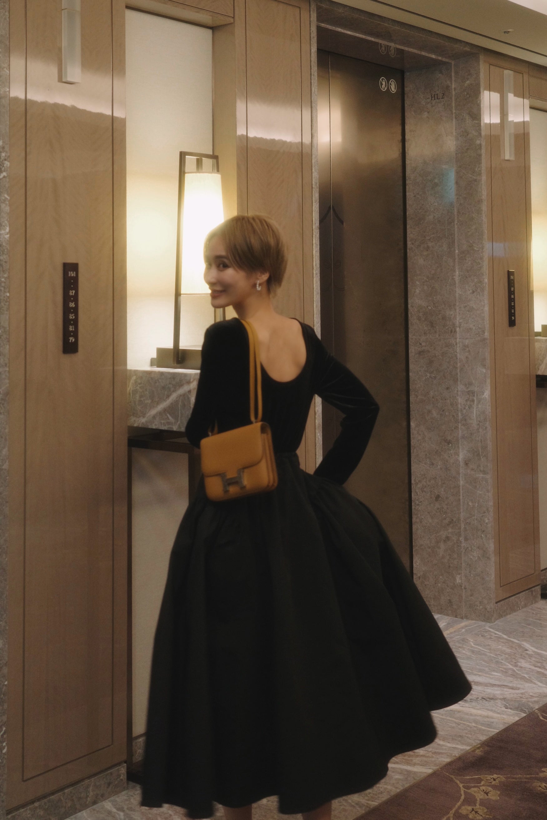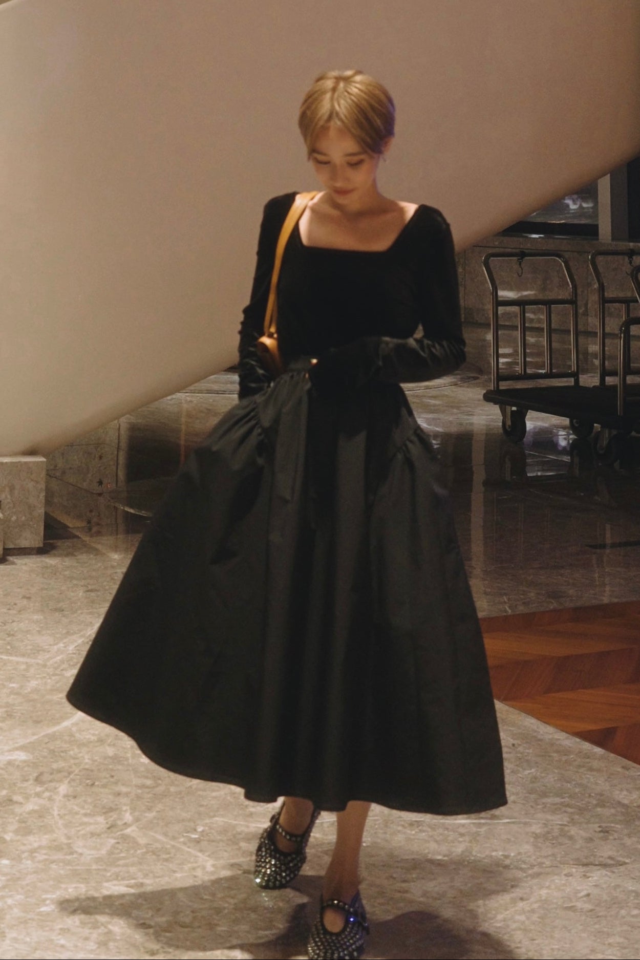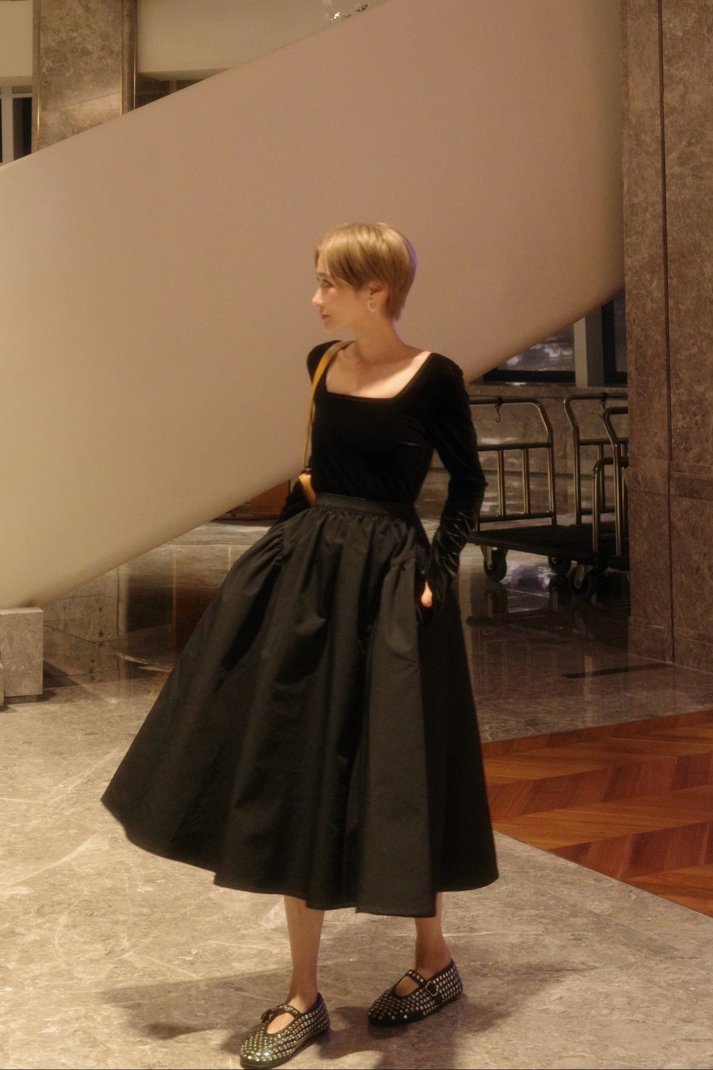 ハリのある素材が生み出す立体的なボリュームと、美しいドレープが特徴。