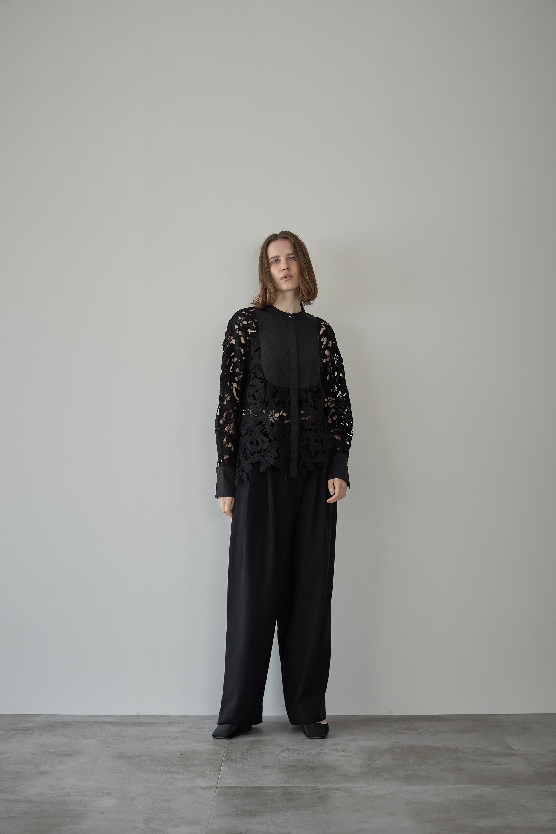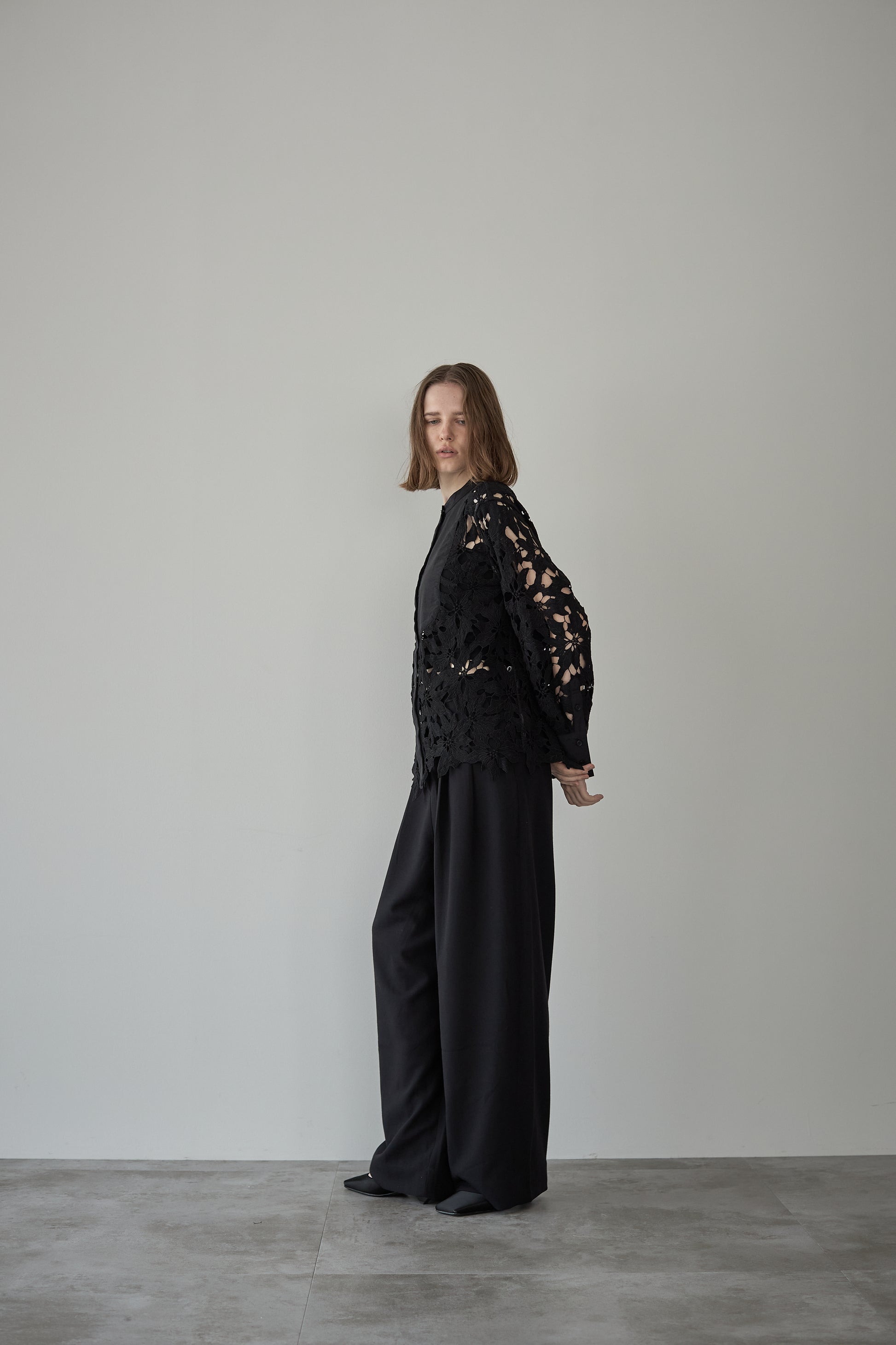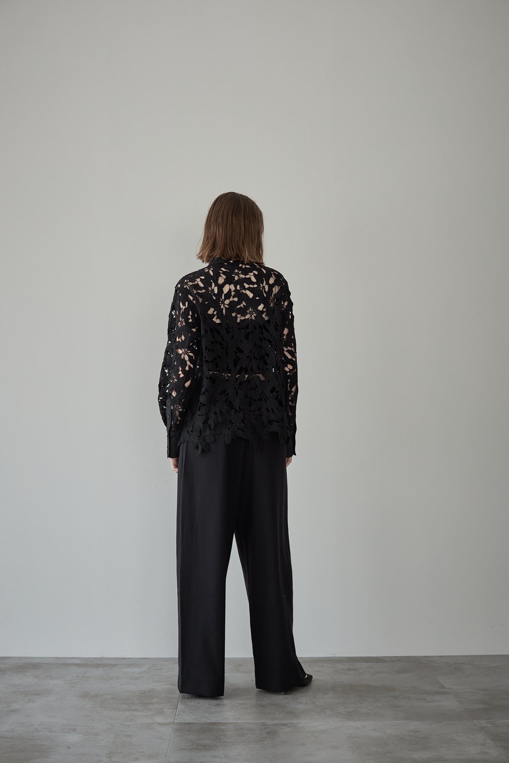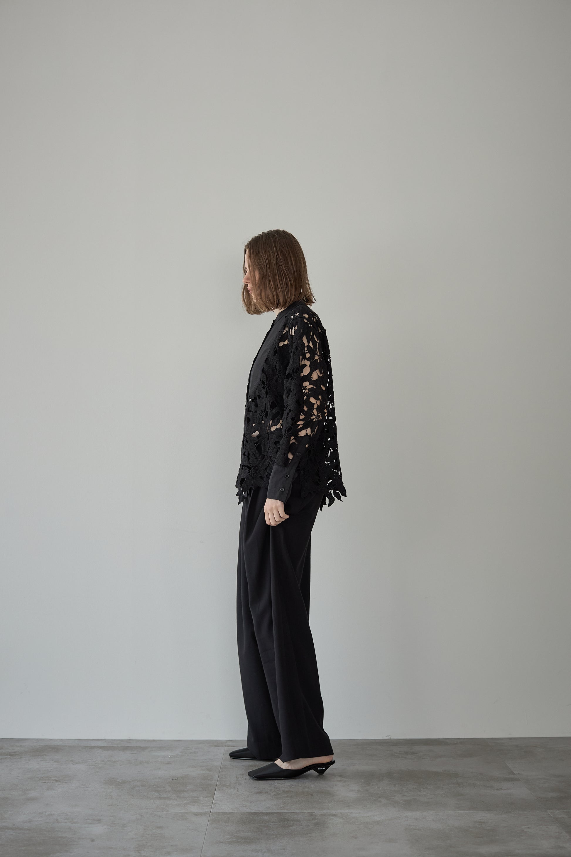 優雅なフラワーモチーフレースが、シンプルなシルエットに奥行きを添える一枚。