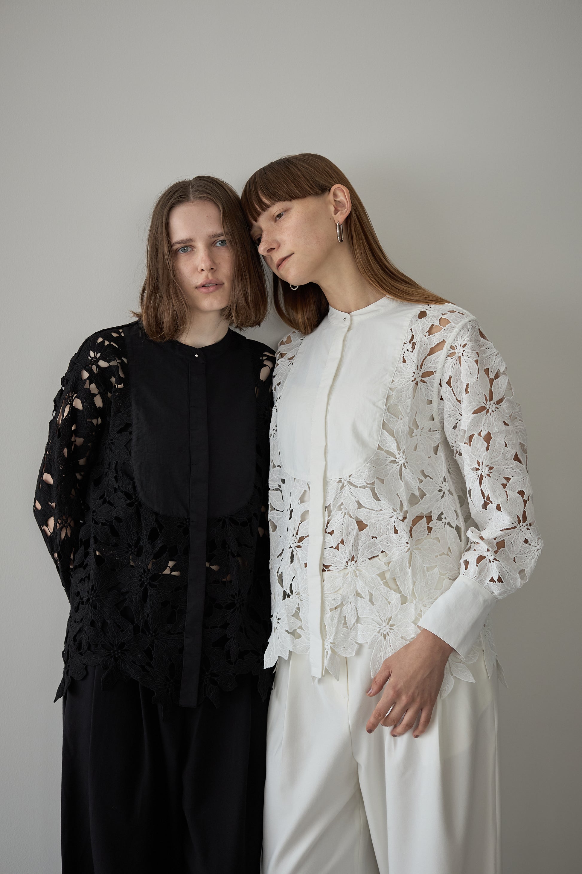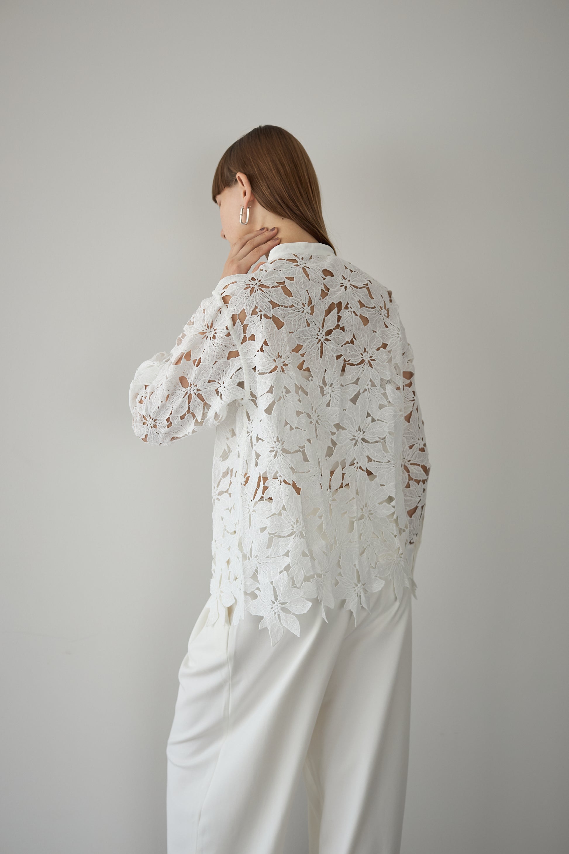 "繊細なレースで魅せる、上品なスタンドカラーレースシャツ"
