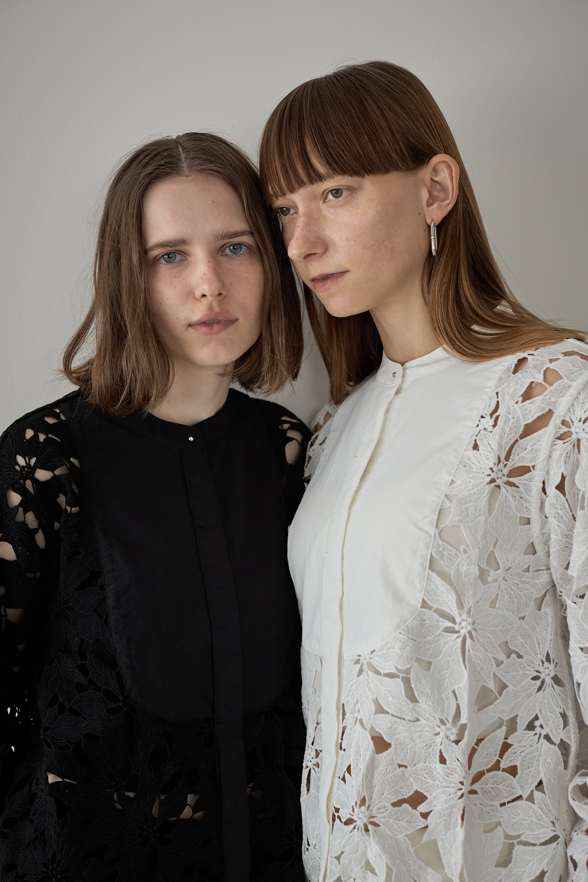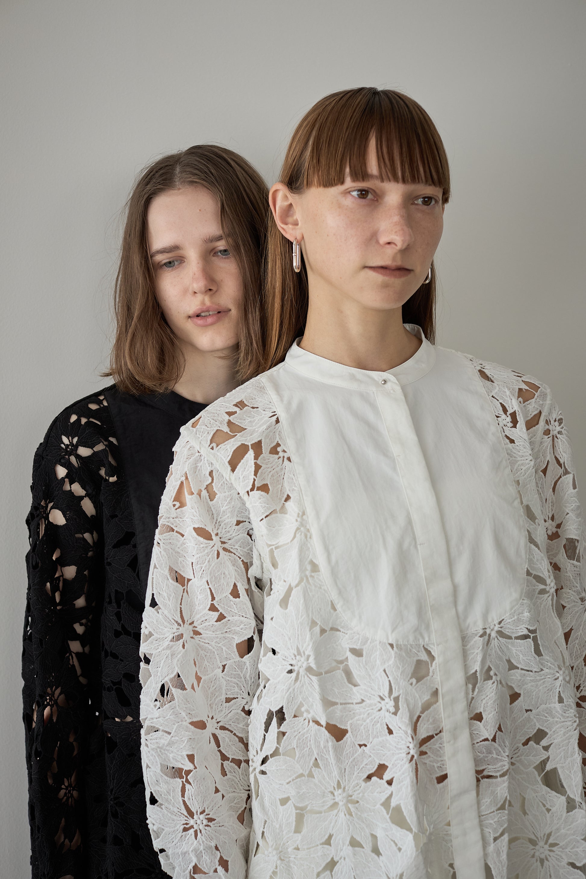 優雅なフラワーモチーフレースが、シンプルなシルエットに奥行きを添える一枚。