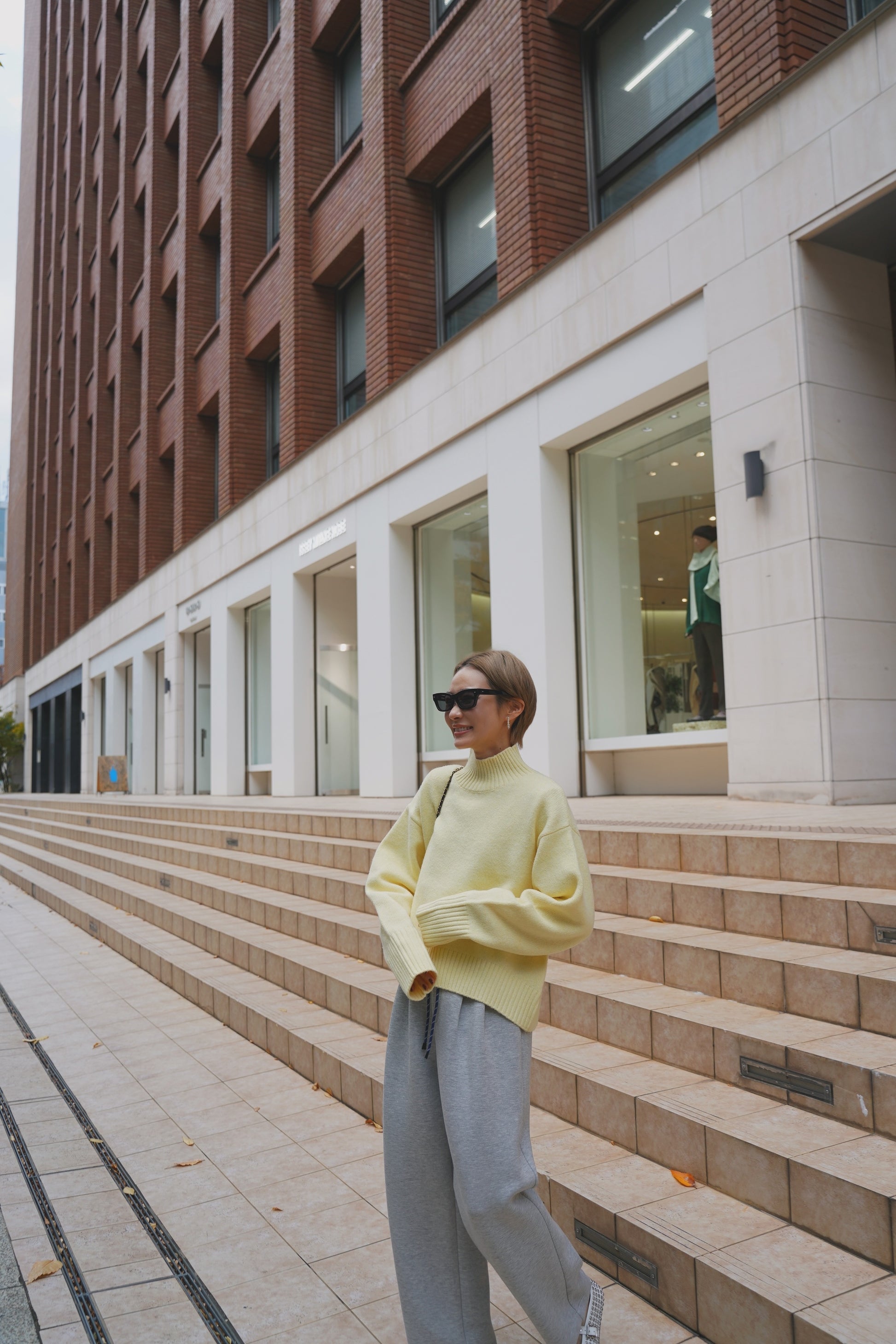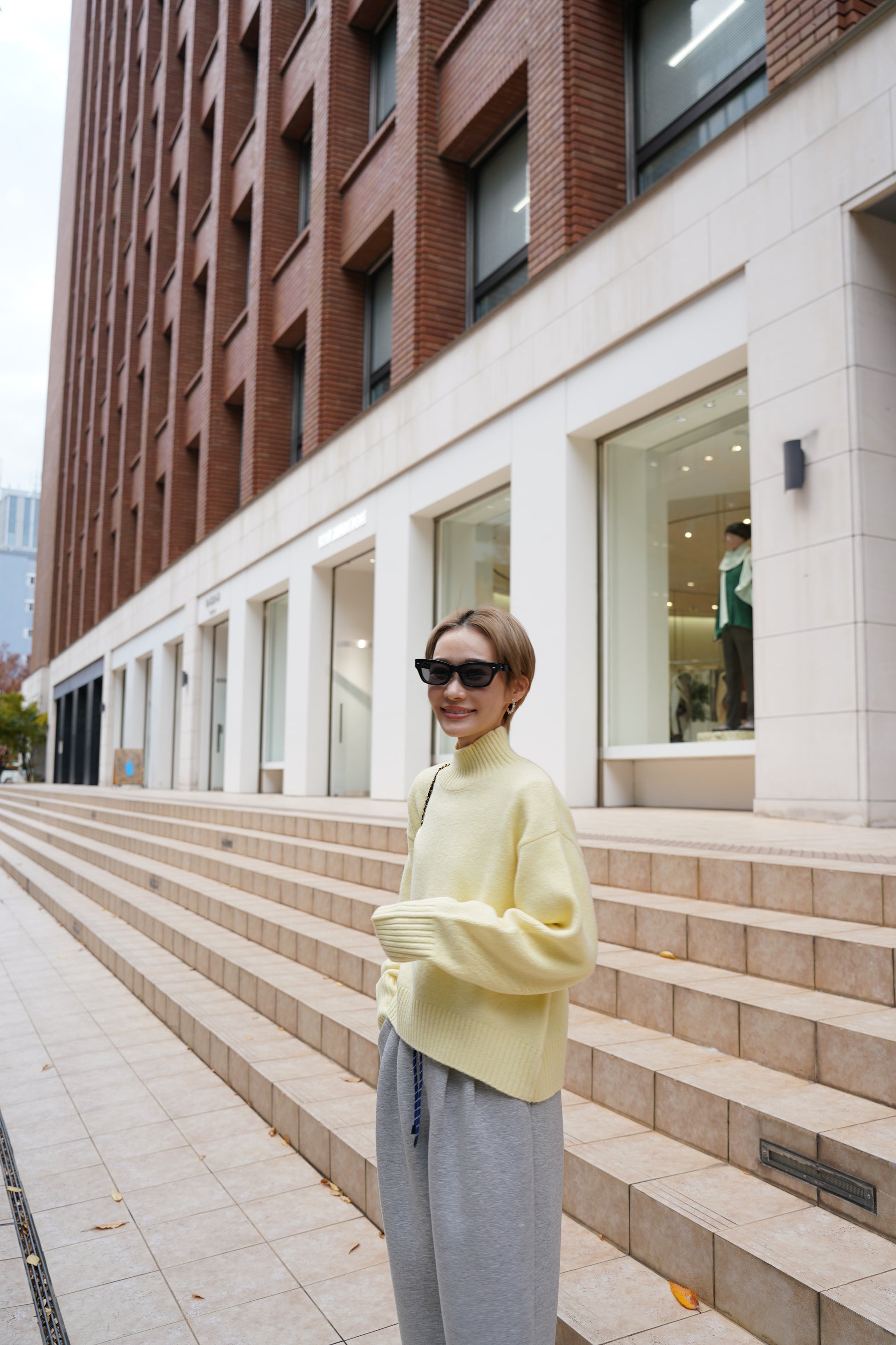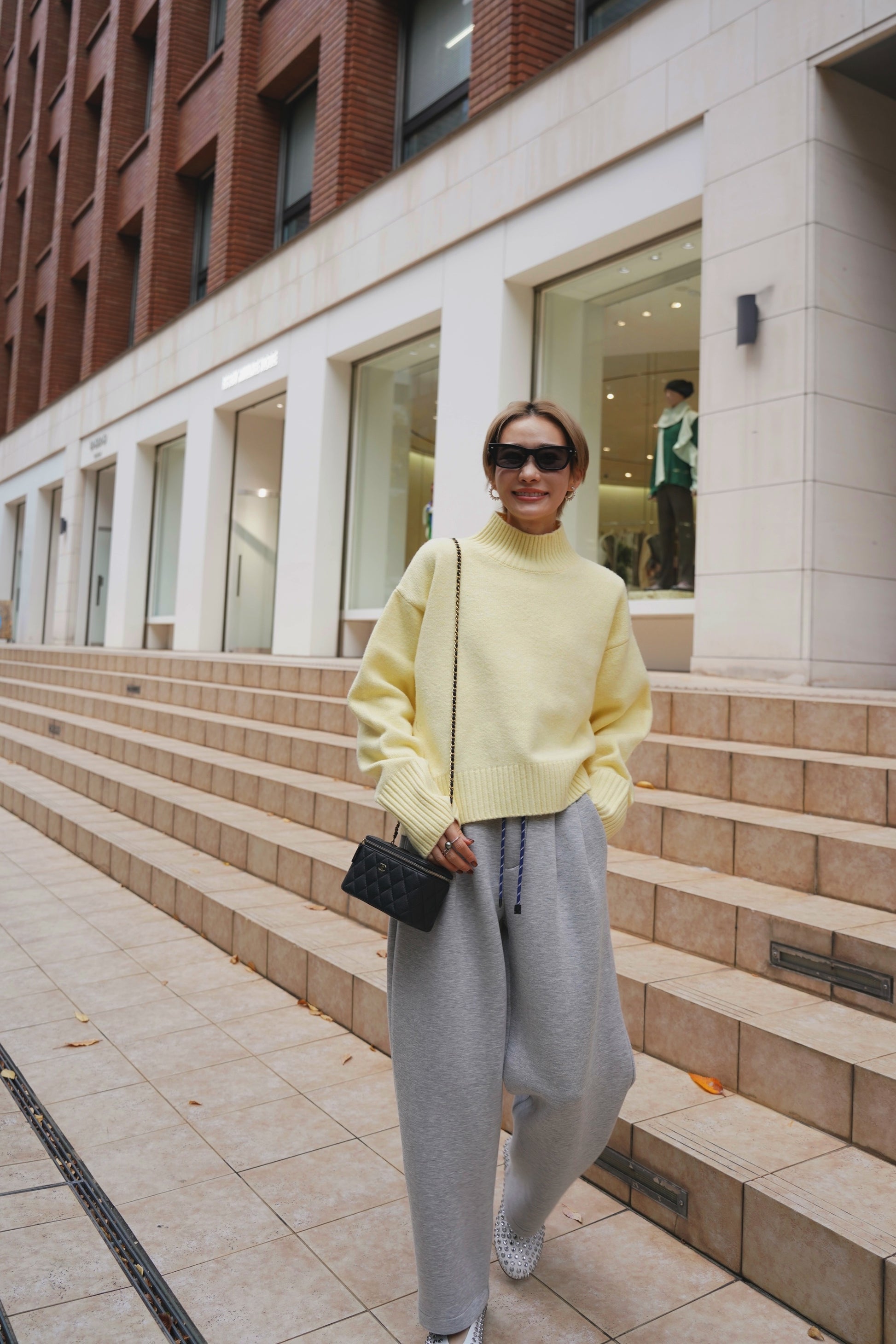 顔まわりをやさしく包むタートルネックは、上品で落ち着いた印象に。