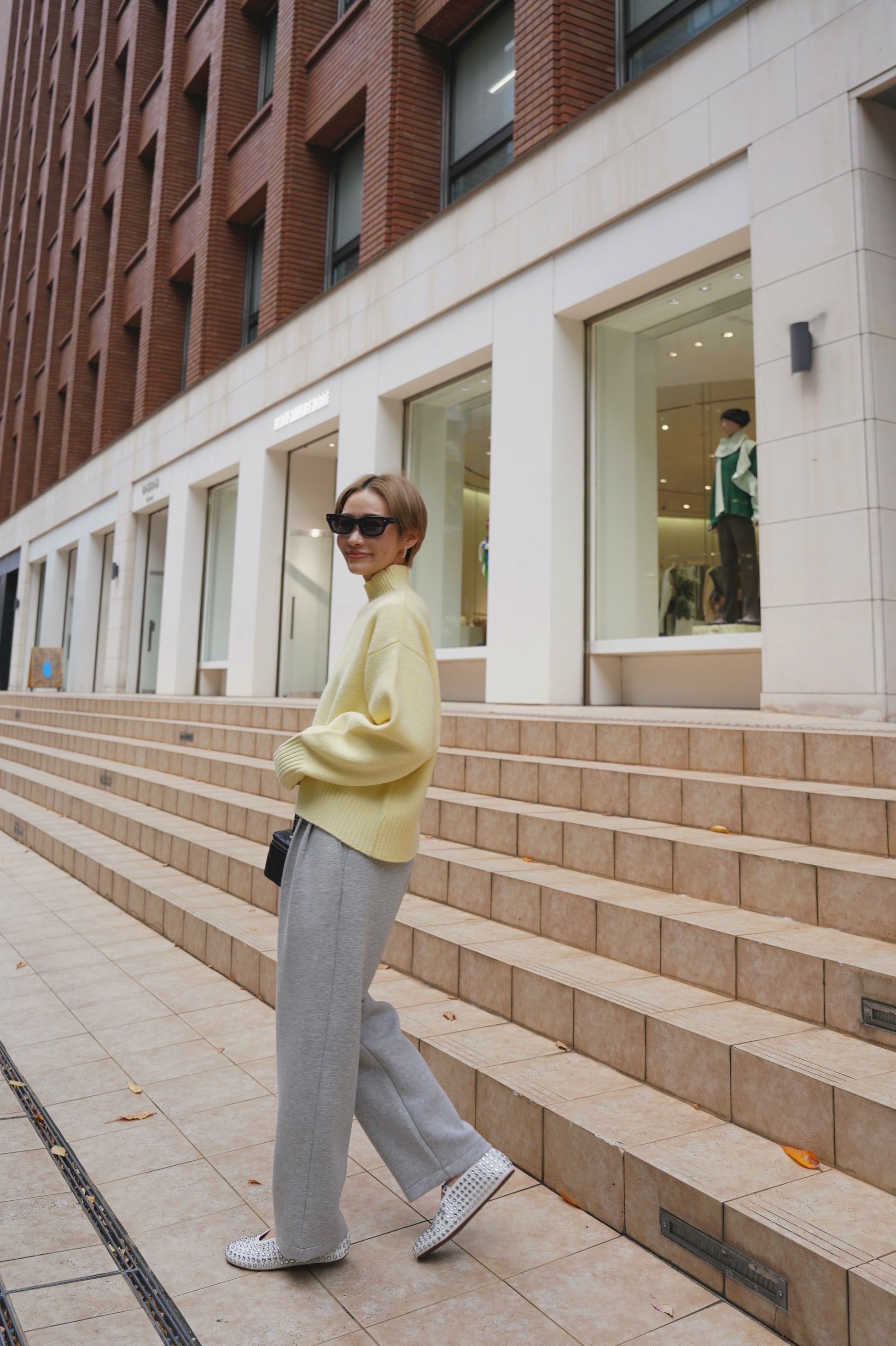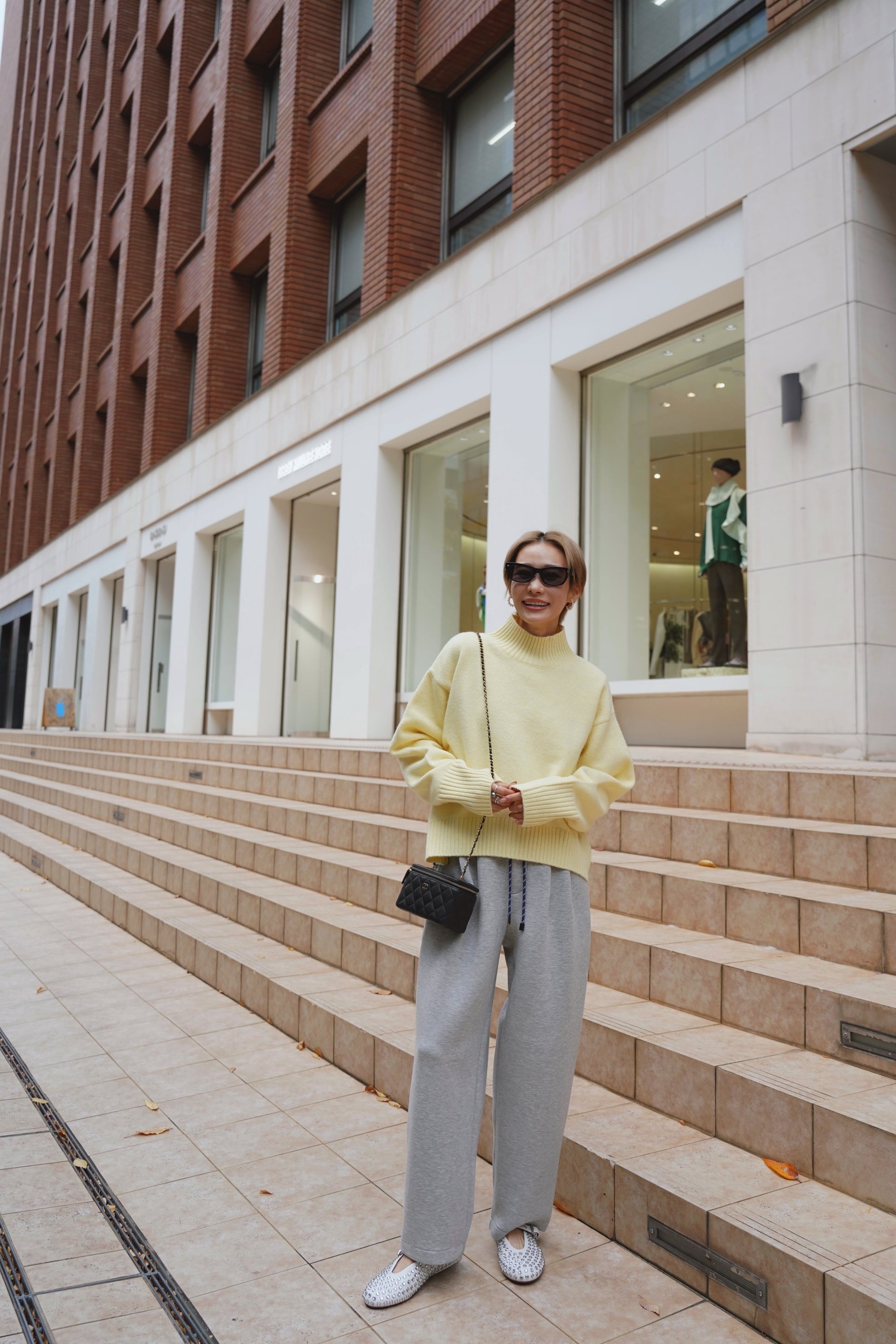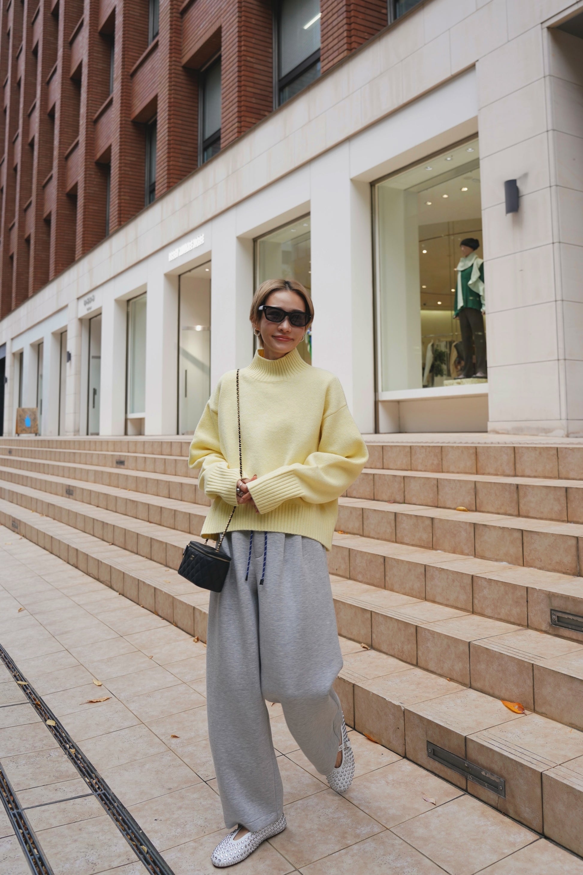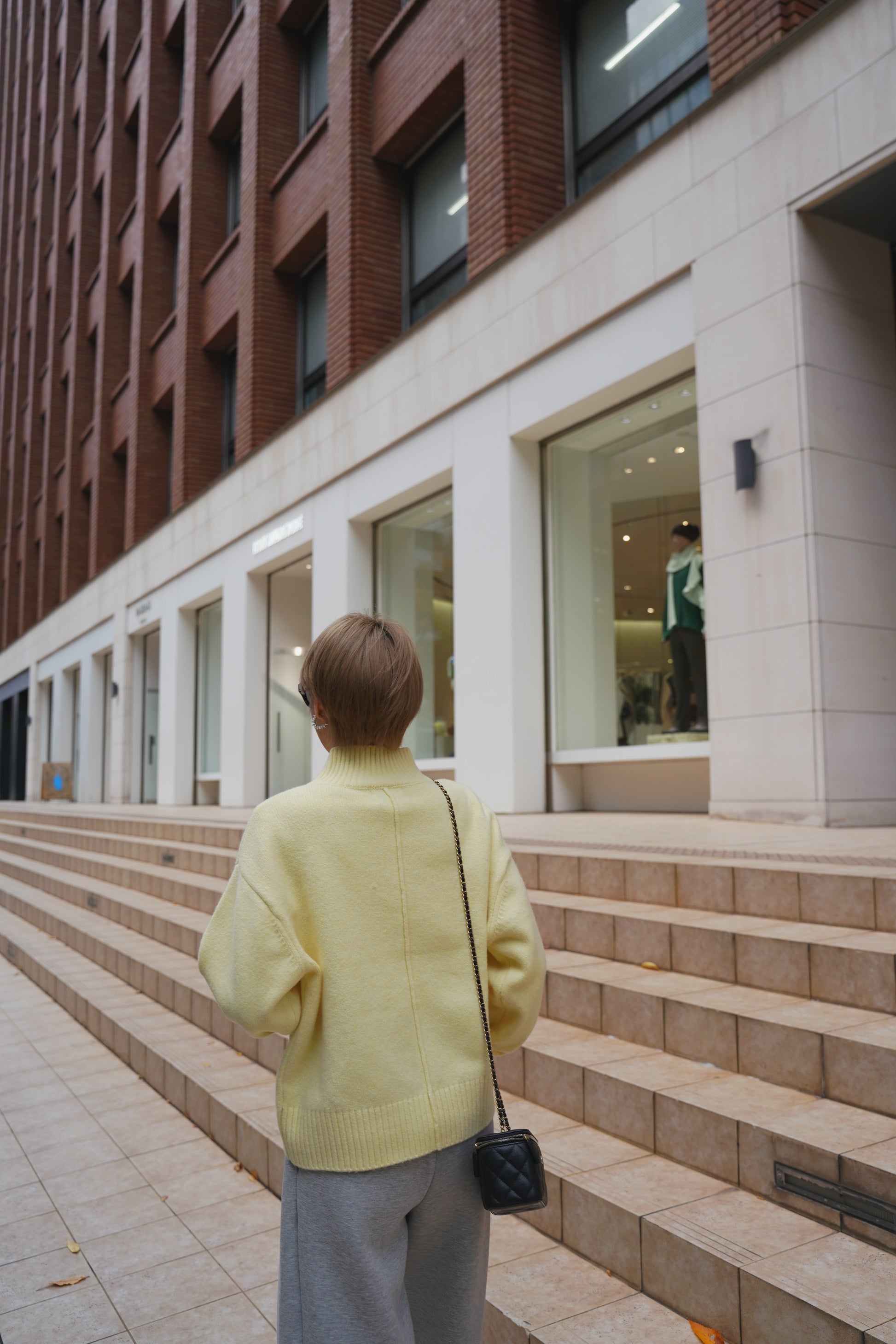 顔まわりをやさしく包むタートルネックは、上品で落ち着いた印象に。