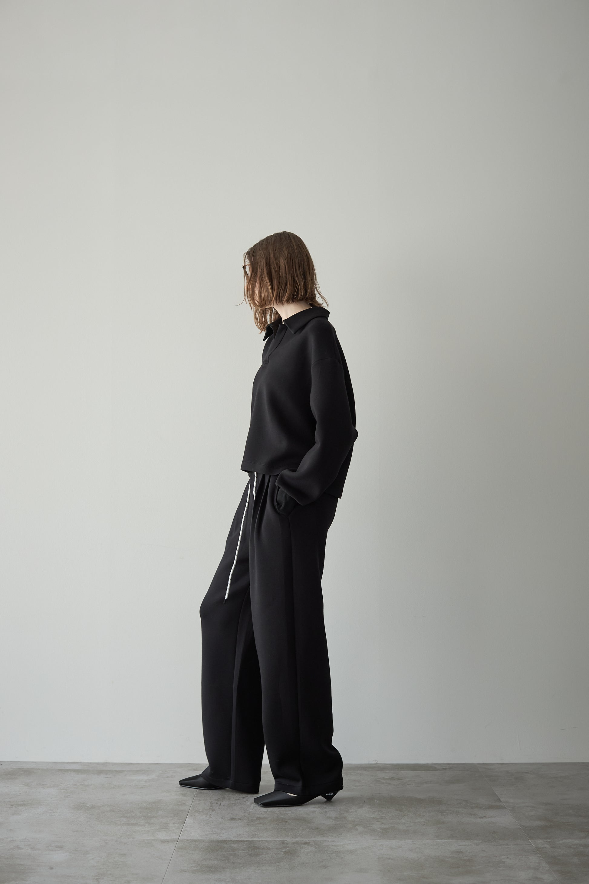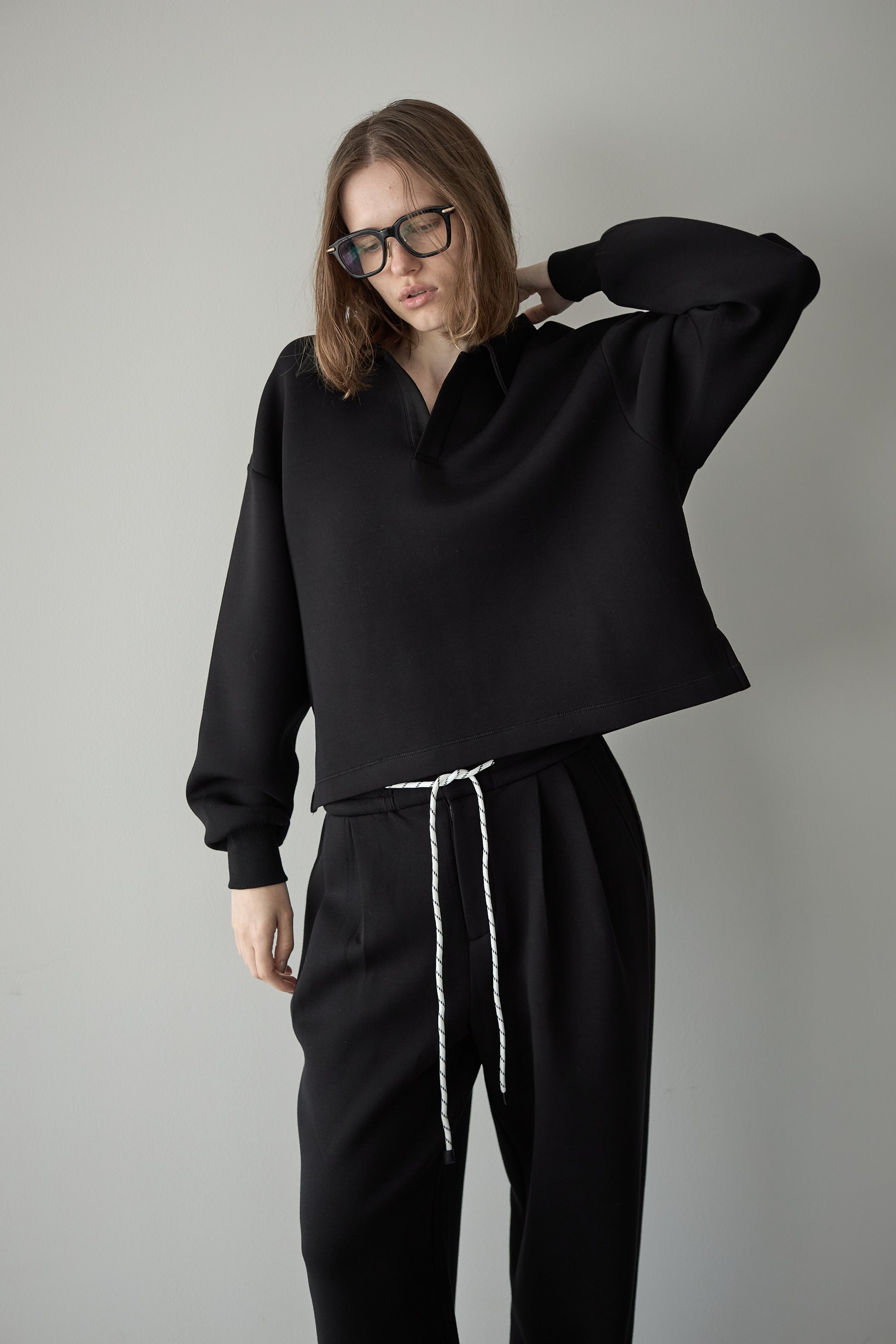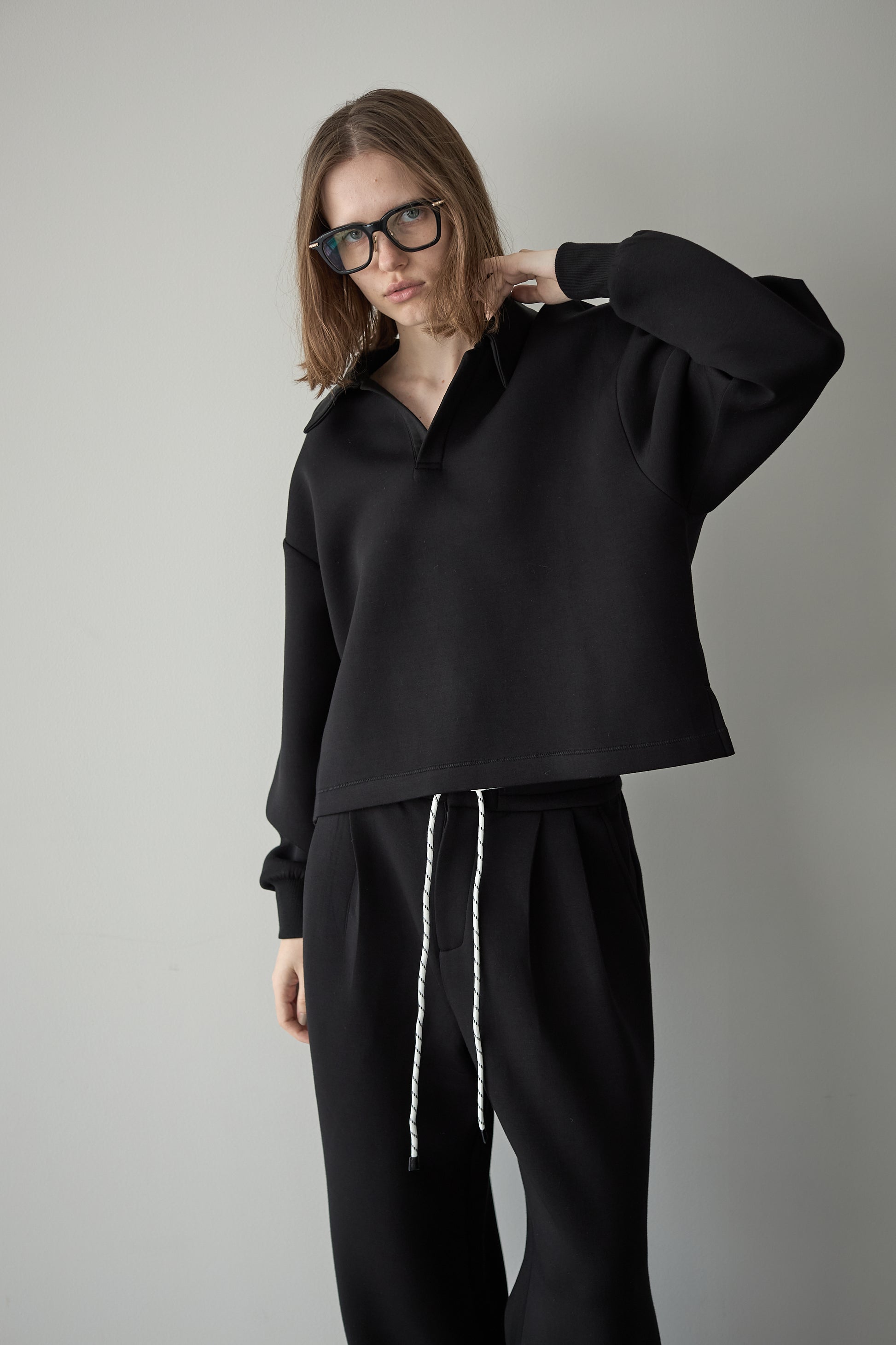 顔まわりをすっきりと見せるビッグカラーが印象的なスウェットトップス。