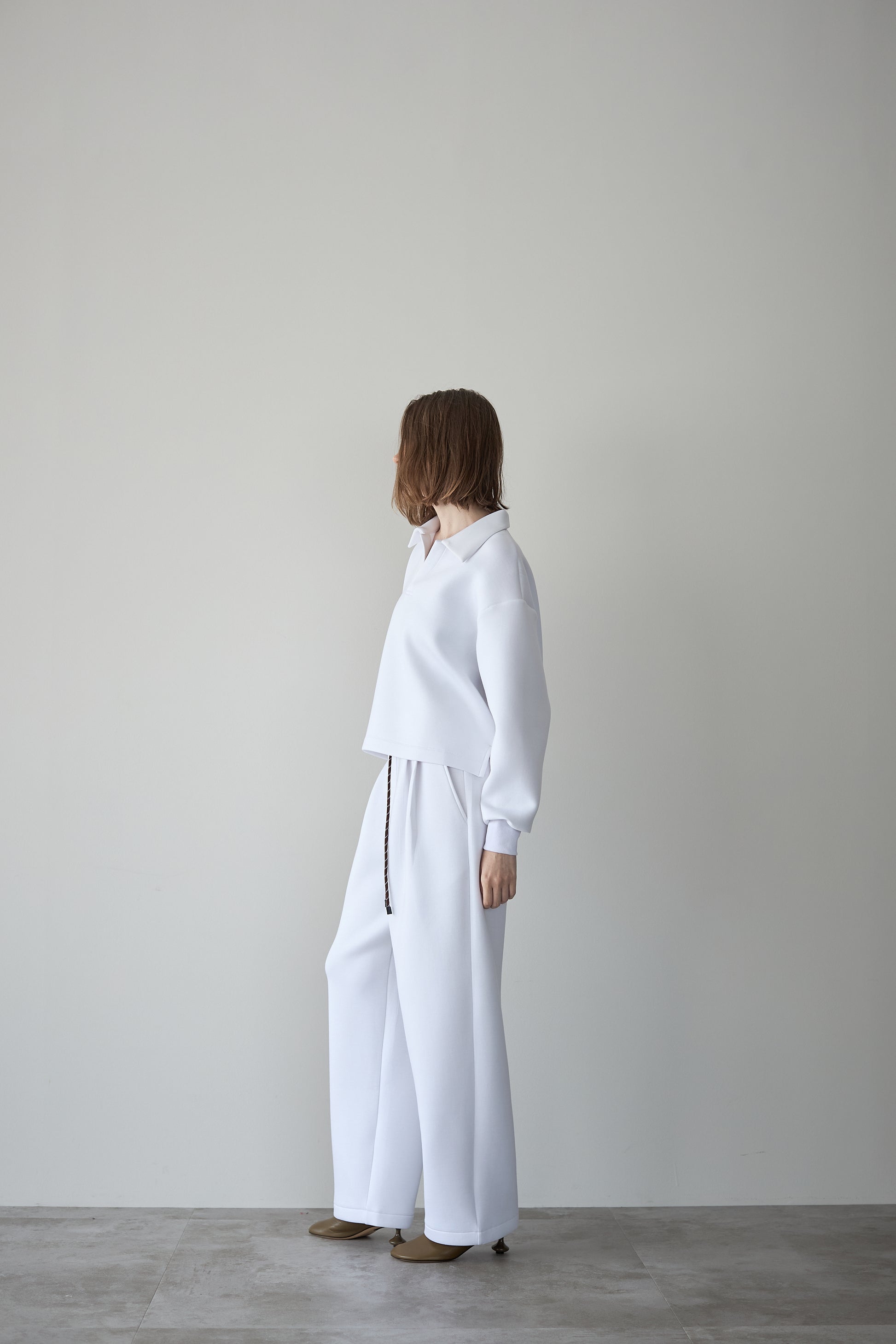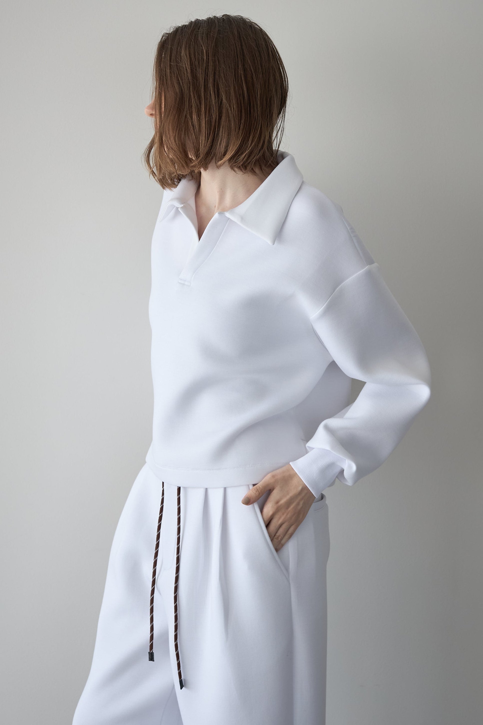 顔まわりをすっきりと見せるビッグカラーが印象的なスウェットトップス。