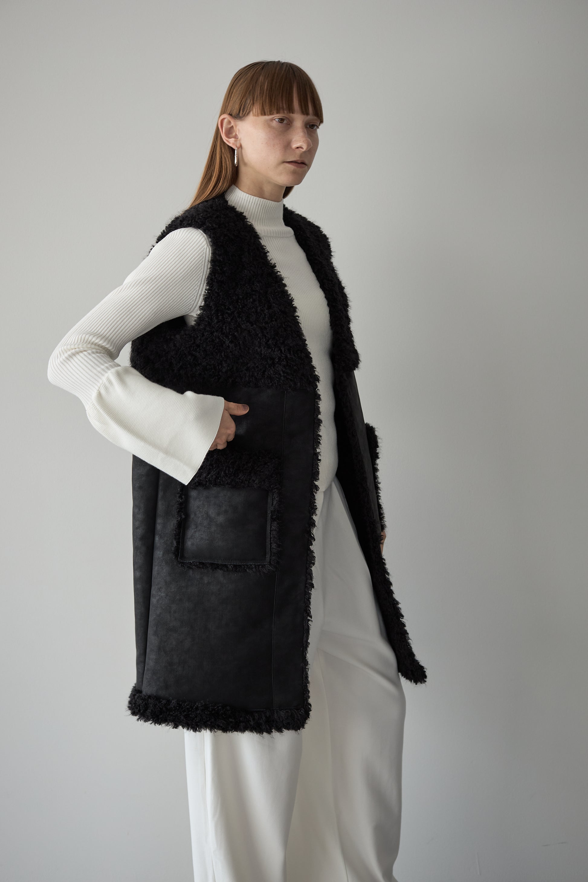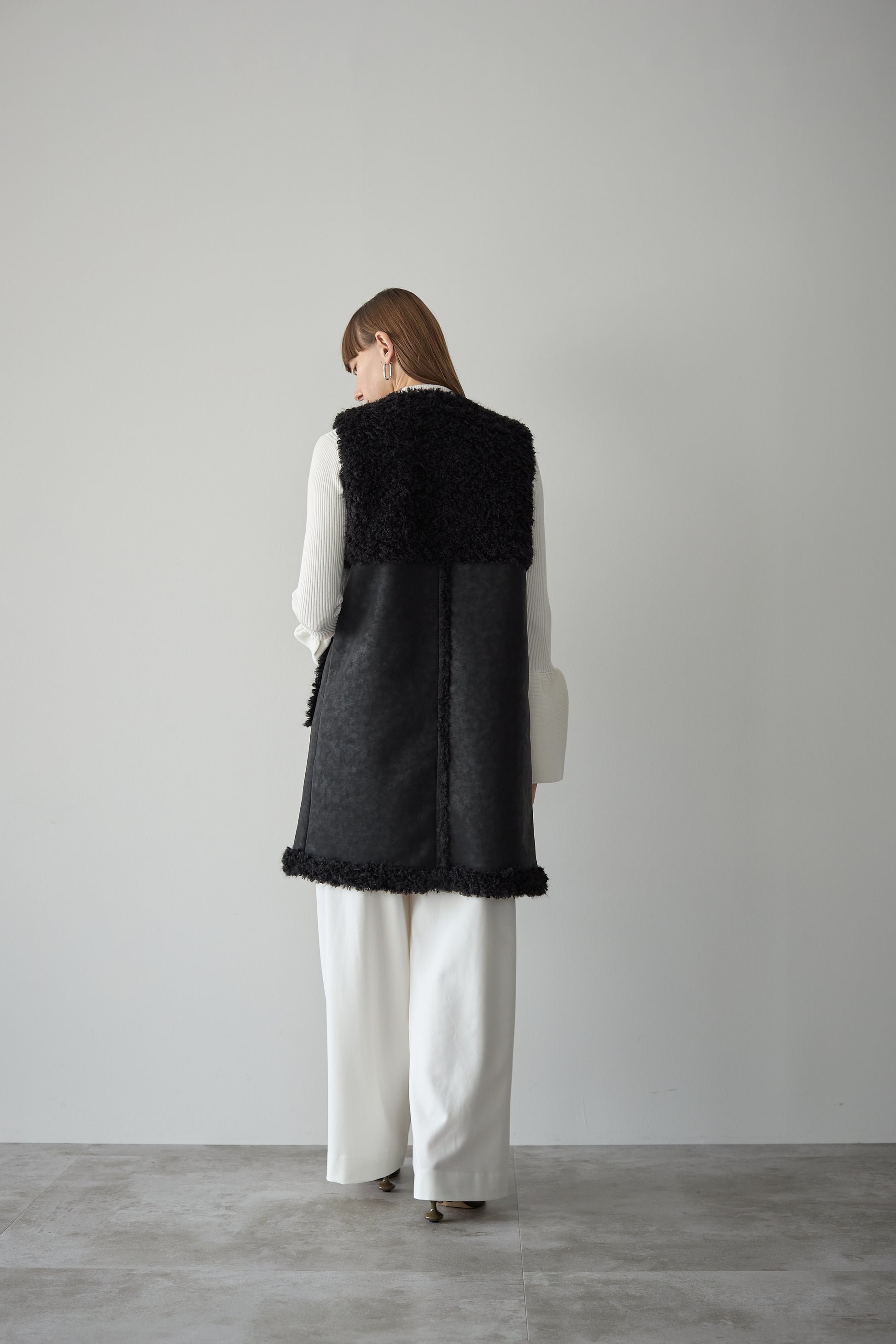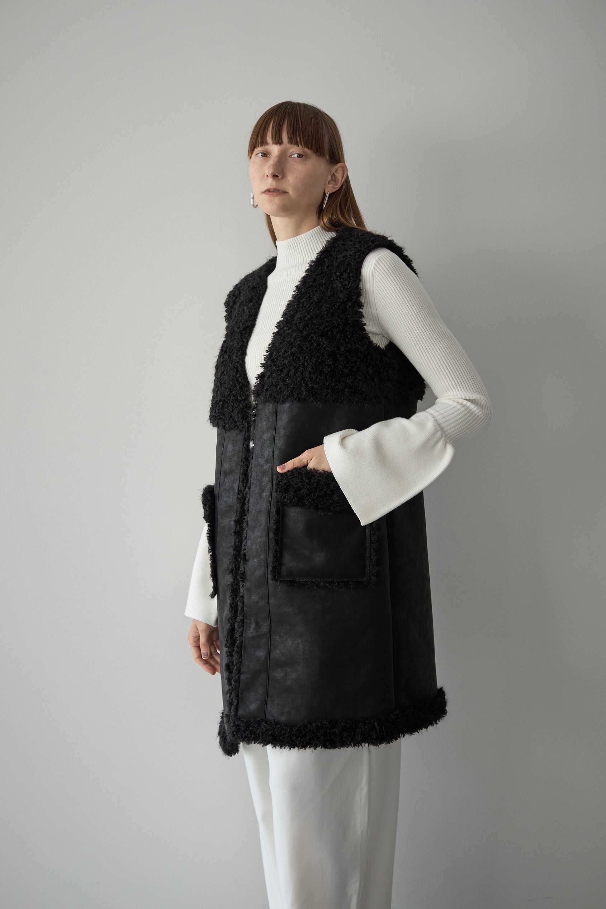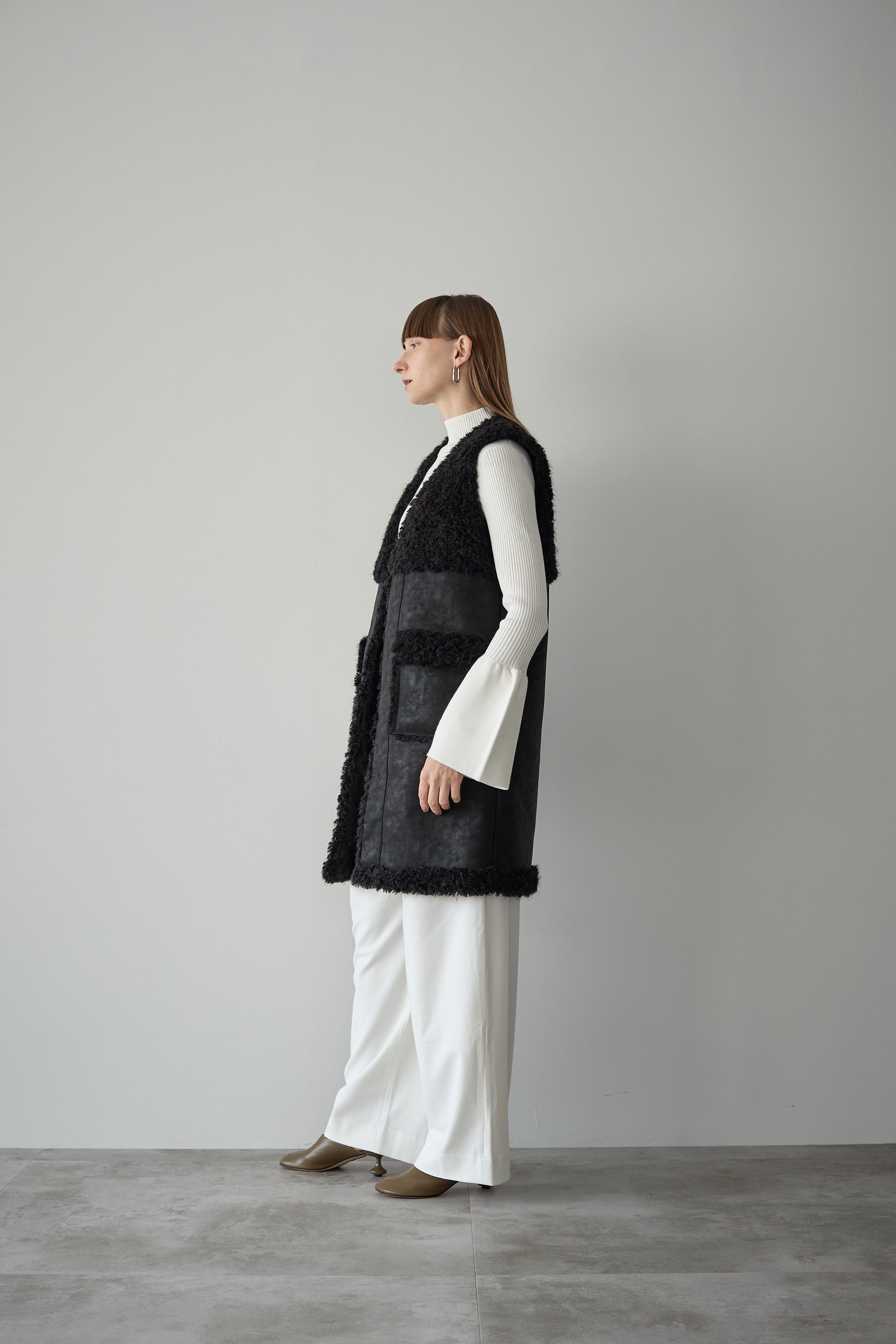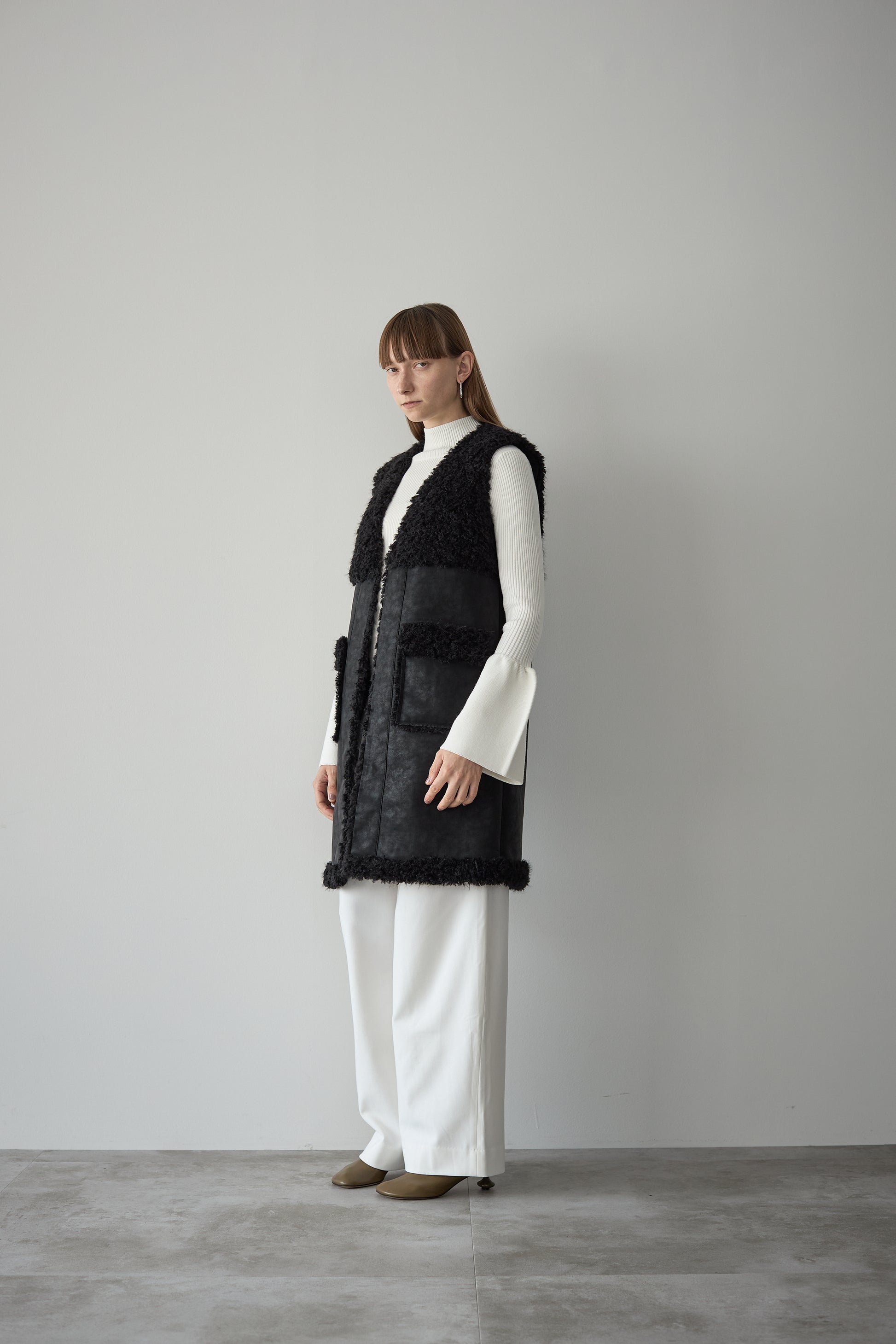 ふっくらとしたフェイクファーと滑らかなフェイクレザーを組み合わせた、上品なムートンジレ。