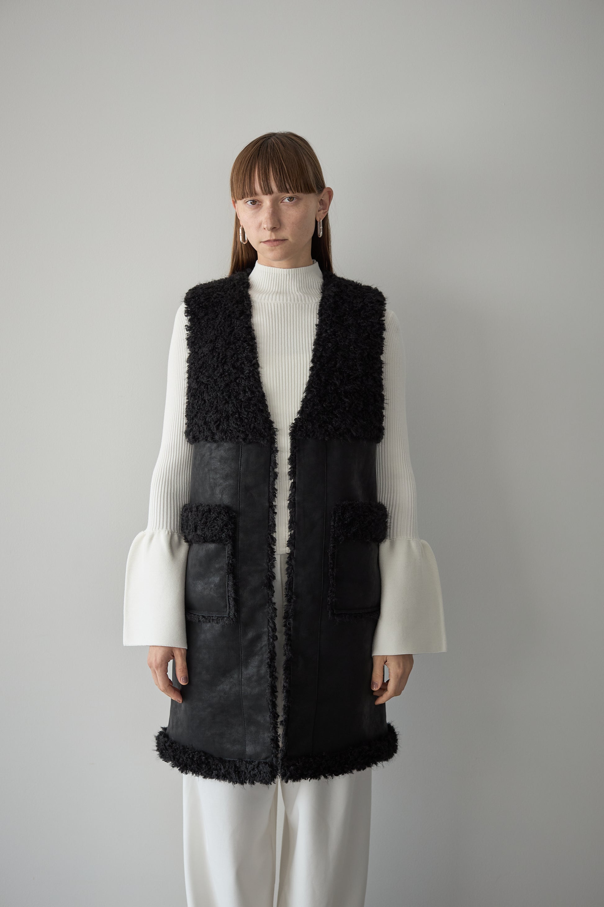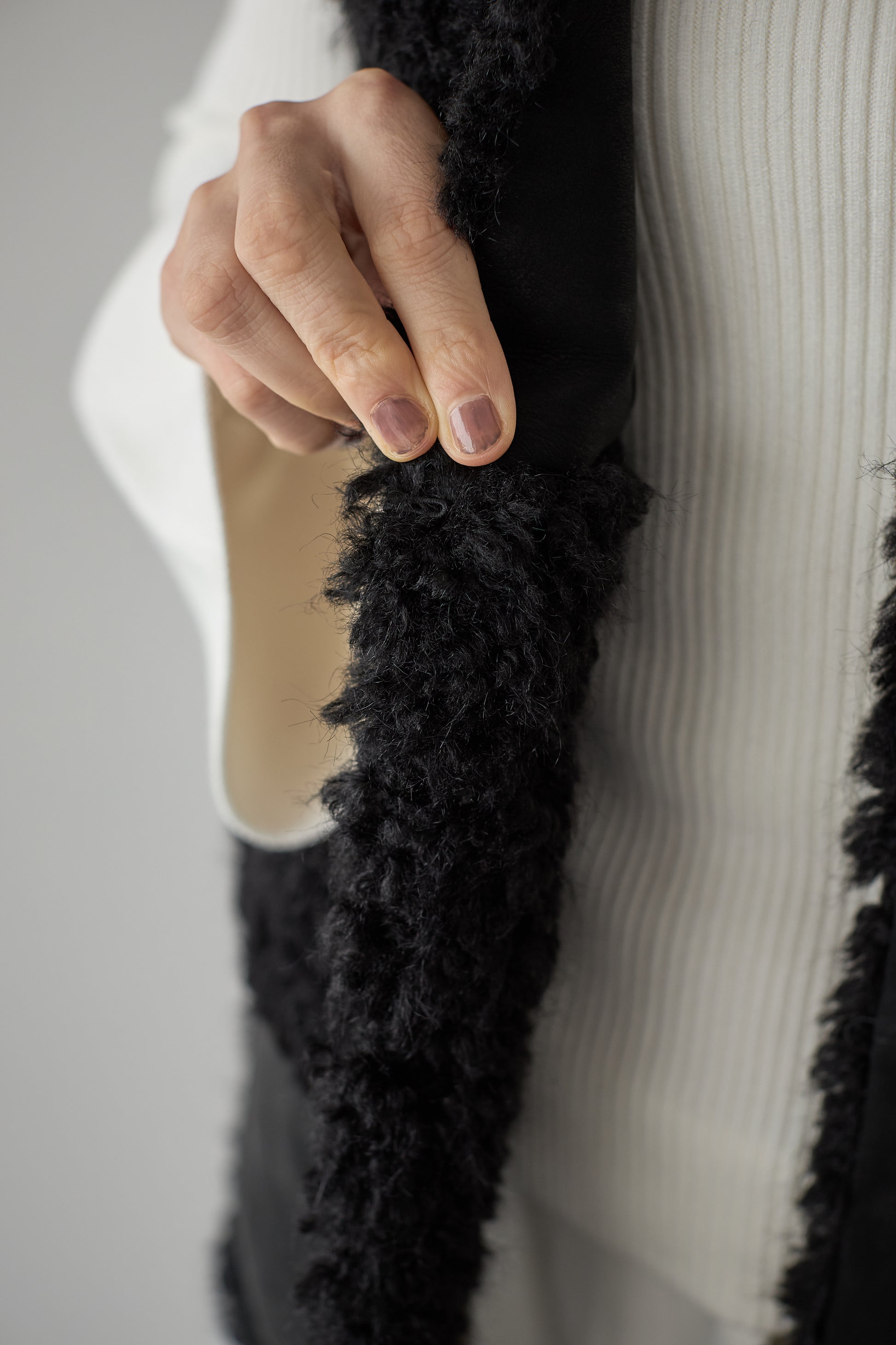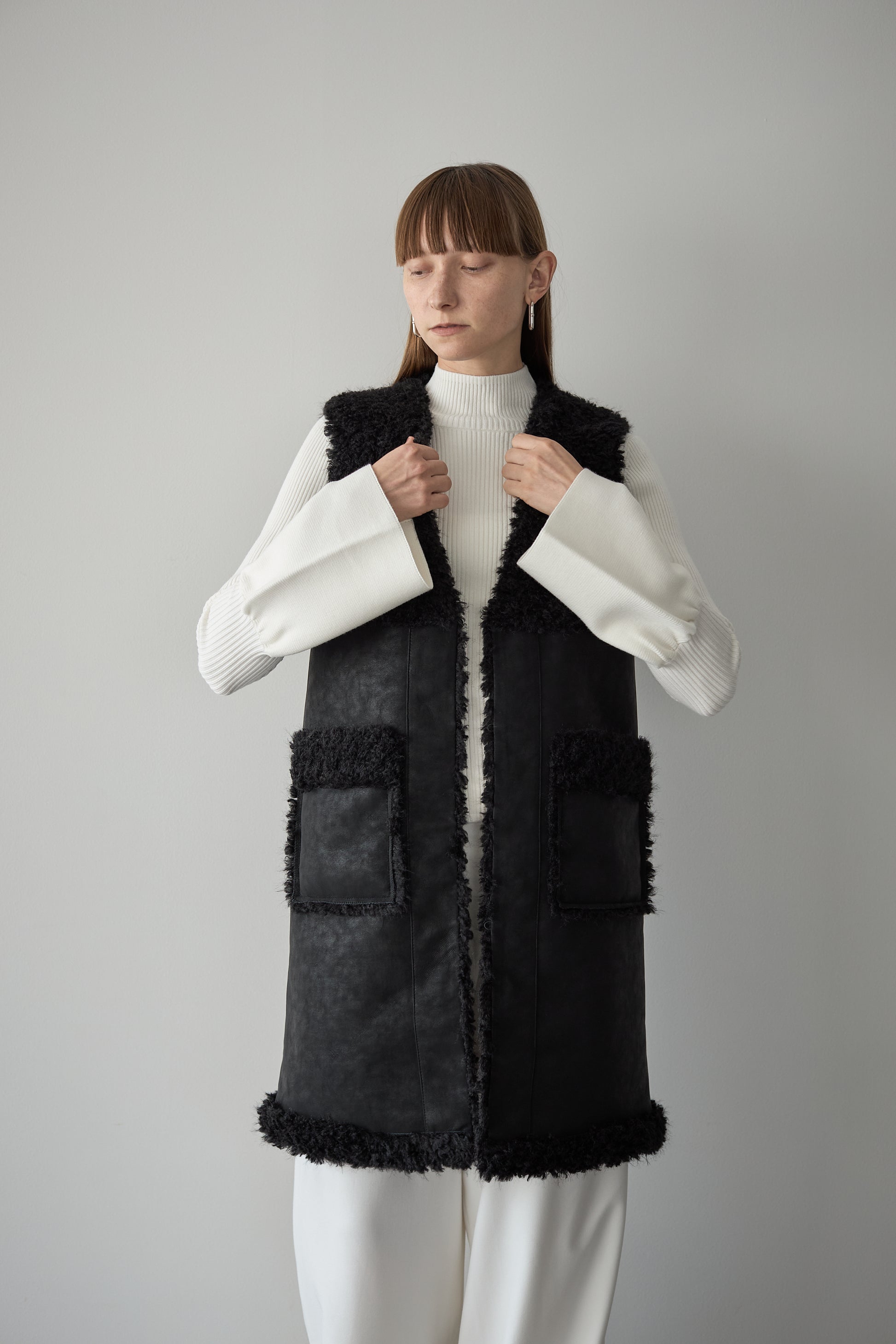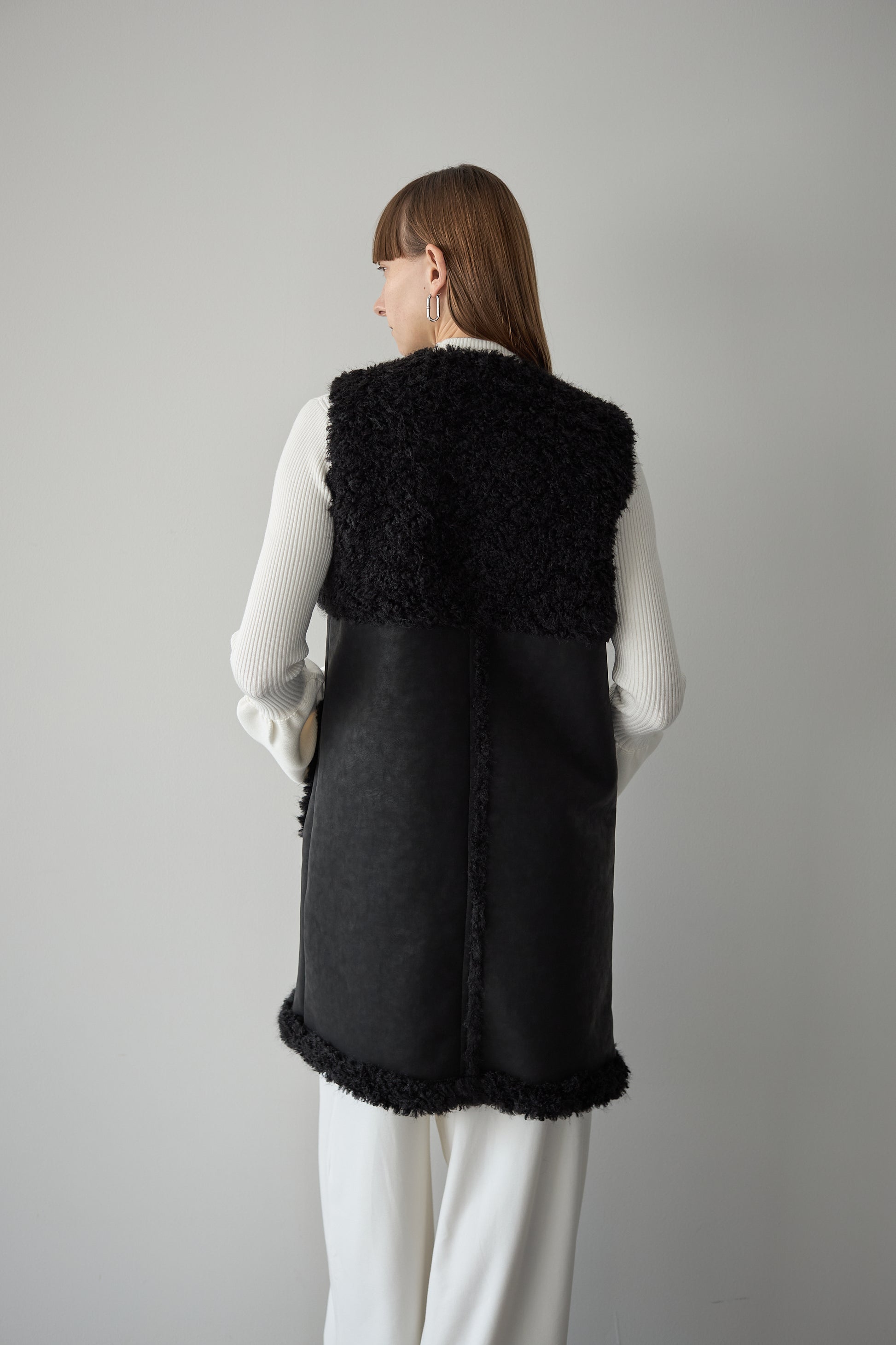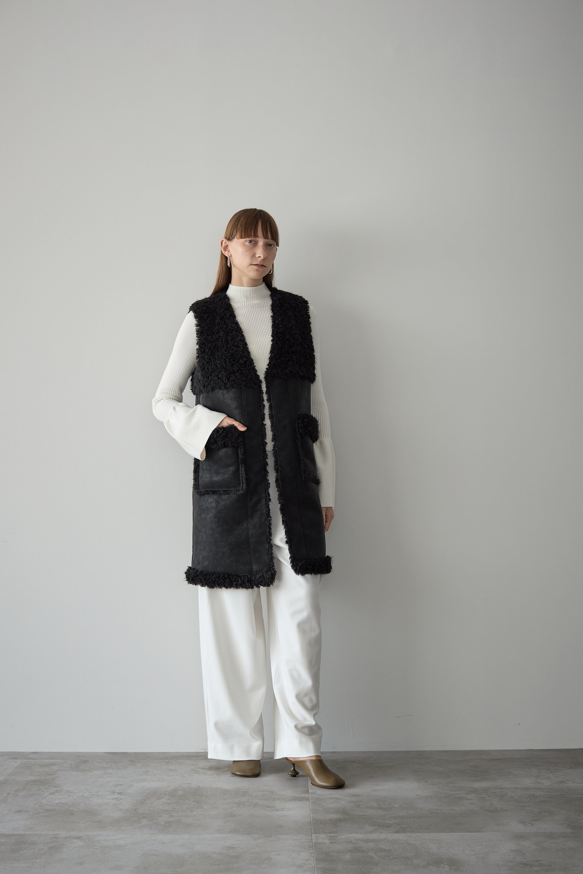 ふっくらとしたフェイクファーと滑らかなフェイクレザーを組み合わせた、上品なムートンジレ。