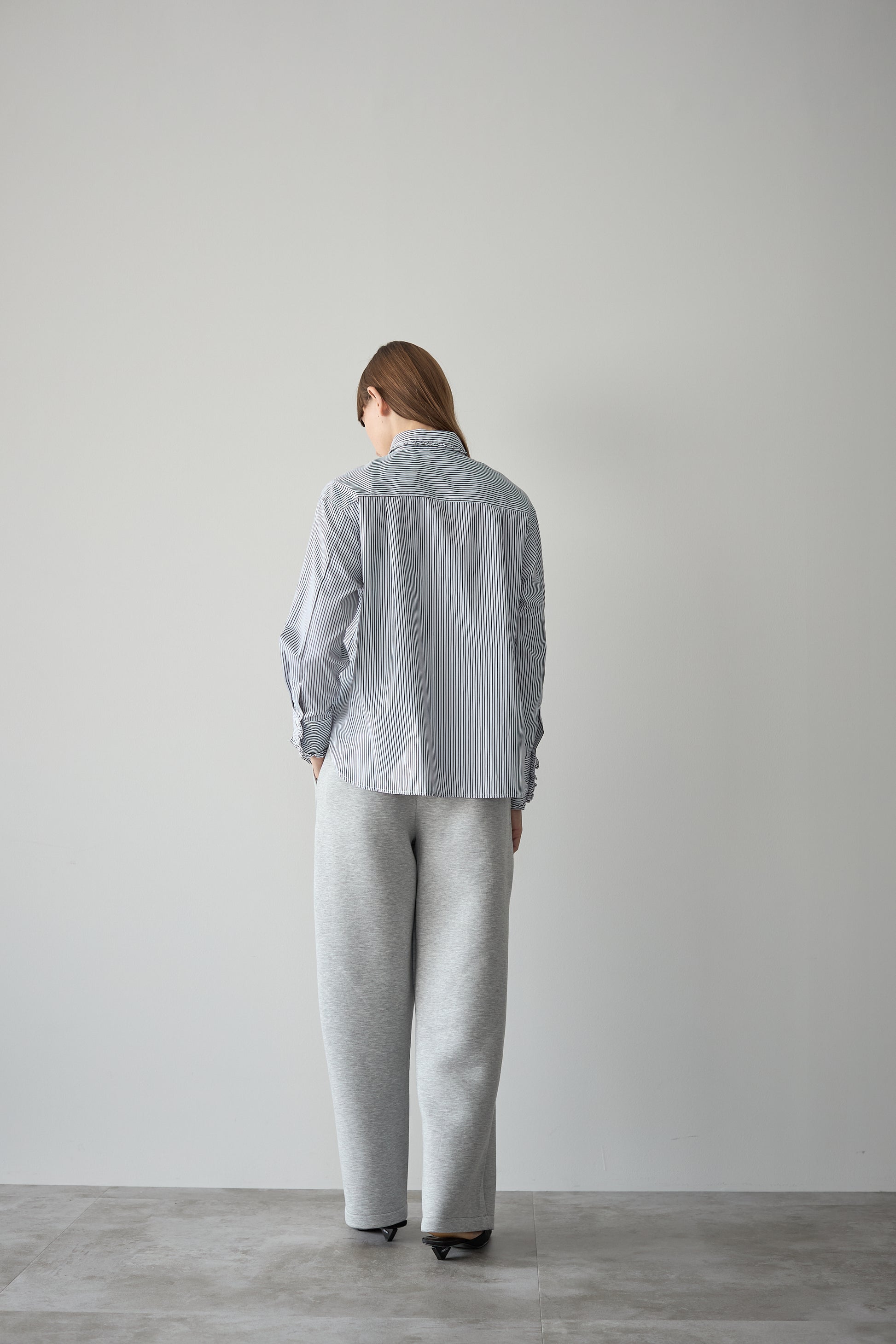 襟元とカフスにあしらわれた細やかなフリルが、シンプルなシルエットに華やかさを添えます。