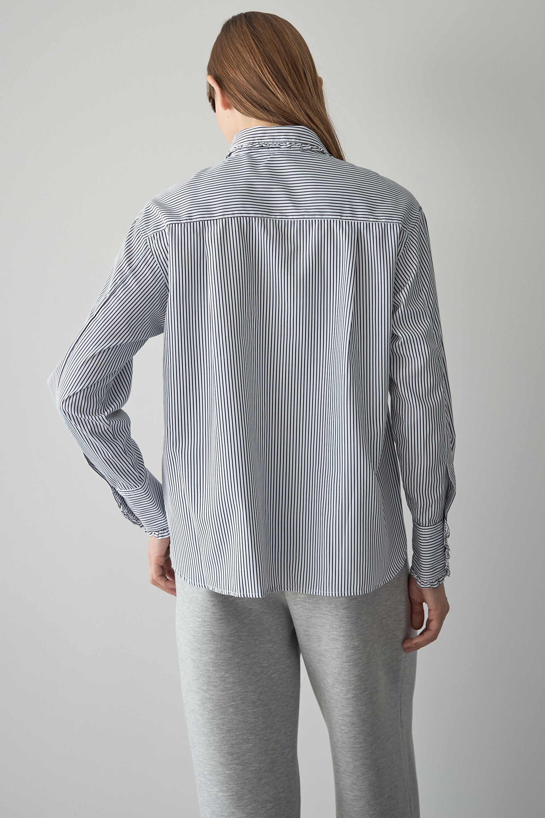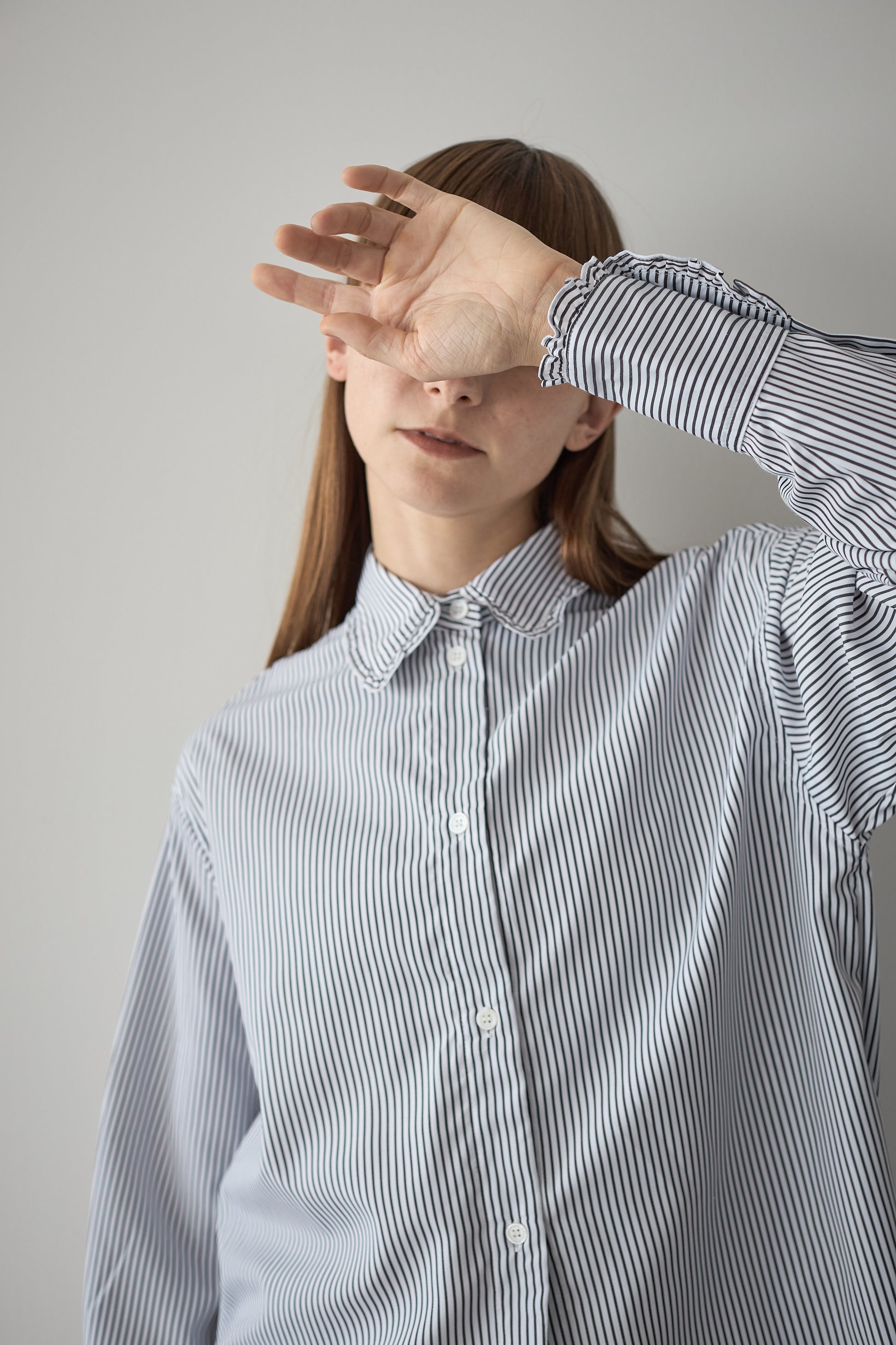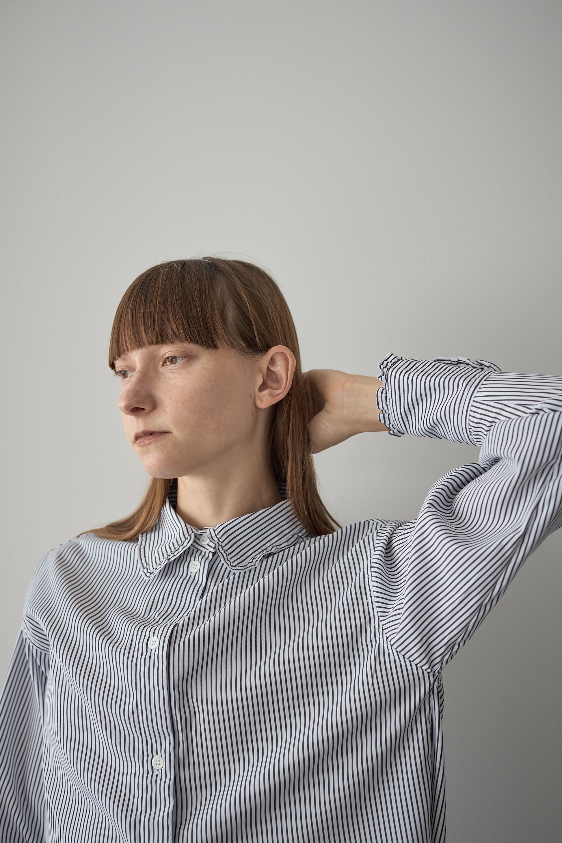 “繊細なフリルが際立つ、クラシカルな雰囲気のフリルカラーシャツ”
