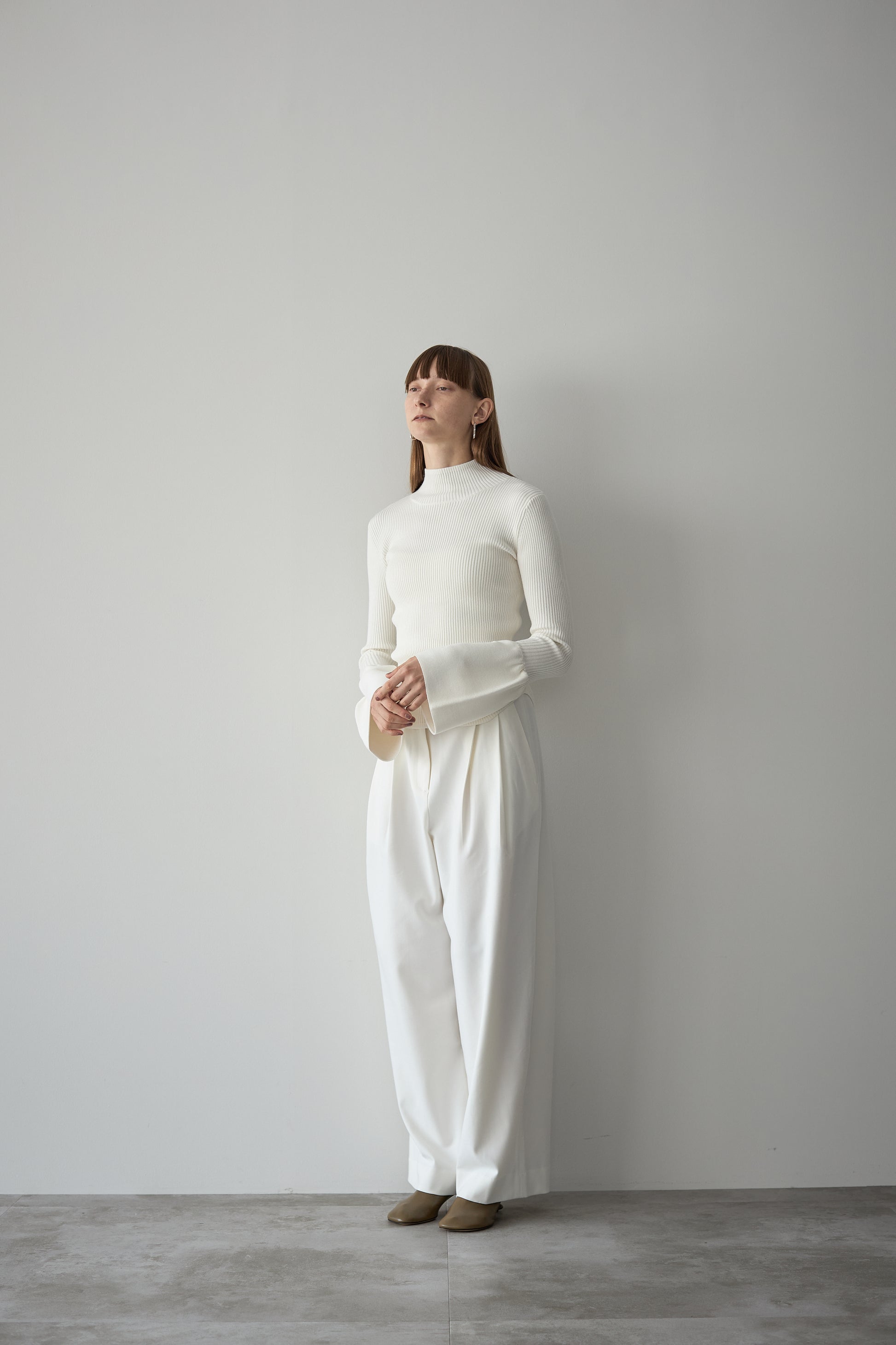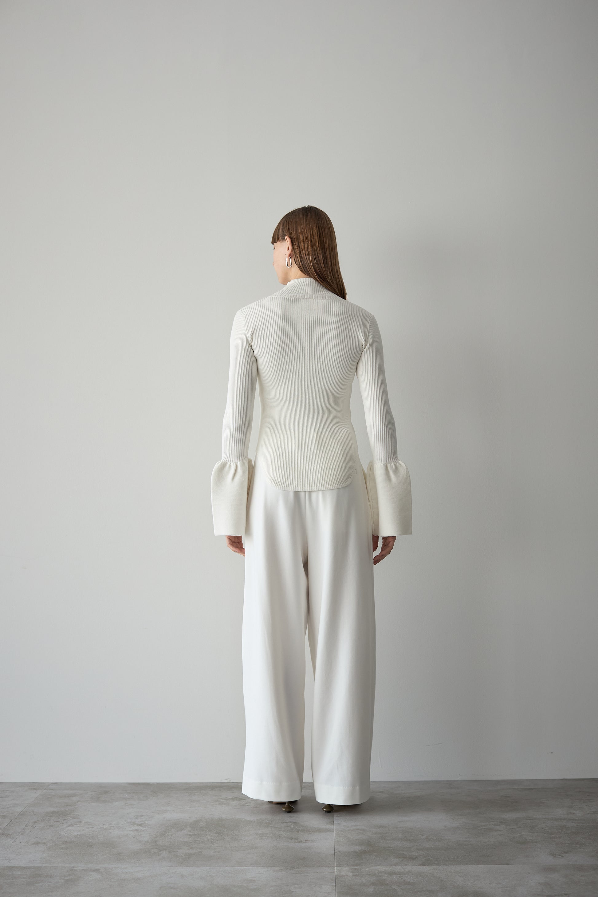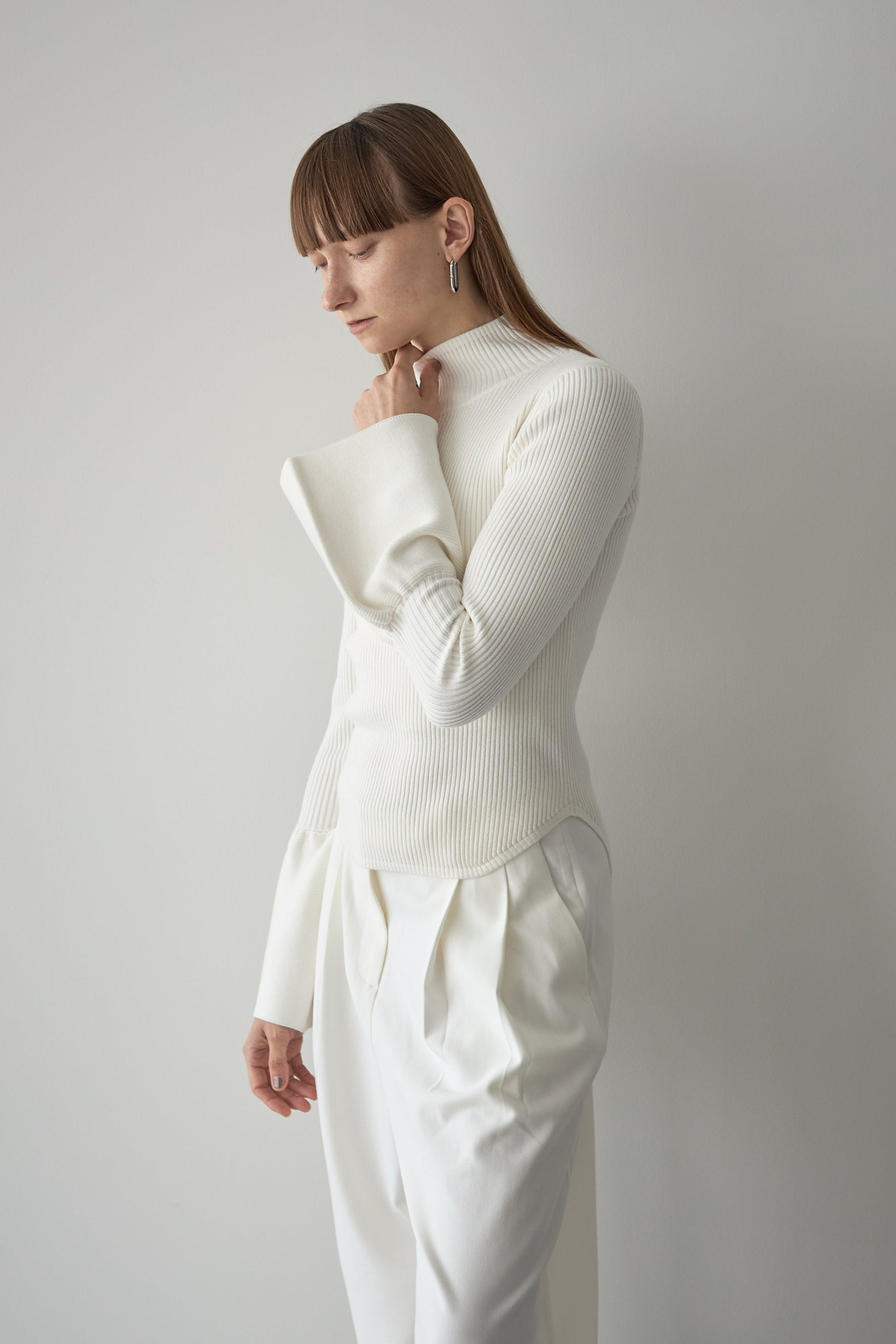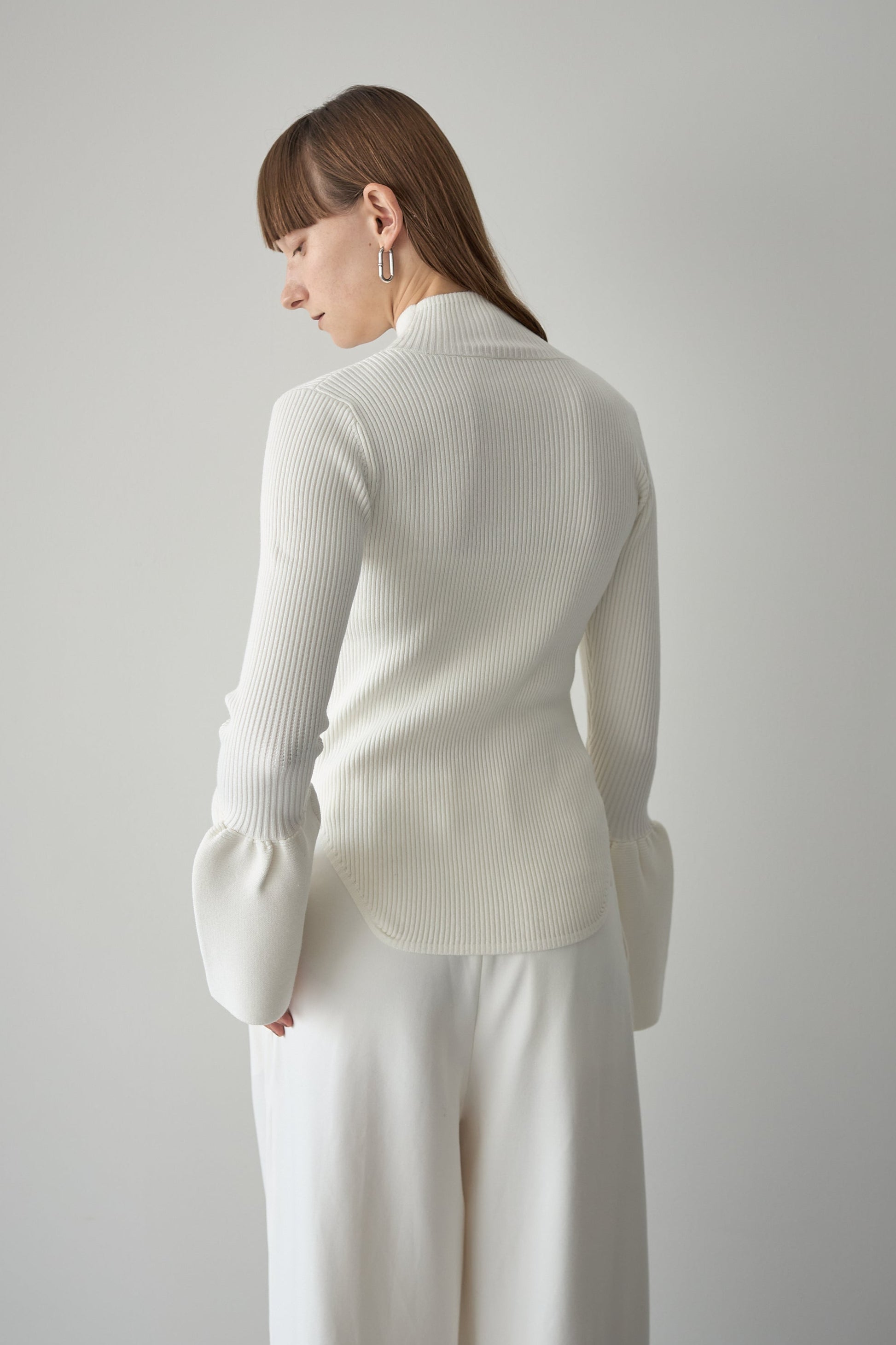 ベーシックなリブニットの上品さをベースにしながらも、袖のデザインがスタイリングに華やかさをプラスします。