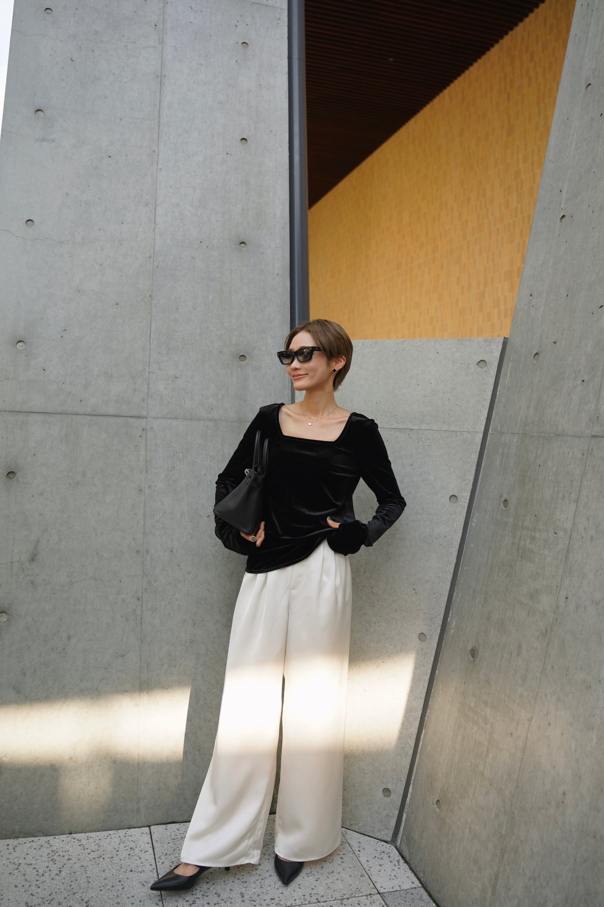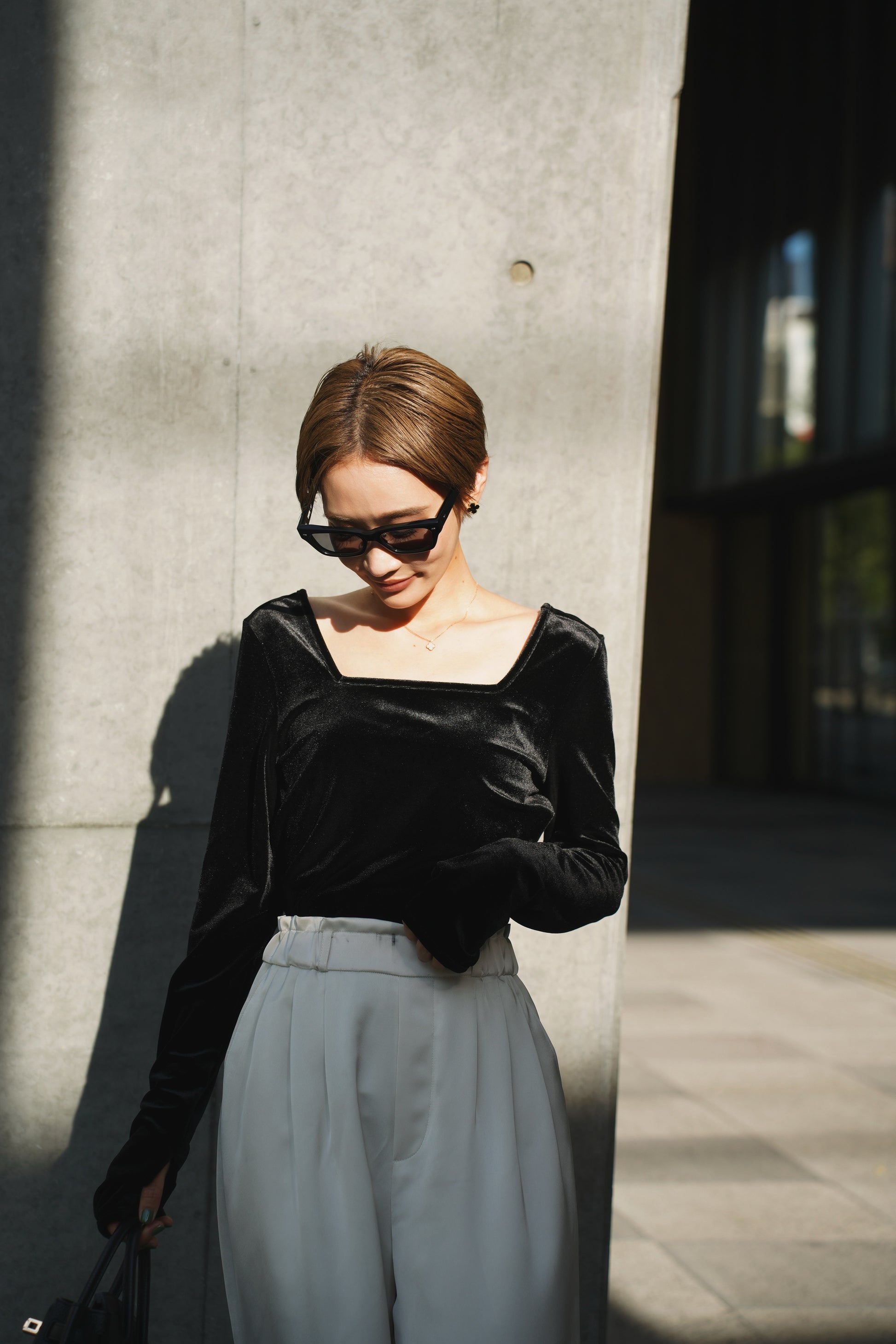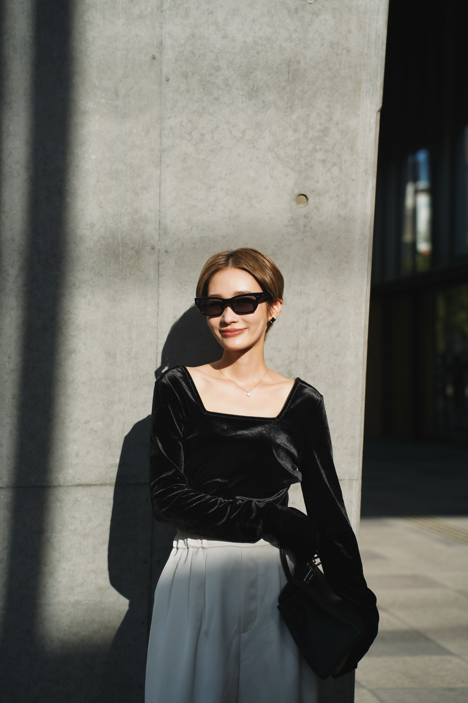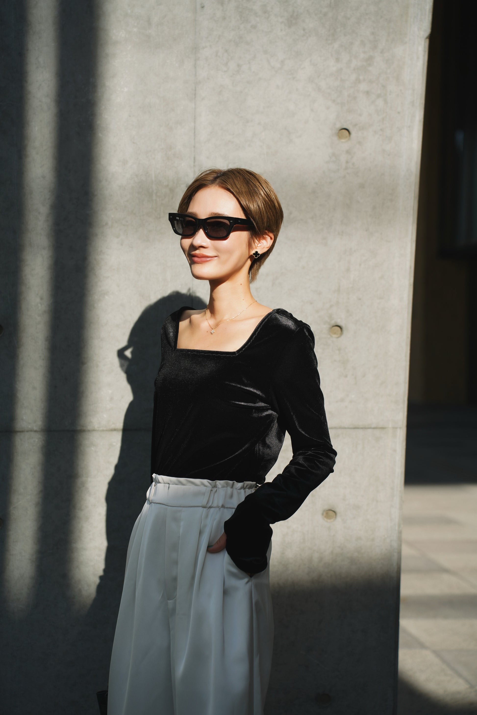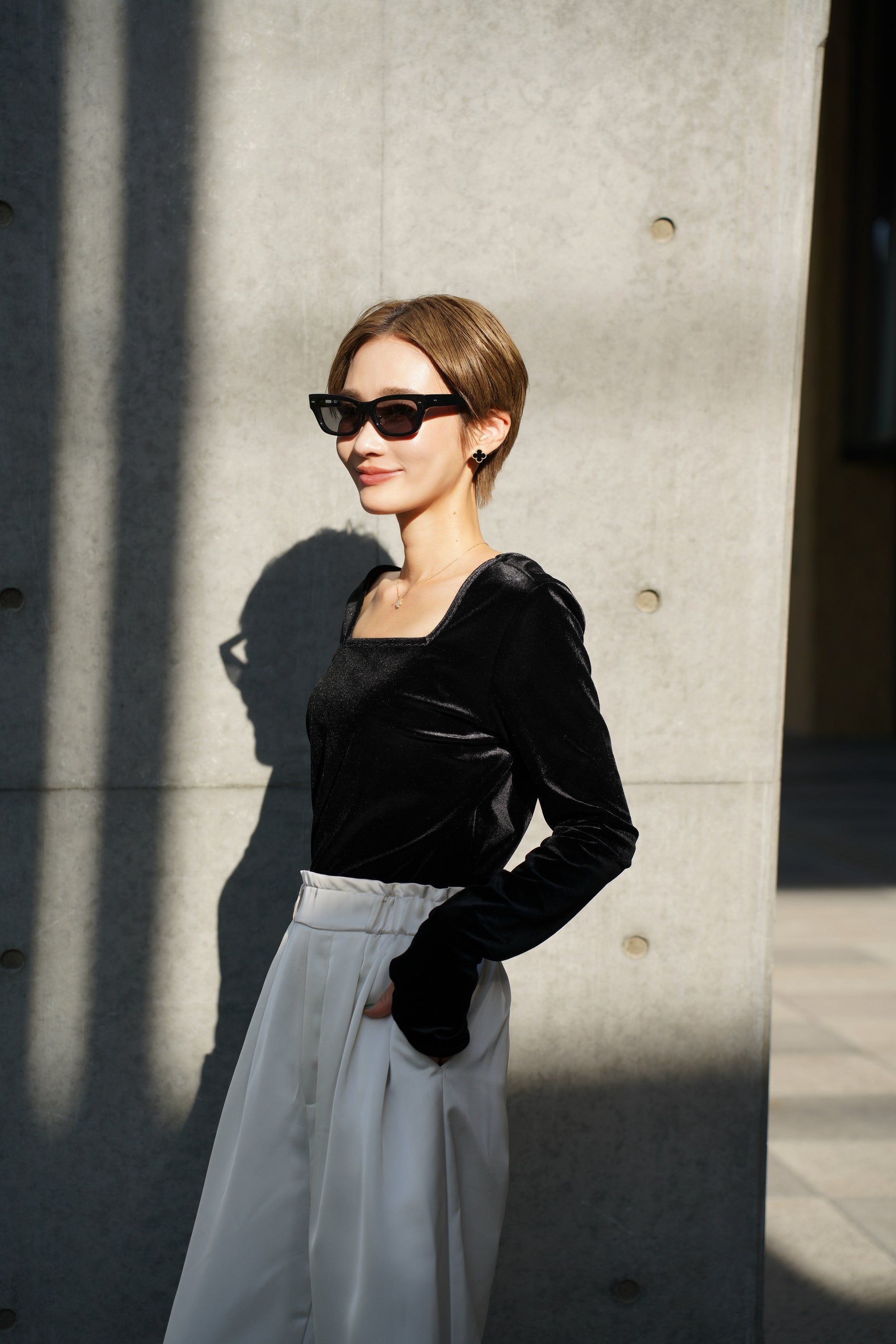 柔らかく伸縮性のあるベロア素材を使用し、上品な光沢がスタイリングを引き立てる一枚。