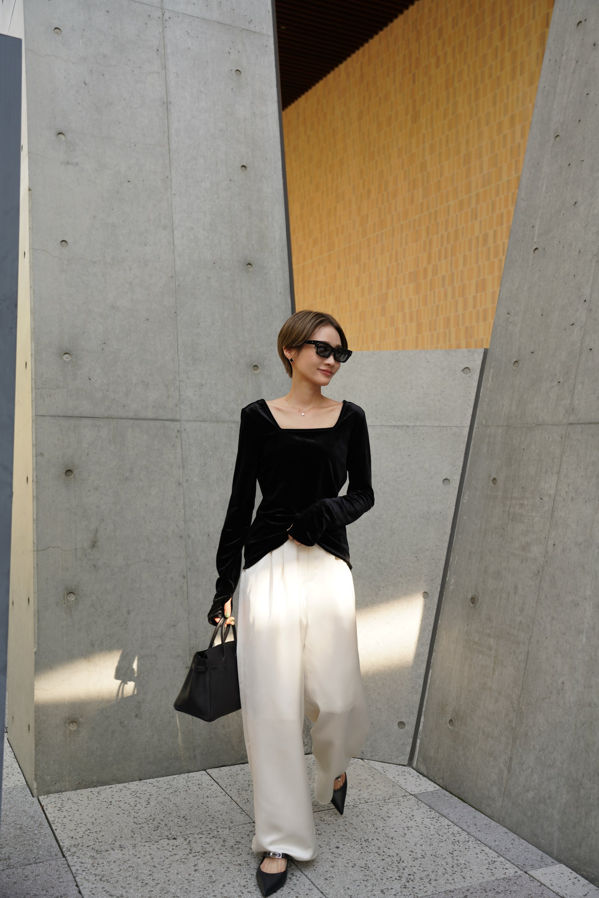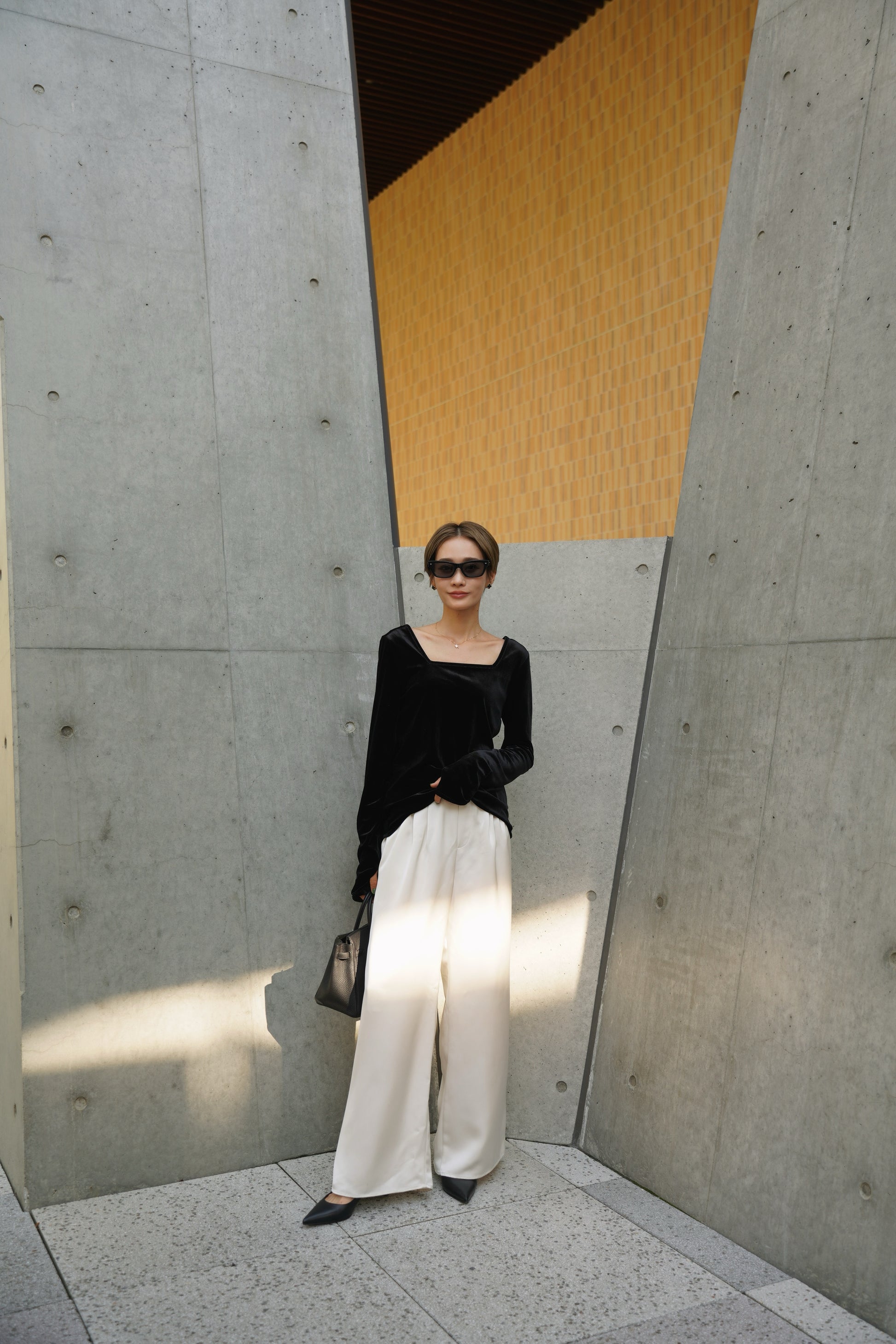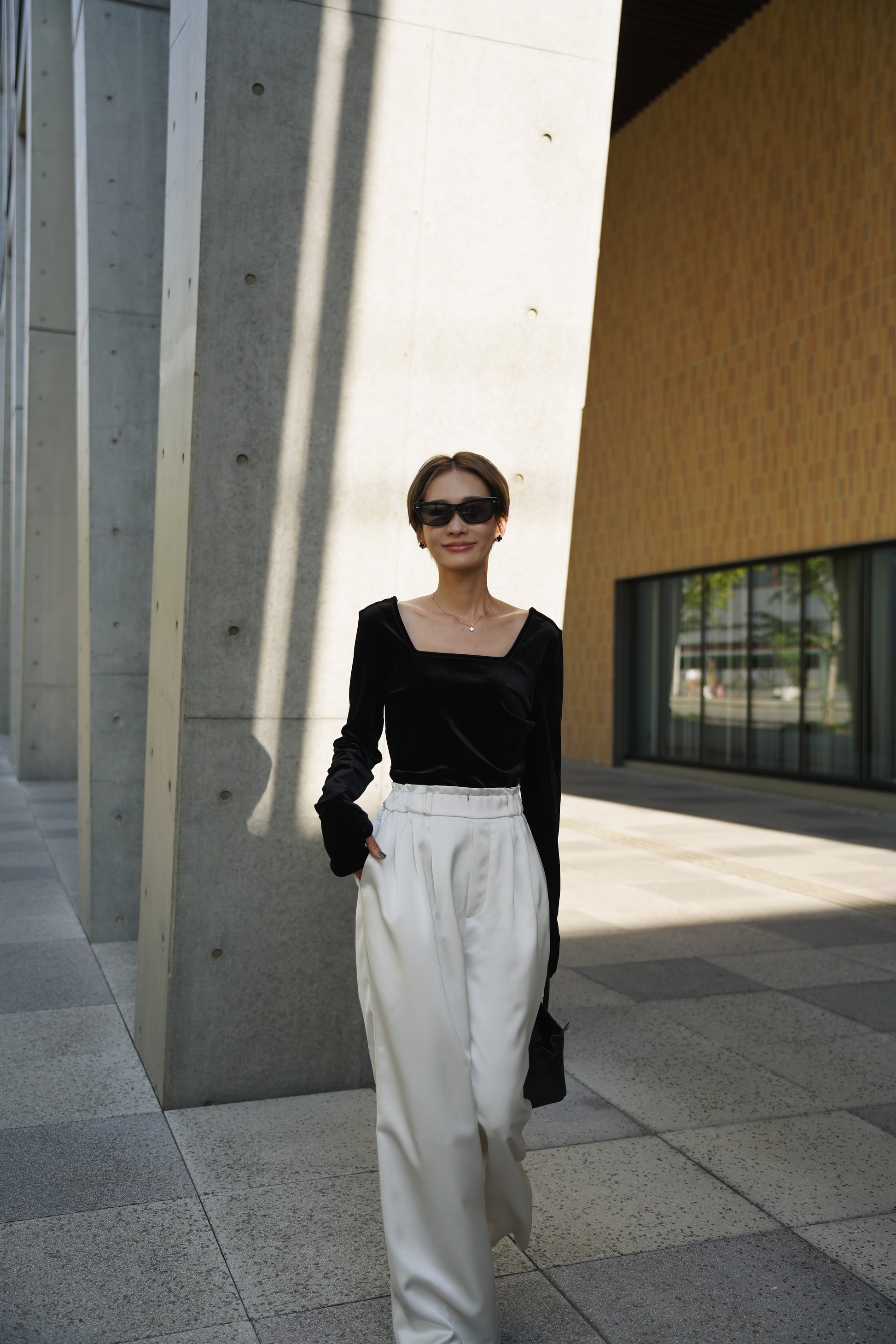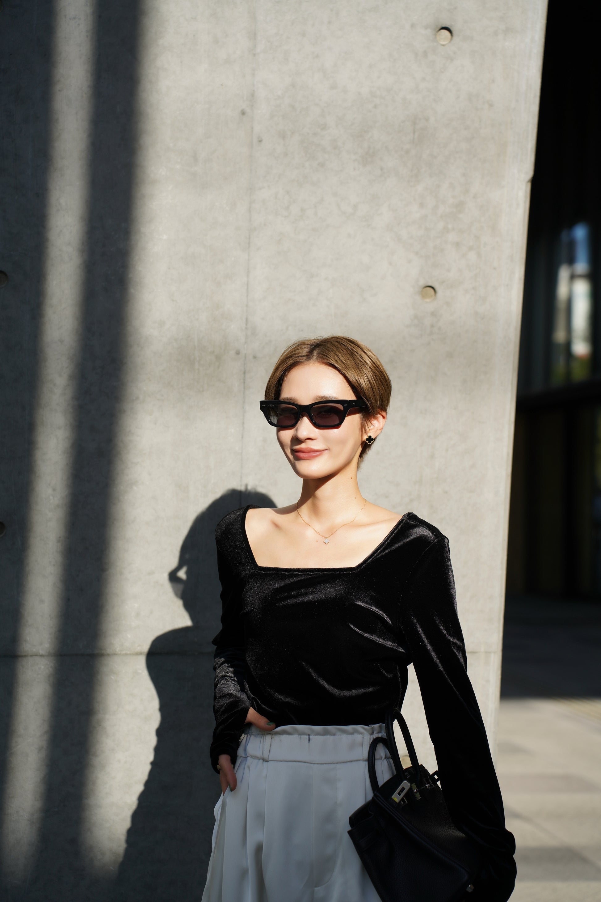 柔らかく伸縮性のあるベロア素材を使用し、上品な光沢がスタイリングを引き立てる一枚。