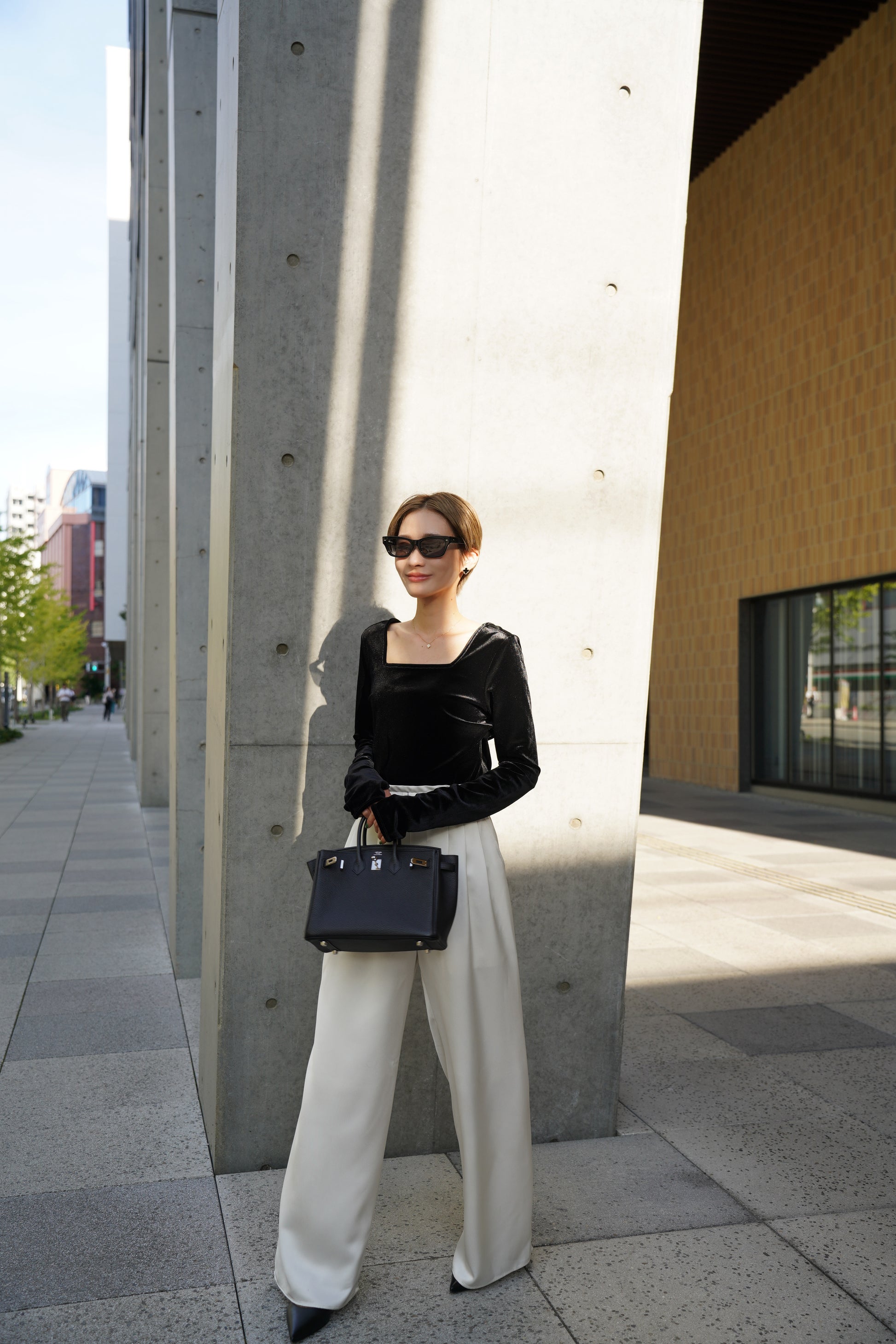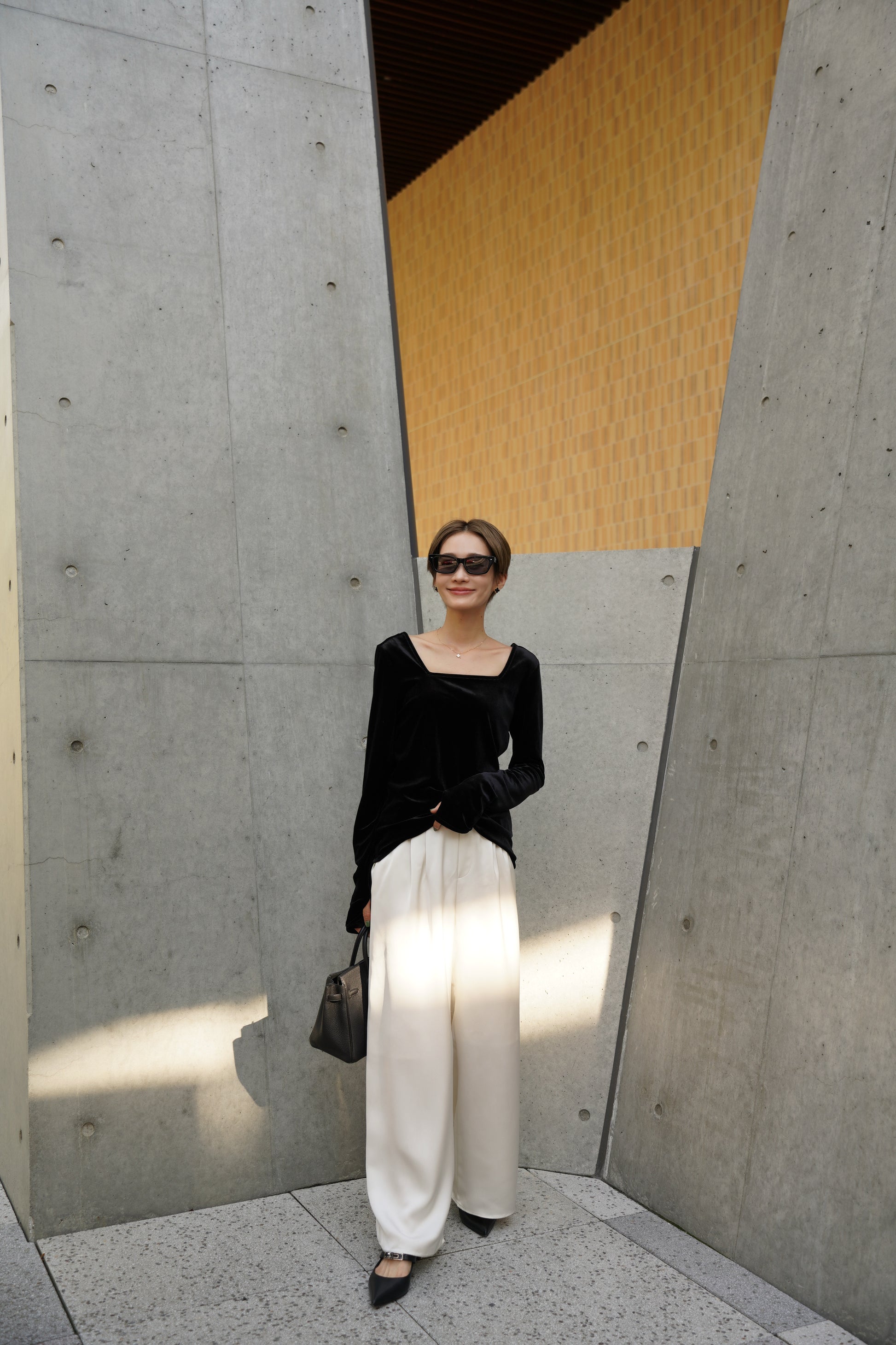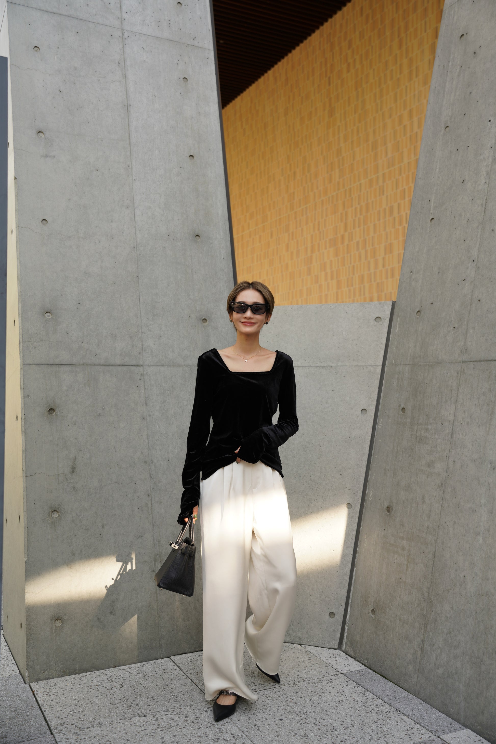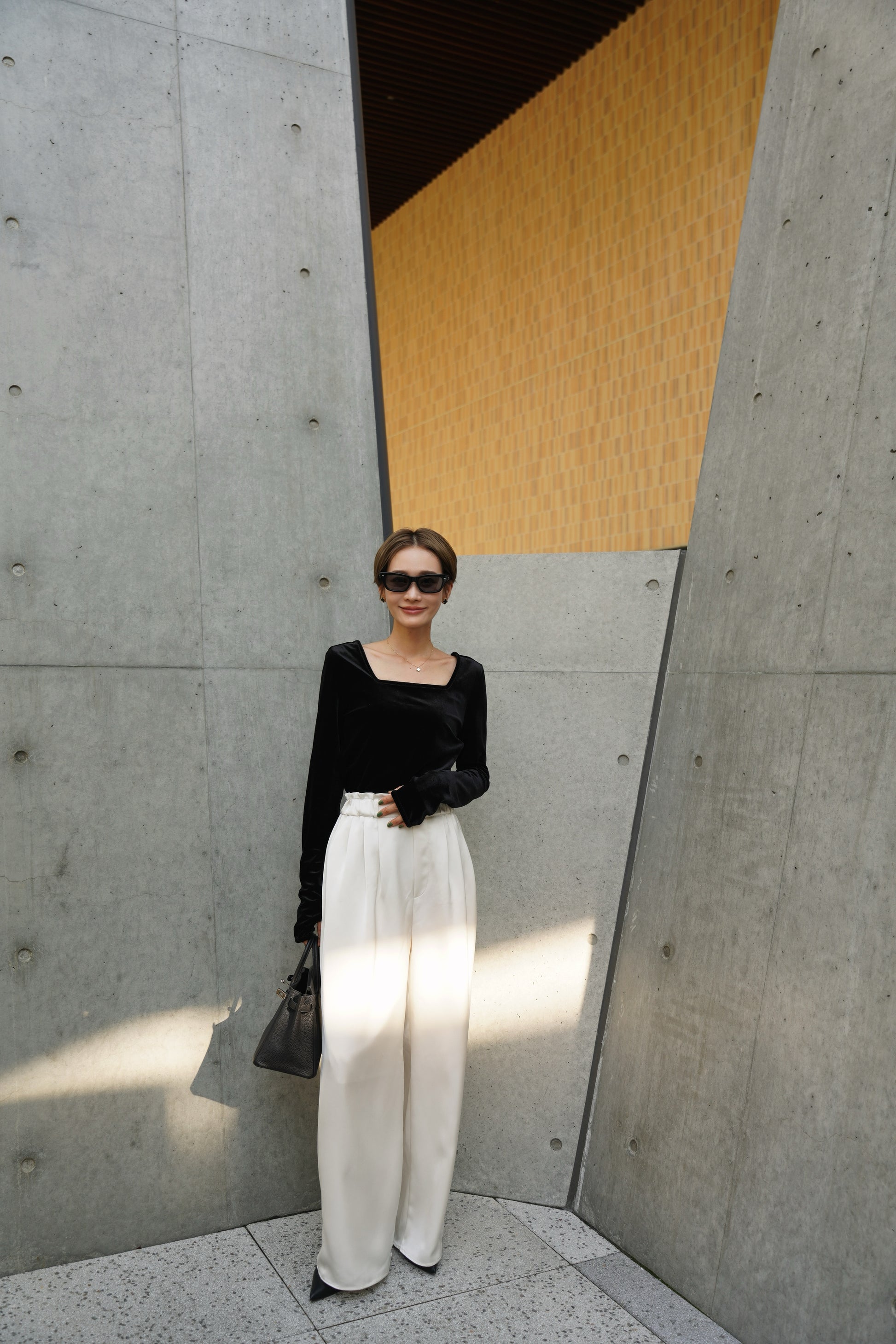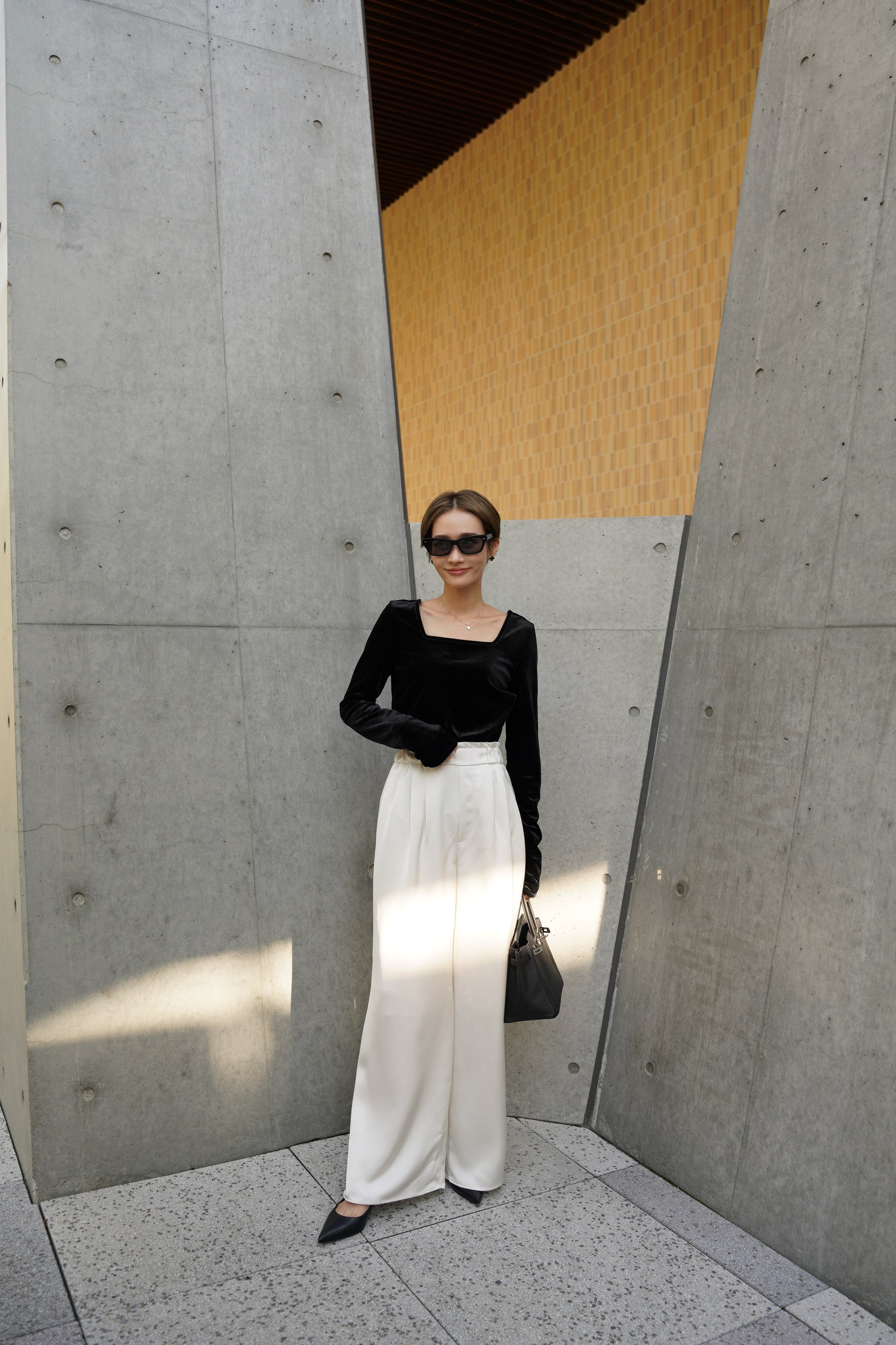 柔らかく伸縮性のあるベロア素材を使用し、上品な光沢がスタイリングを引き立てる一枚。