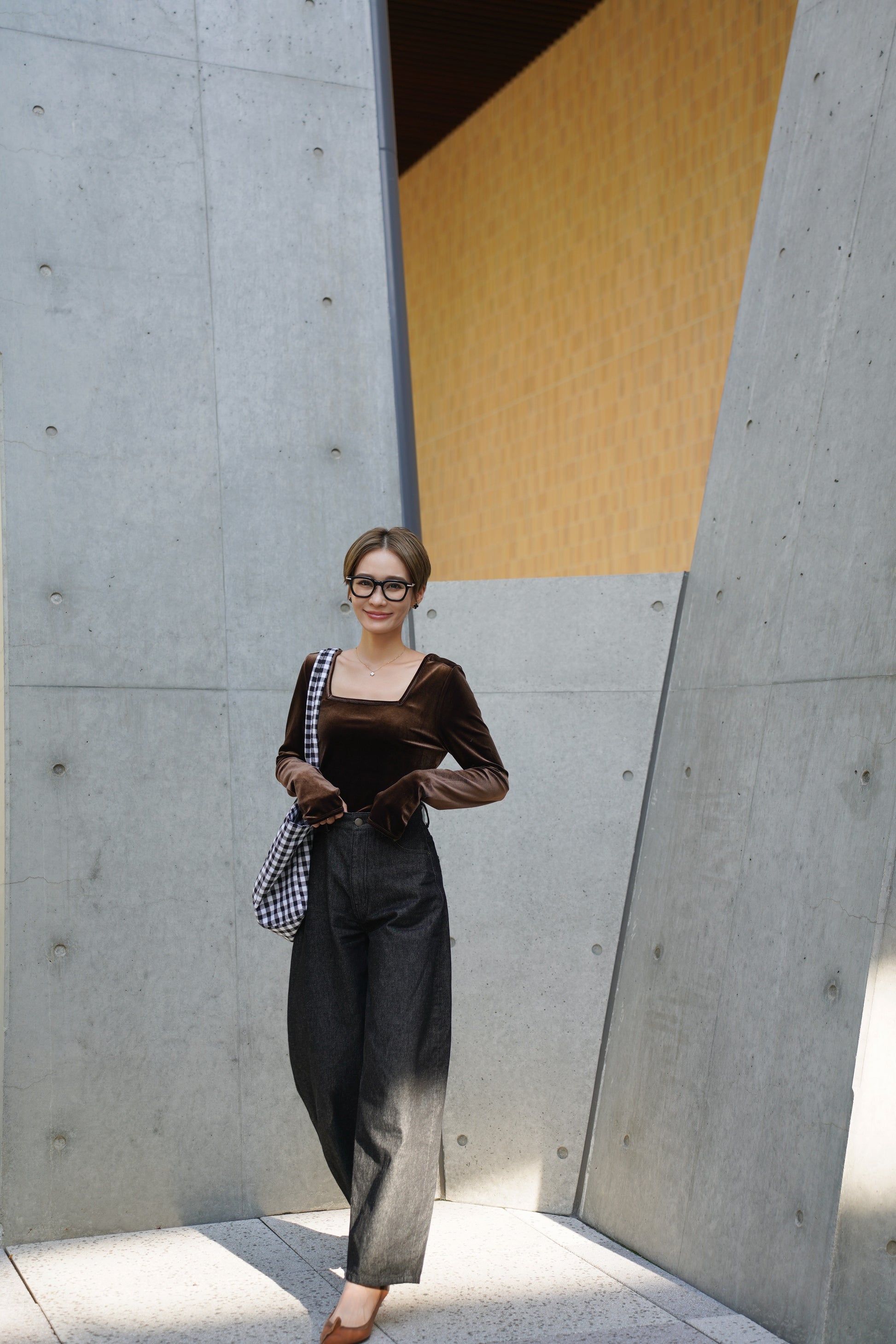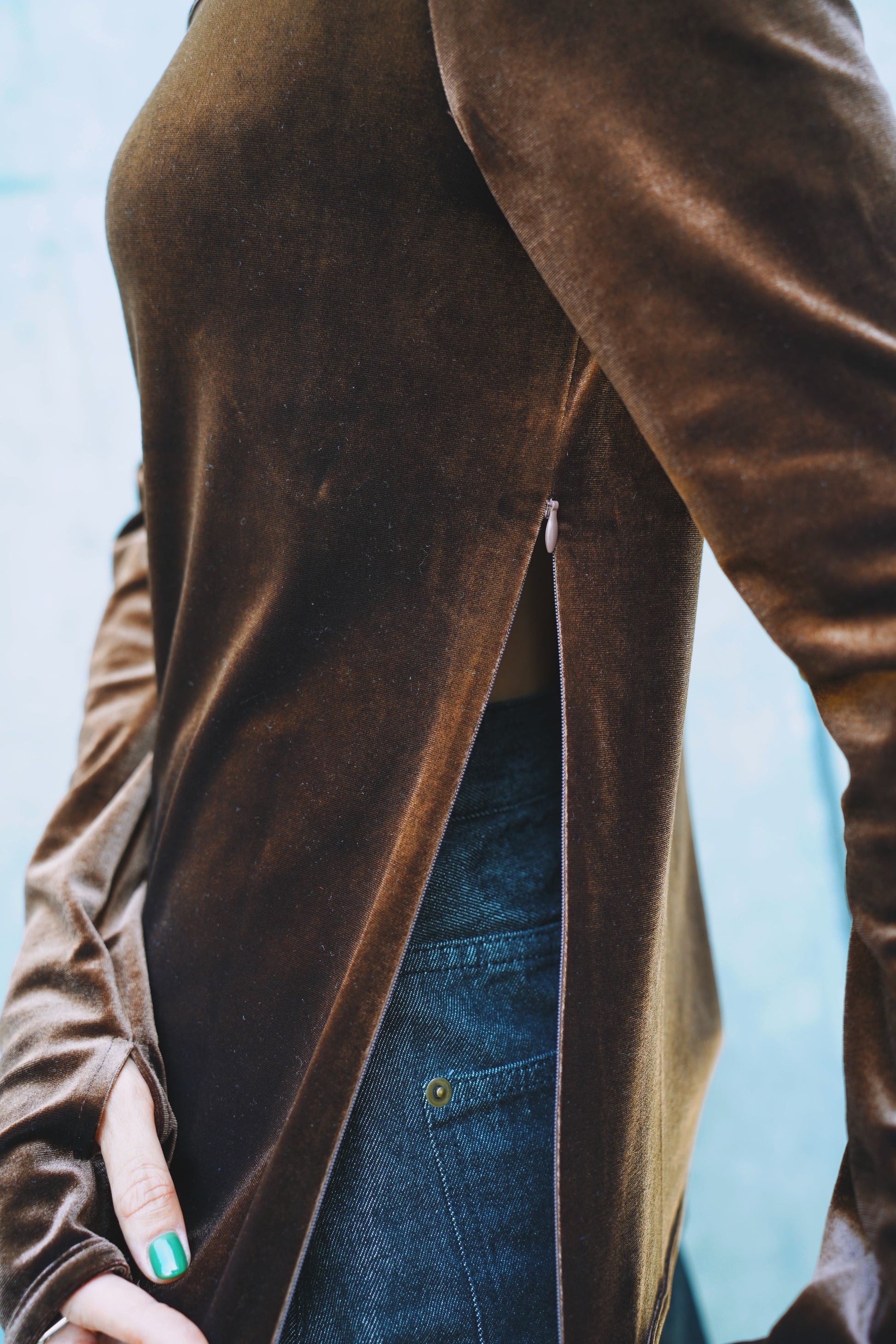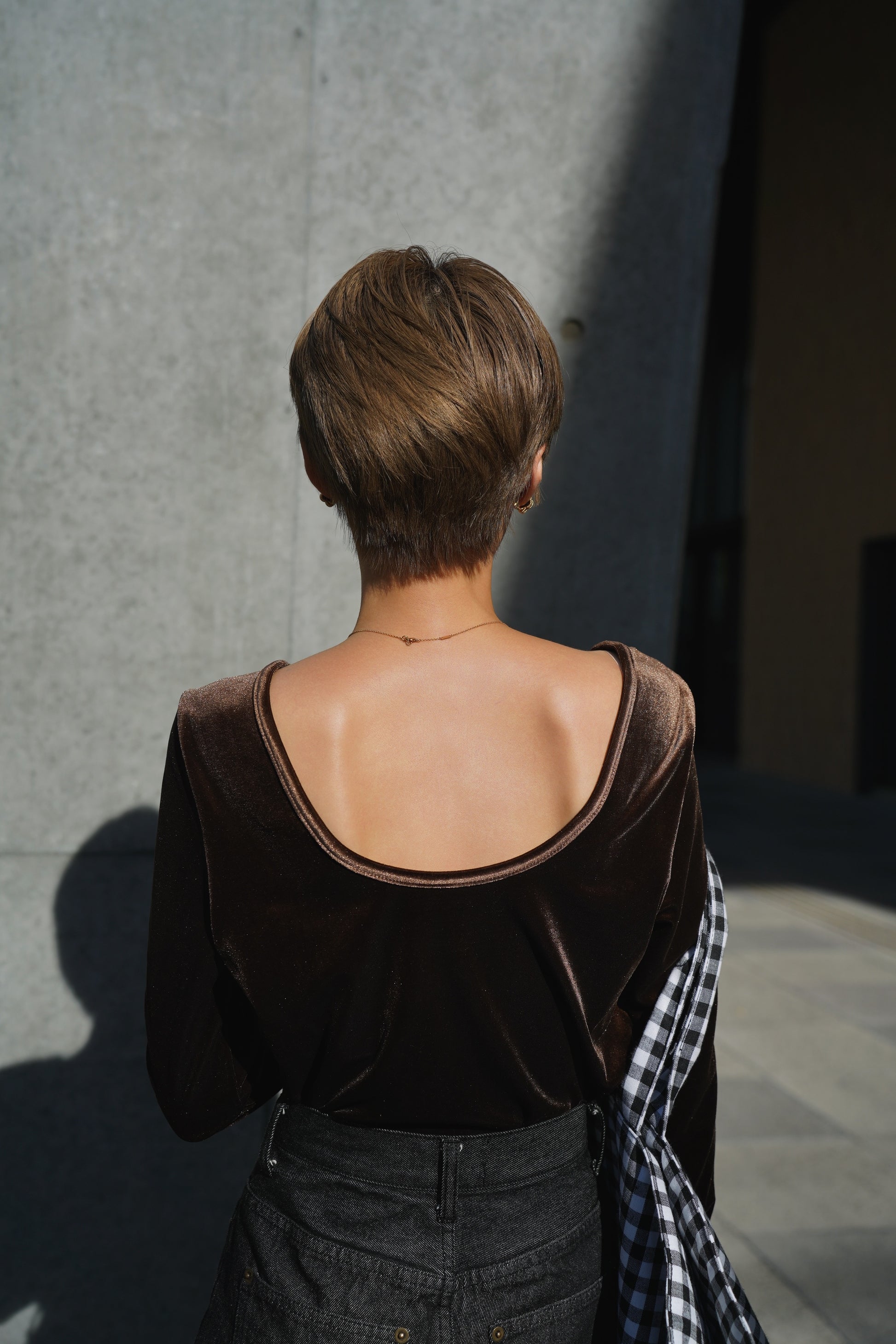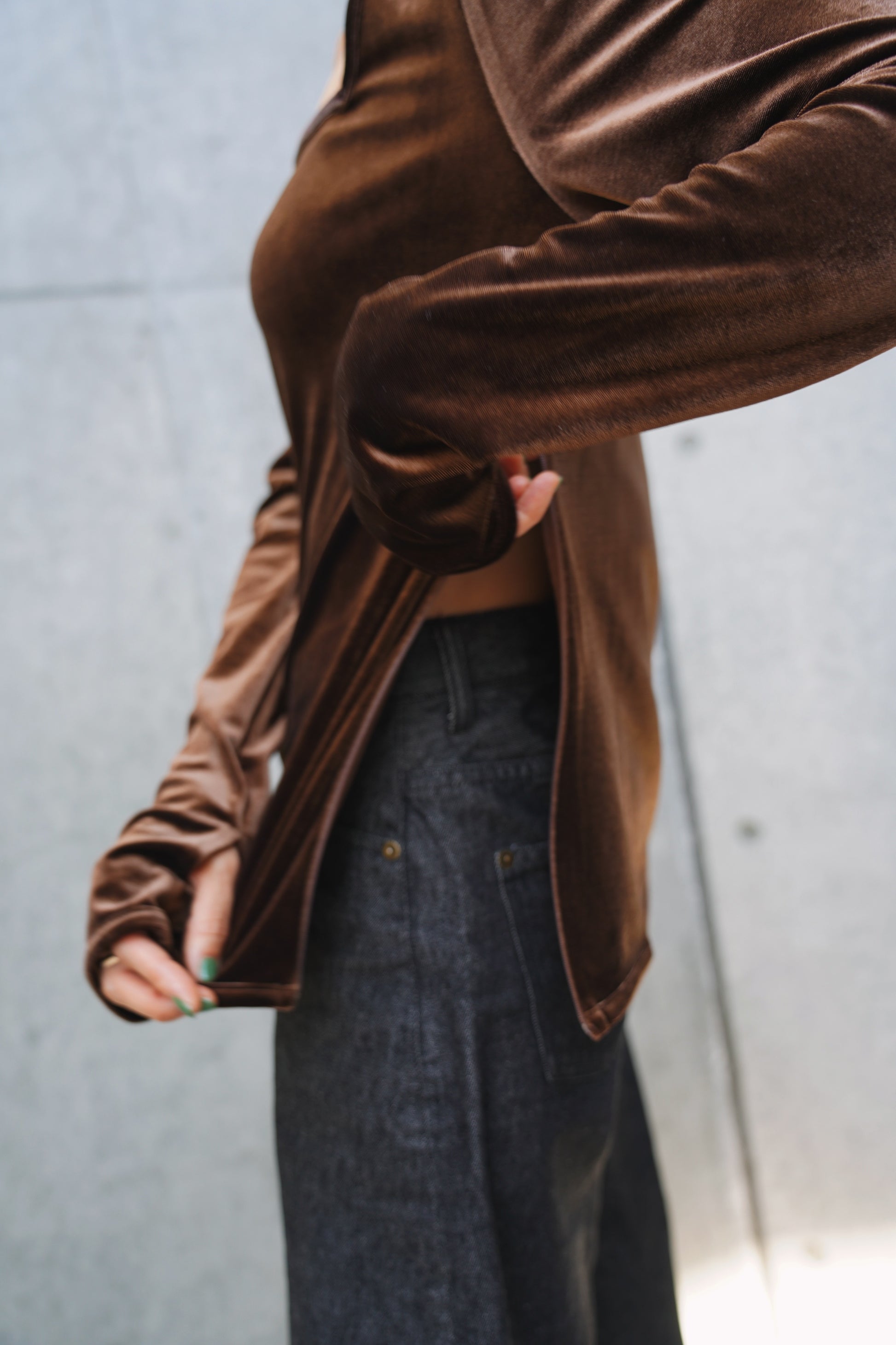 柔らかく伸縮性のあるベロア素材を使用し、上品な光沢がスタイリングを引き立てる一枚。