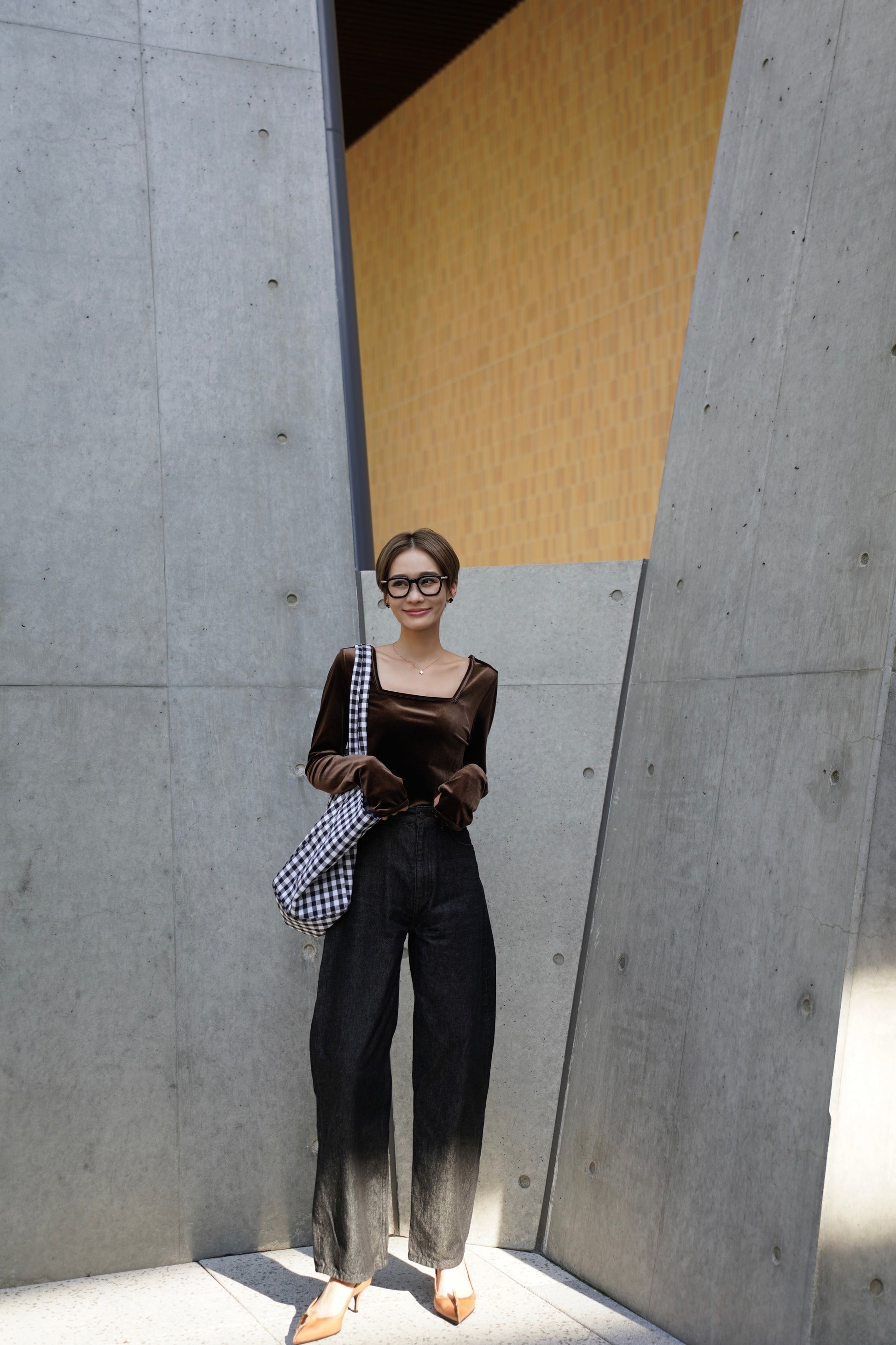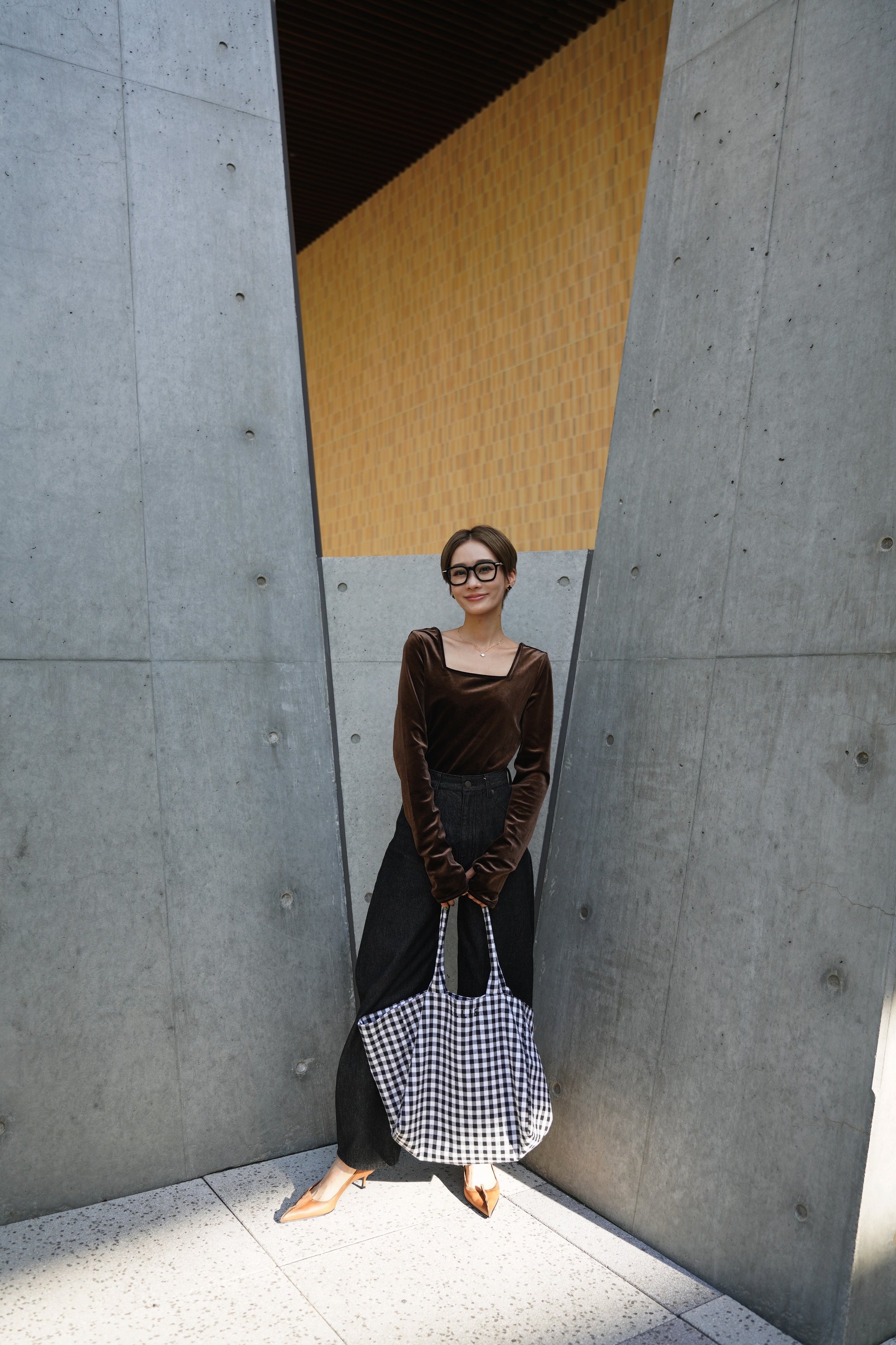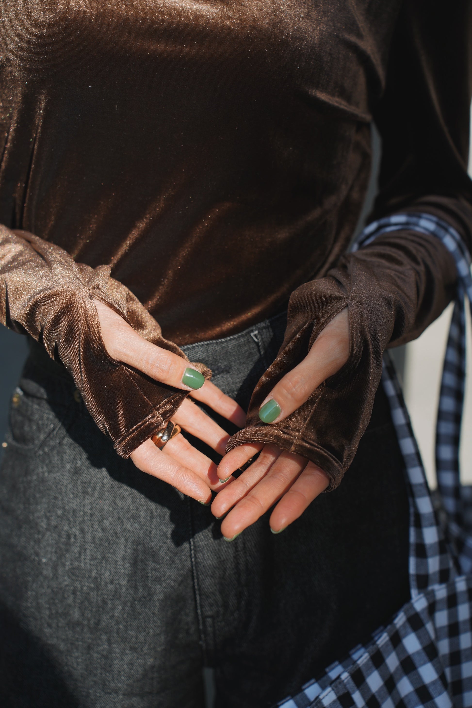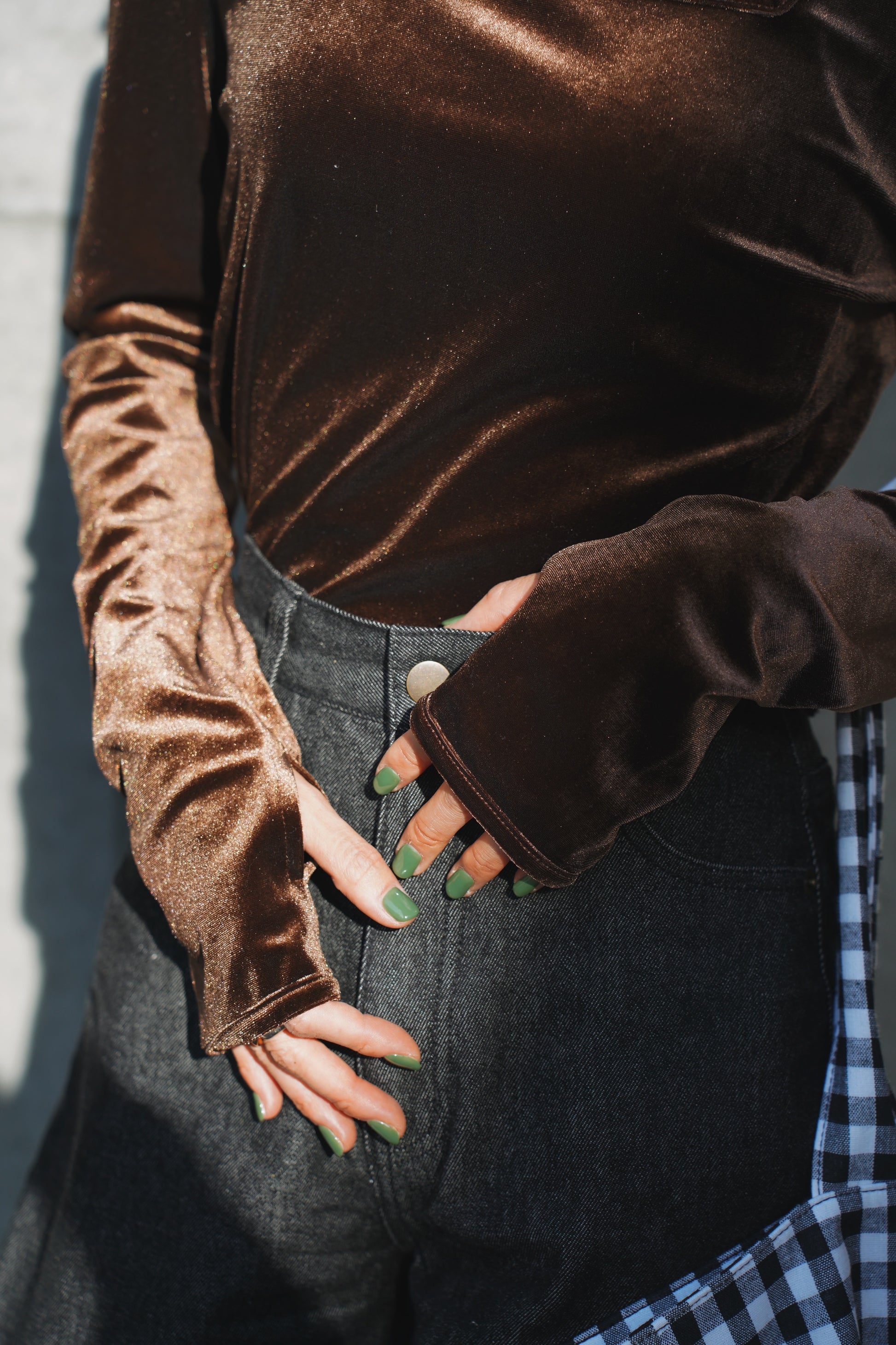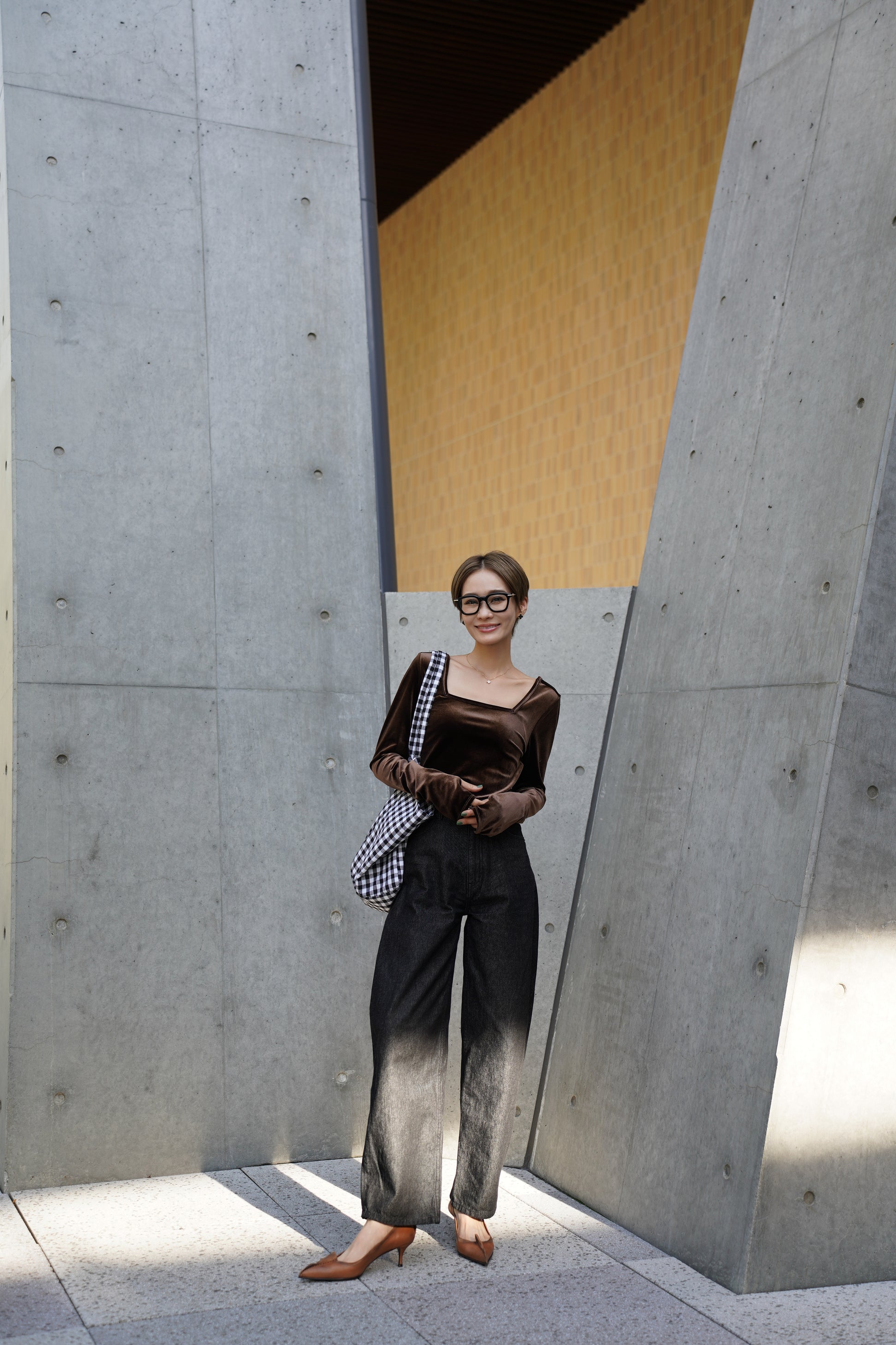 柔らかく伸縮性のあるベロア素材を使用し、上品な光沢がスタイリングを引き立てる一枚。