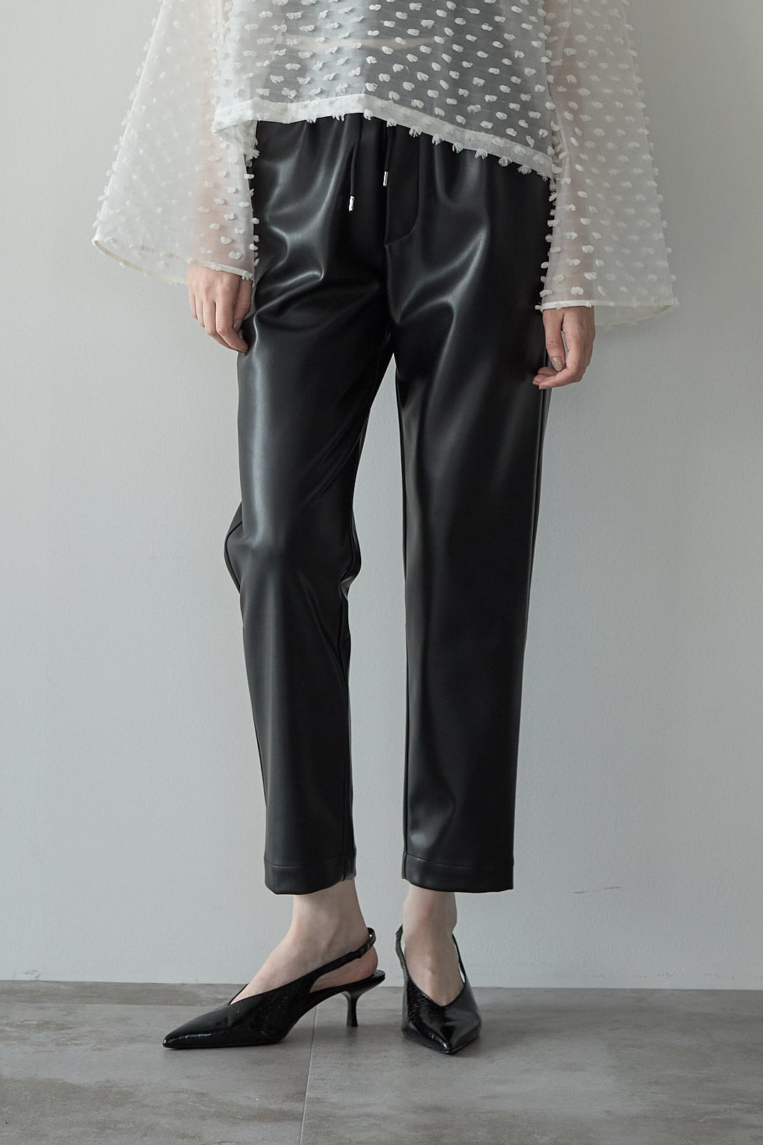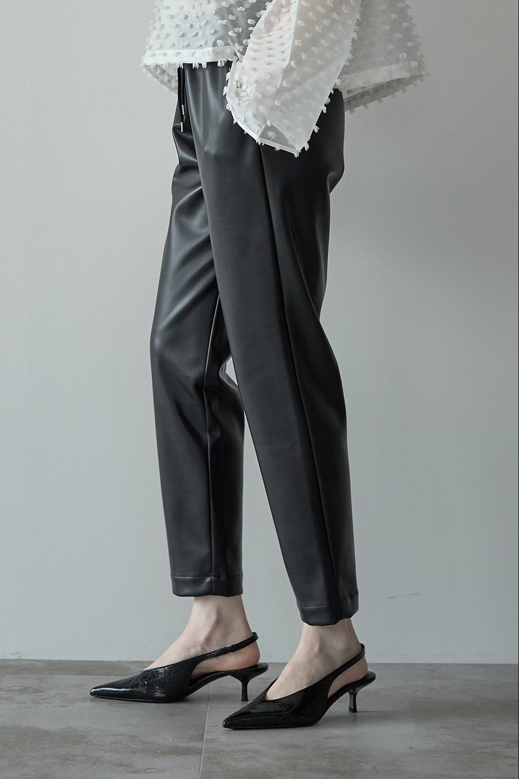 足首が少し見えるテーパードシルエットで、すっきりとした印象を演出。