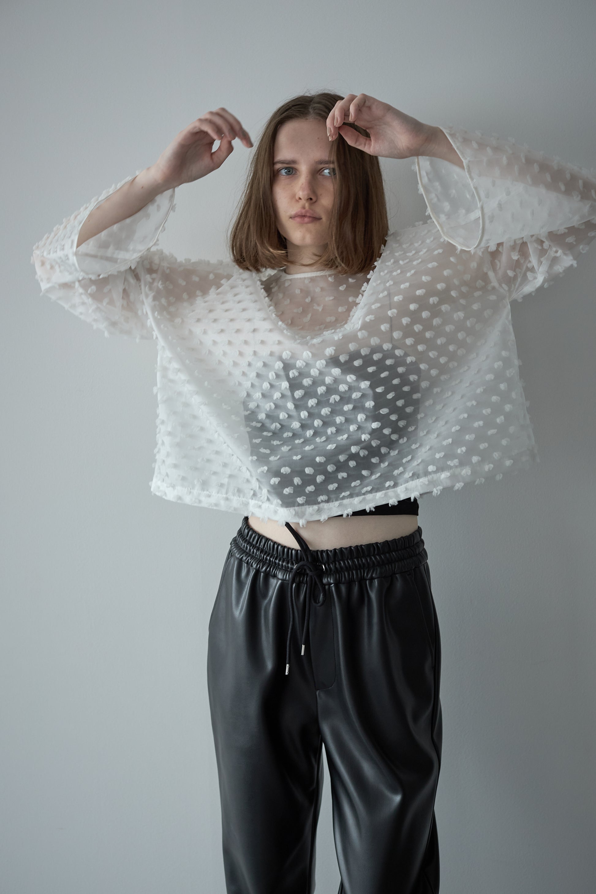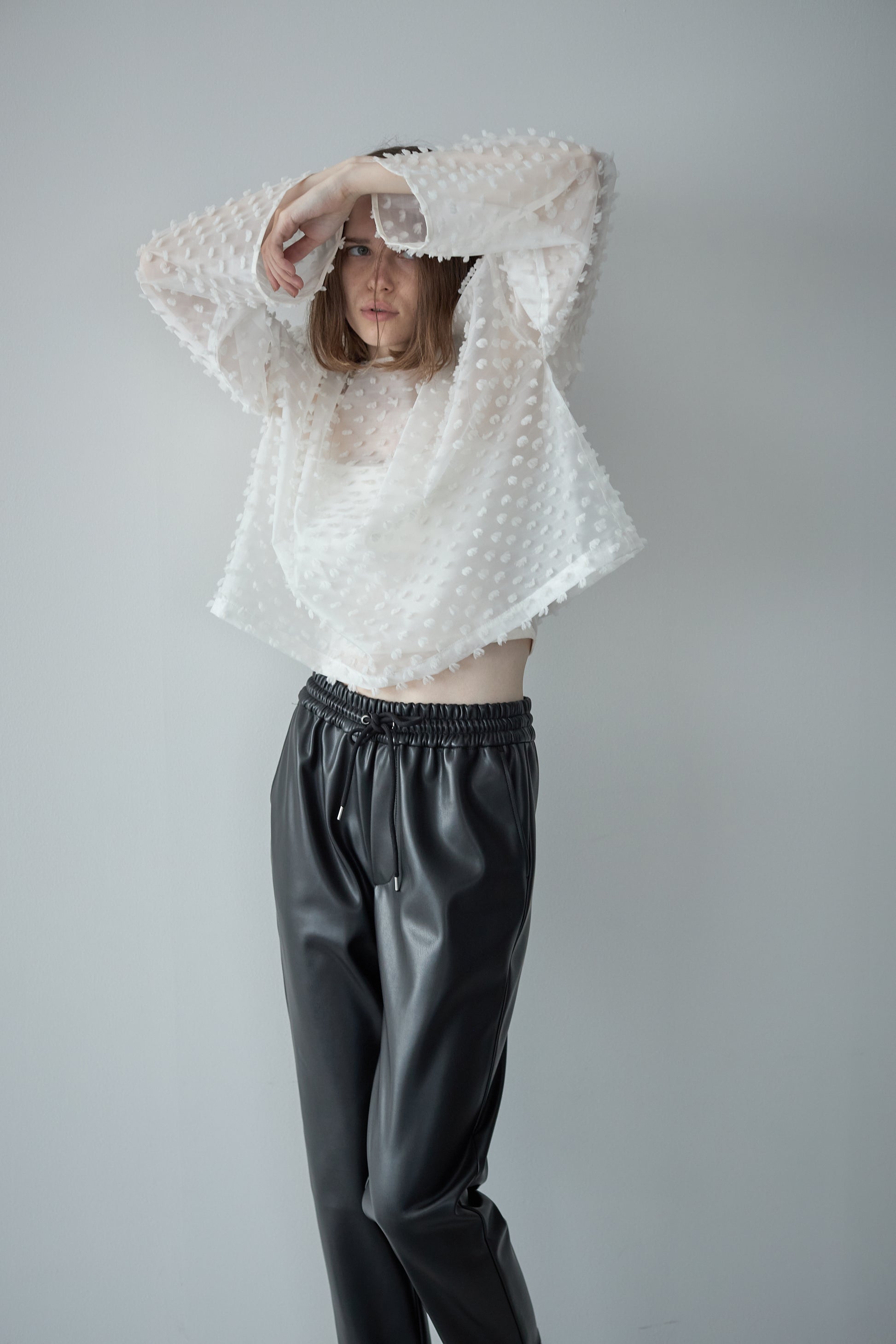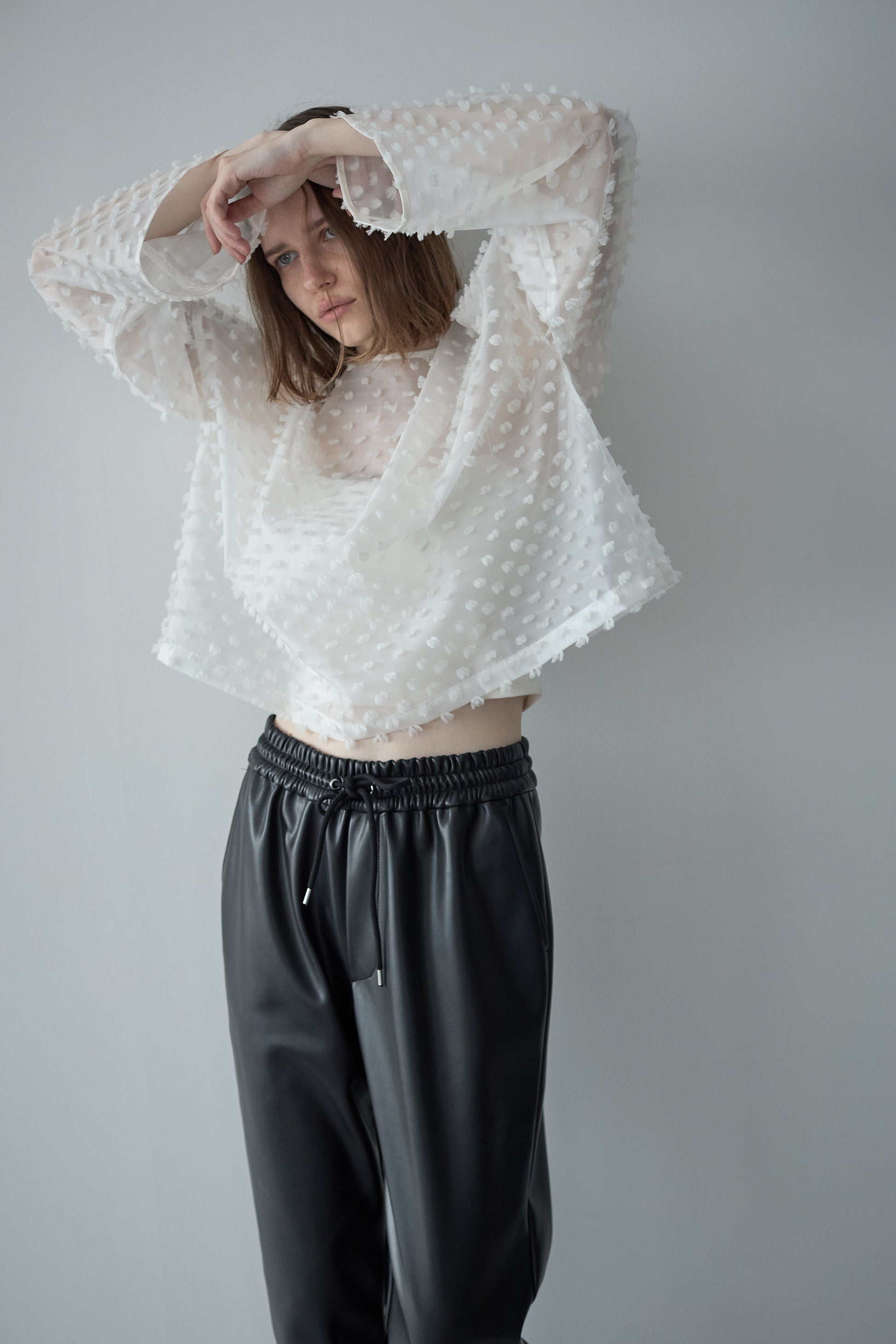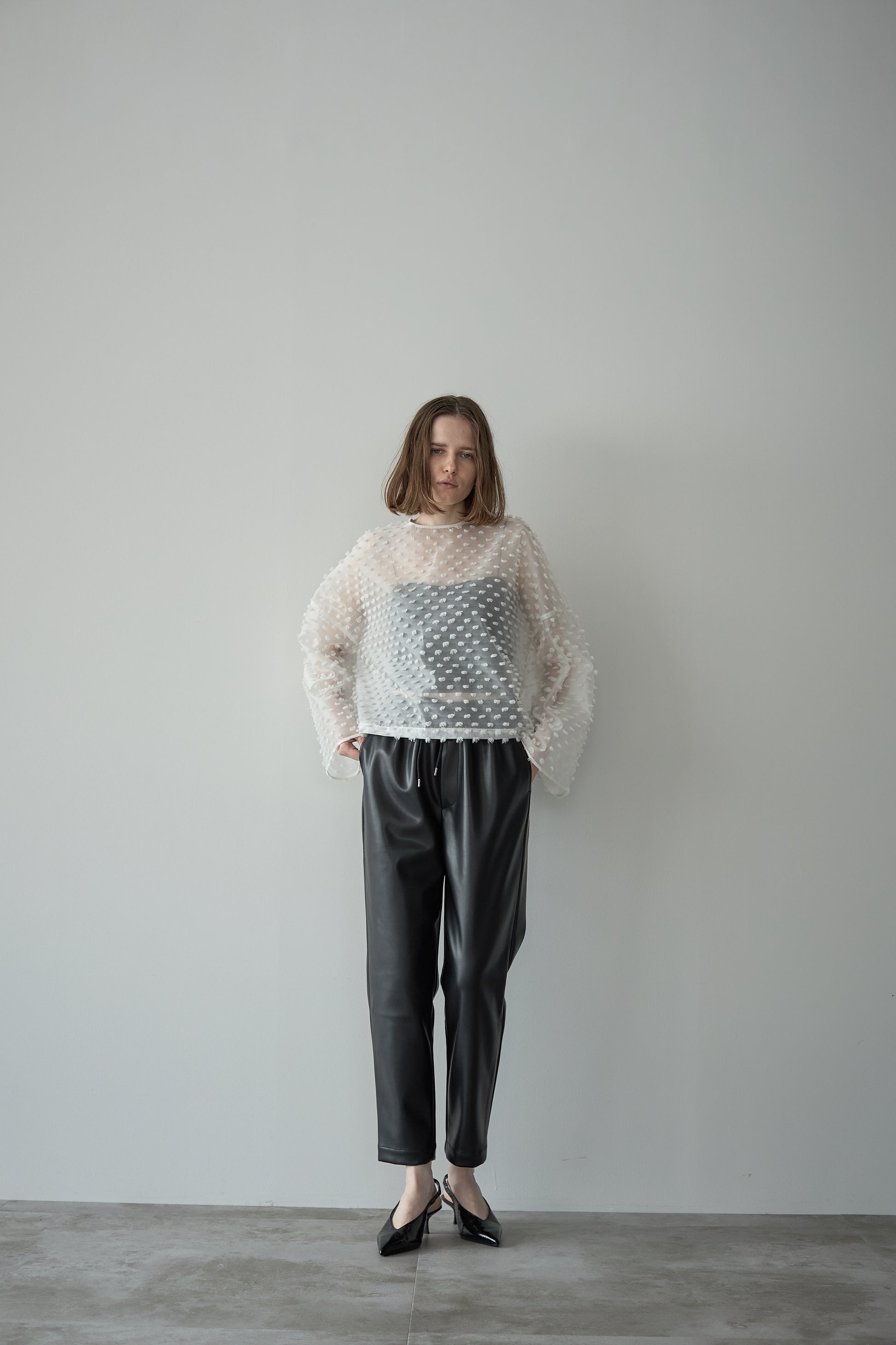 しなやかで手触りの良いフェイクレザーを使用しており、動きやすさも抜群です。ハードになりがちなレザー素材も、程よい光沢と柔らかさで上品に仕上げました。