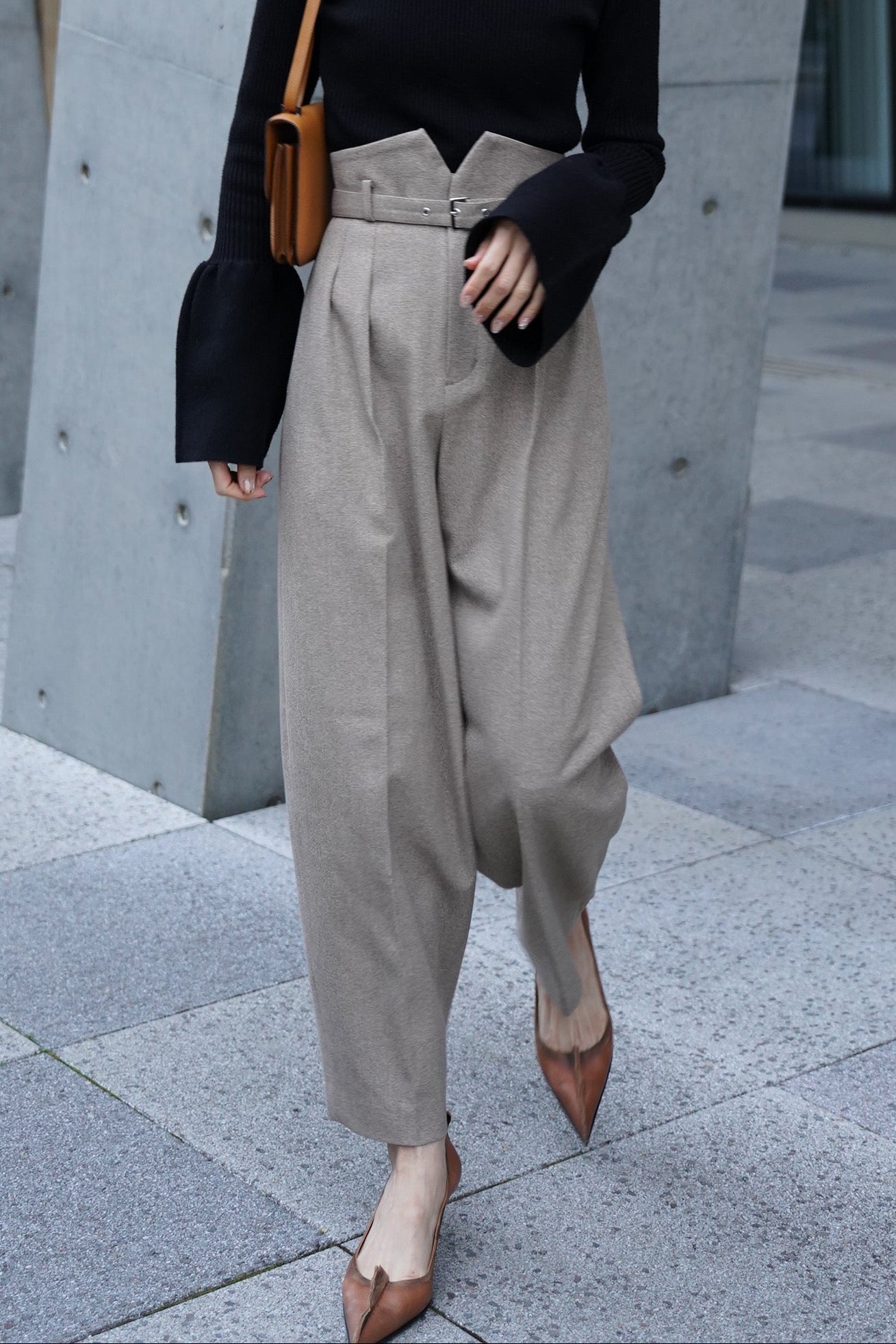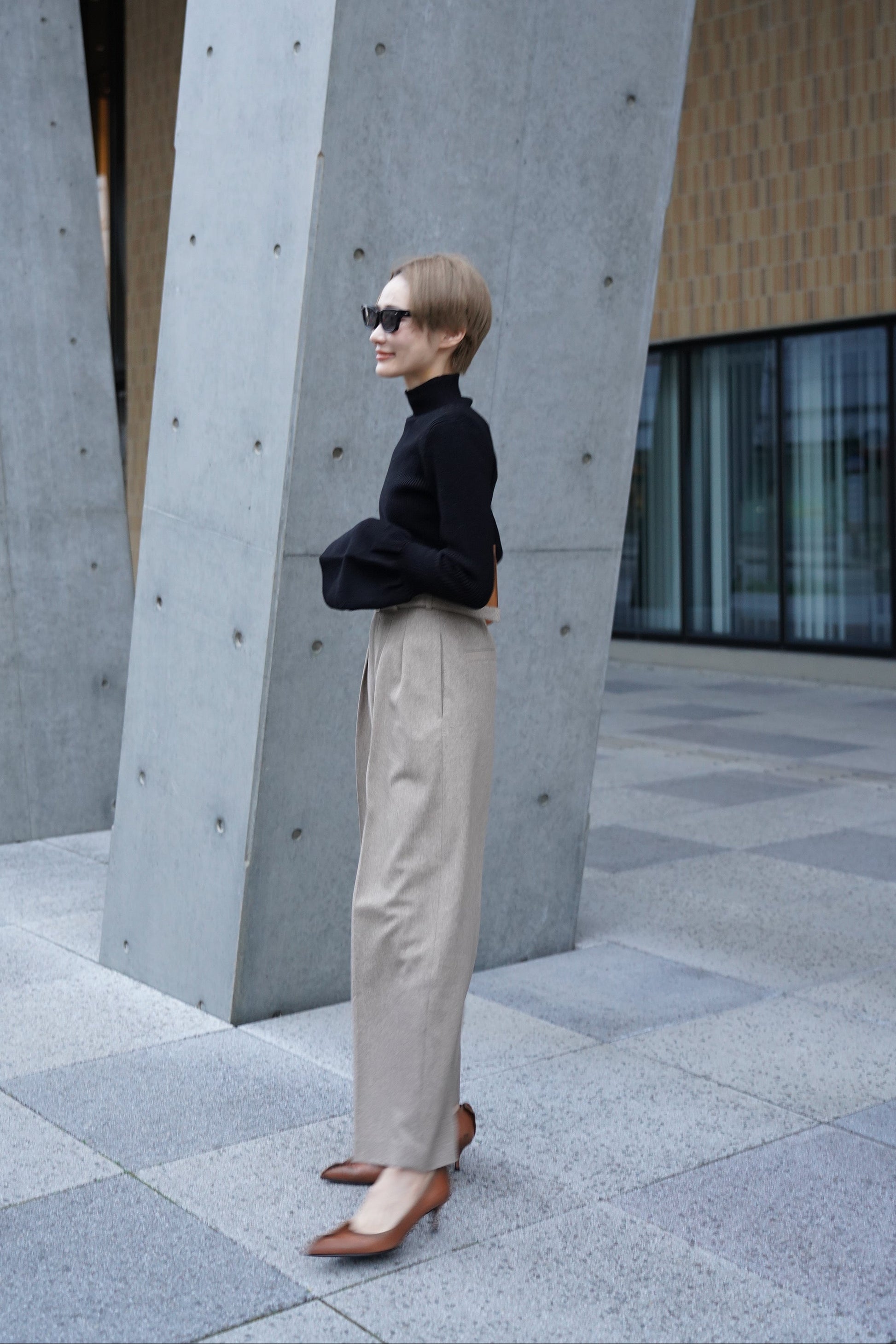 "丸みのあるフォルムとシャープさを併せ持つ、上品なツイードパンツ"