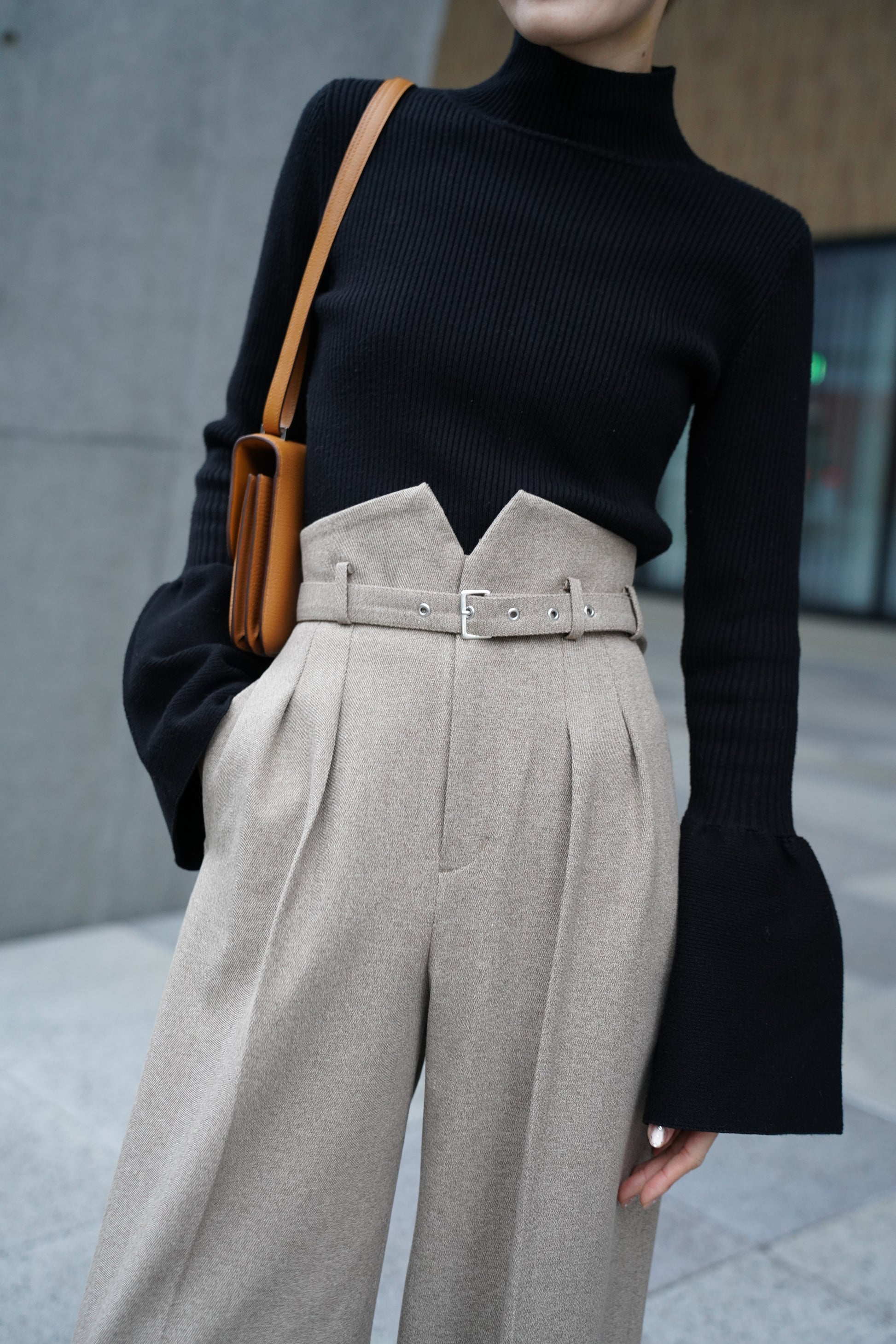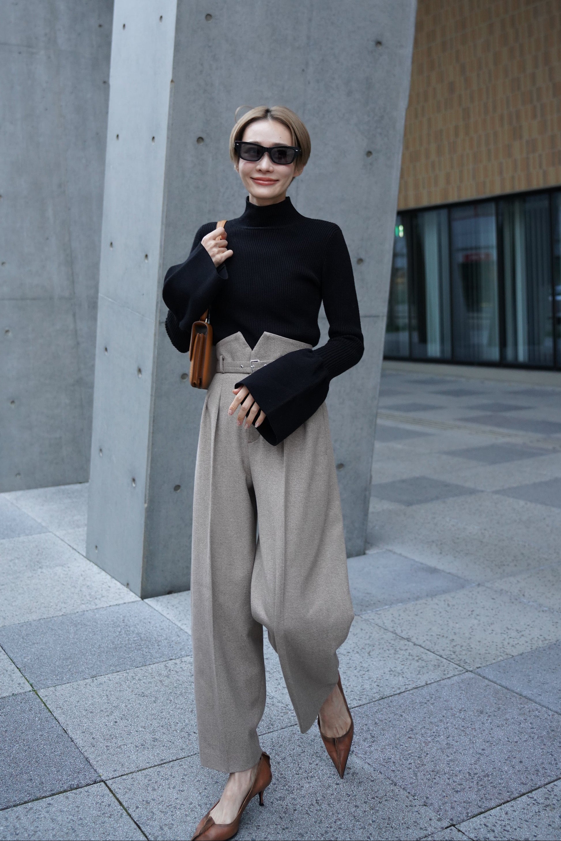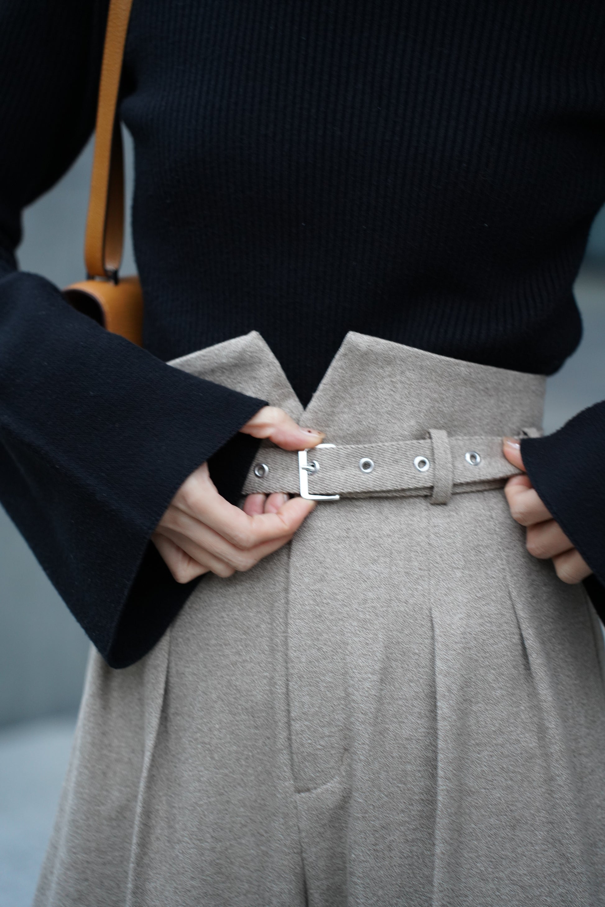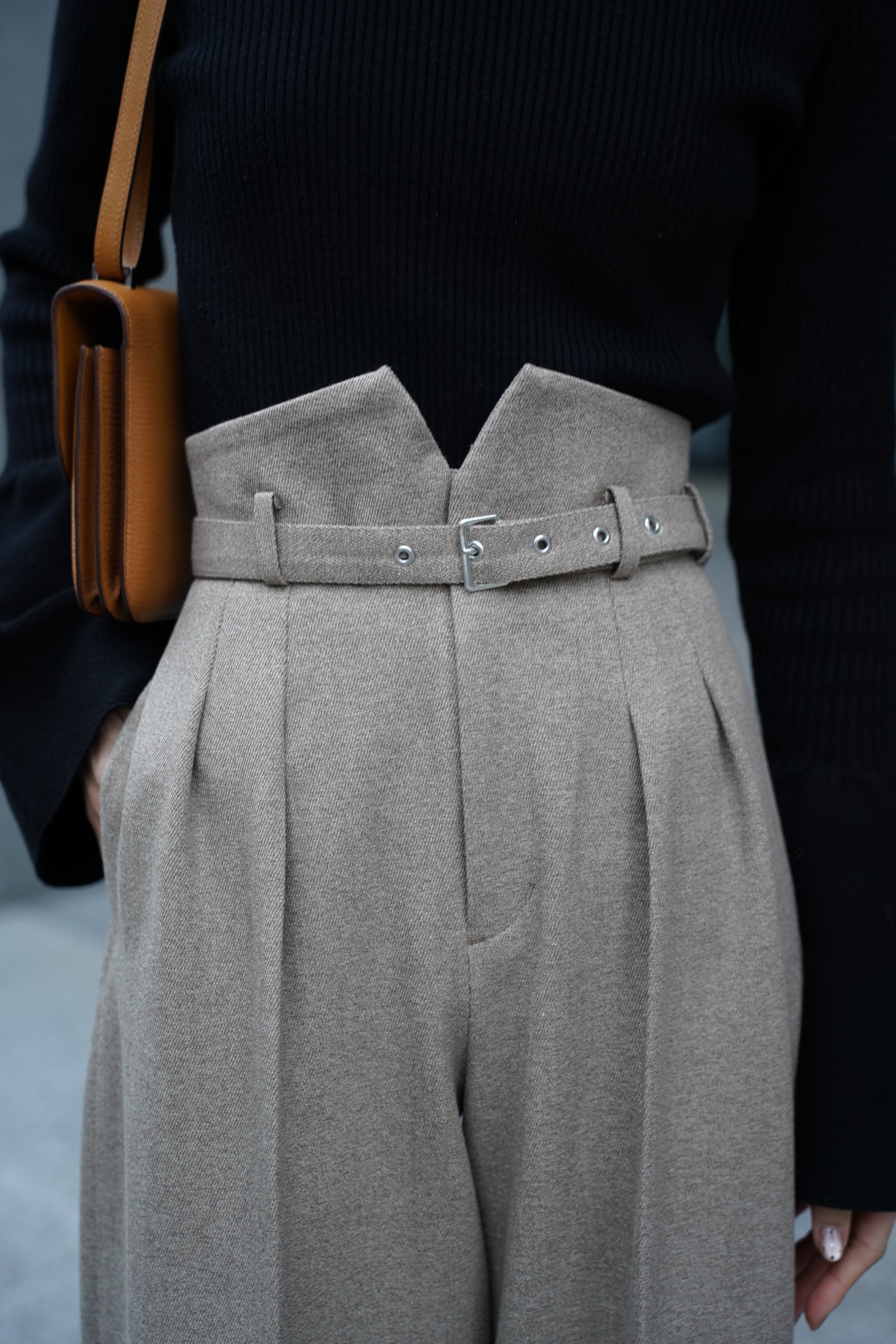ベルト付きのハイウエストデザインは、トップスインも美しく決まり、