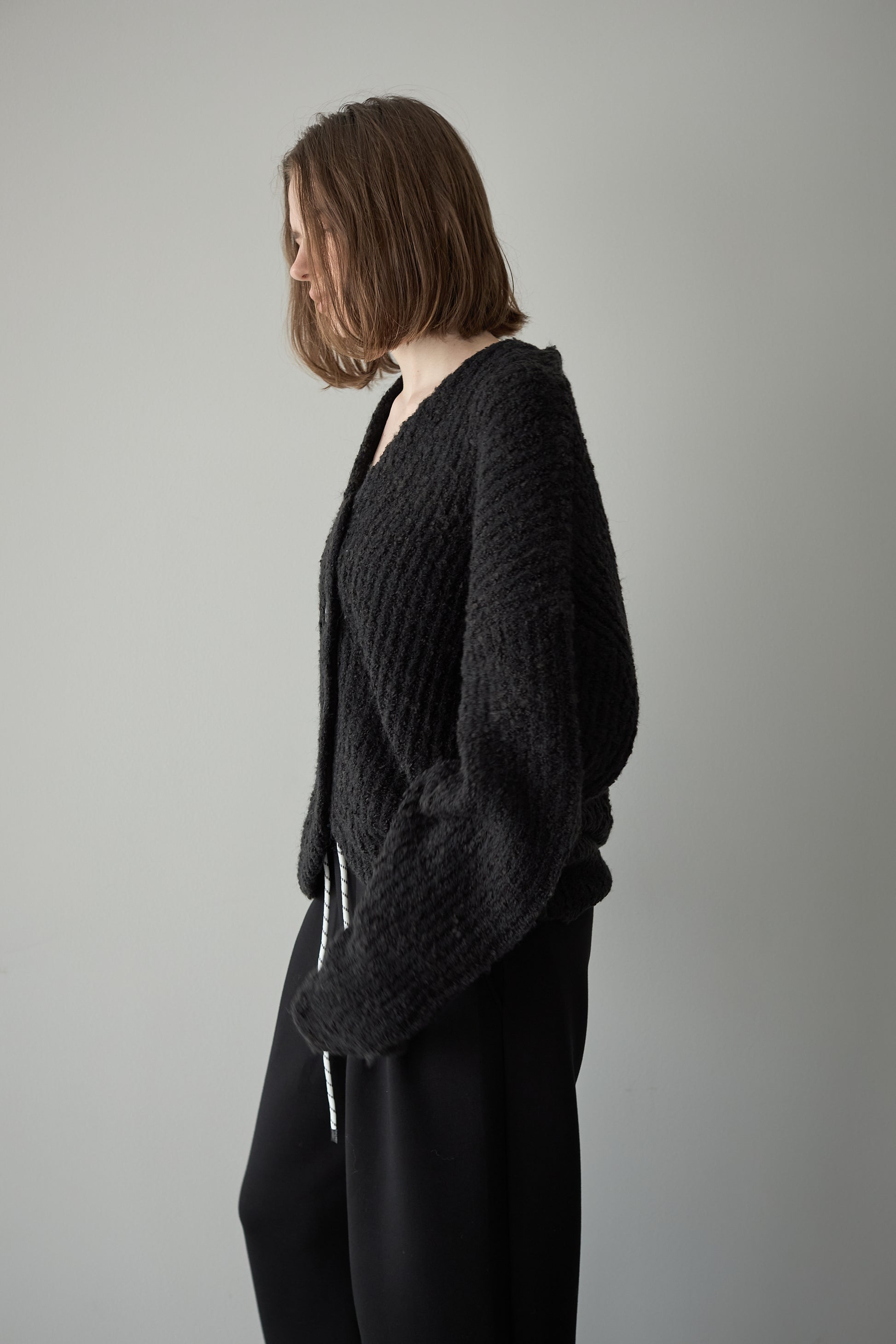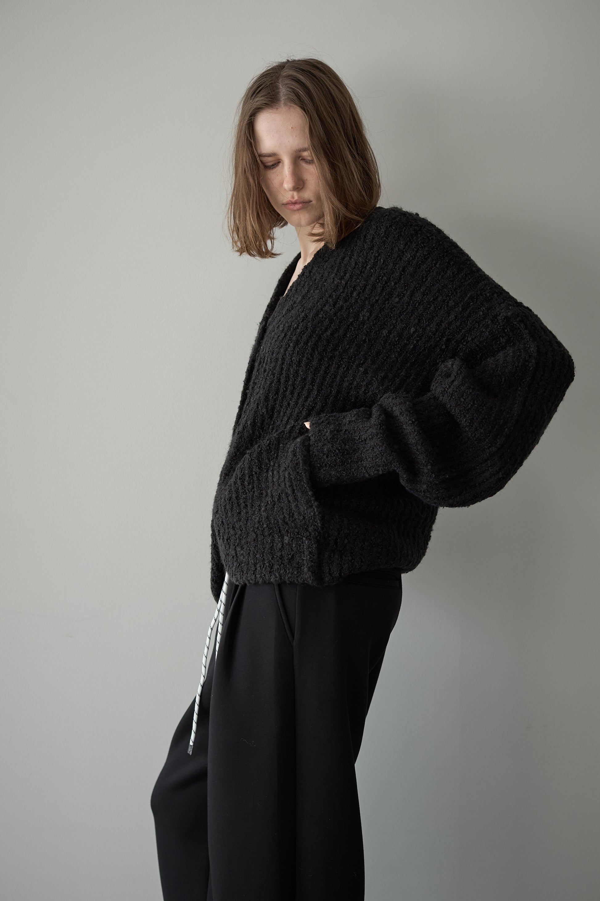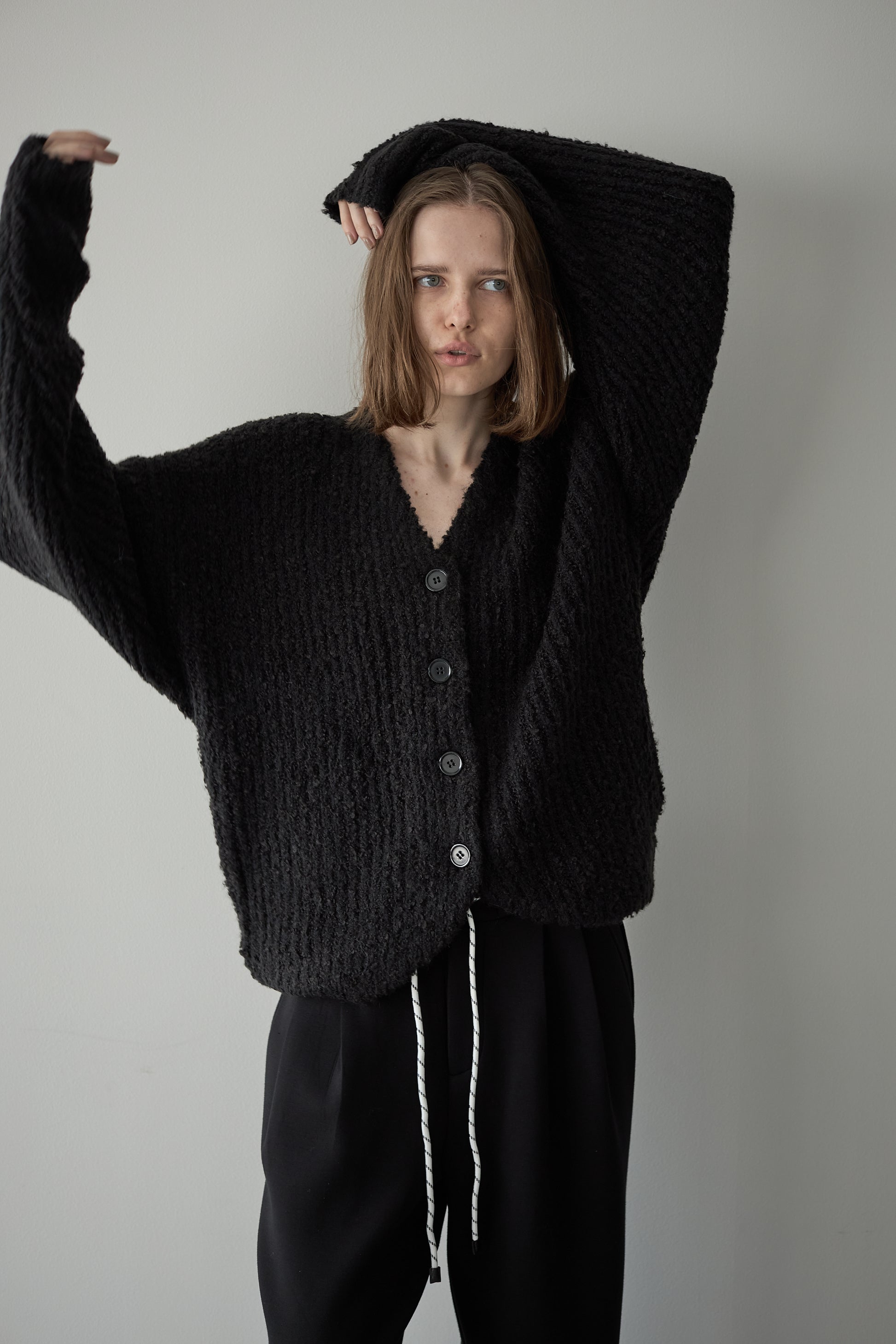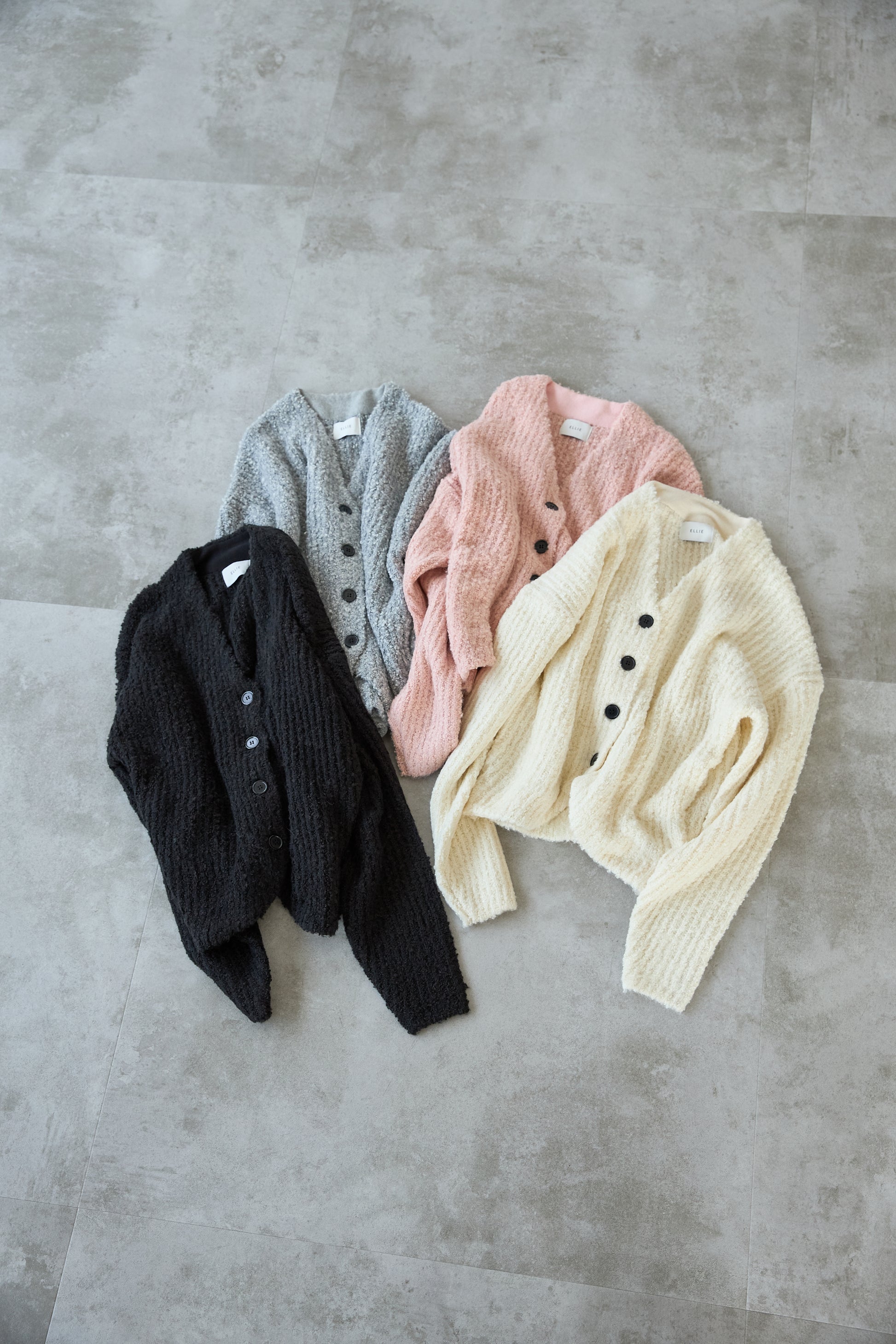 ふんわりとしたブークレ素材で仕立てたロングカーディガン。