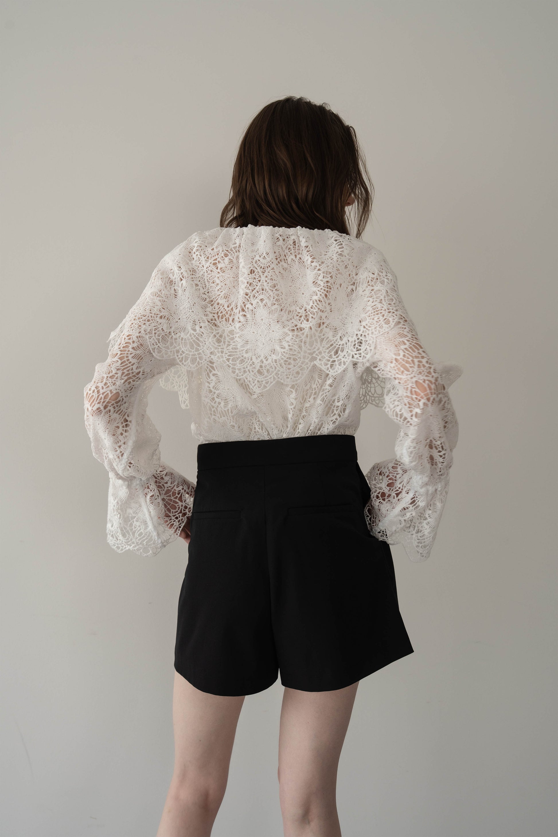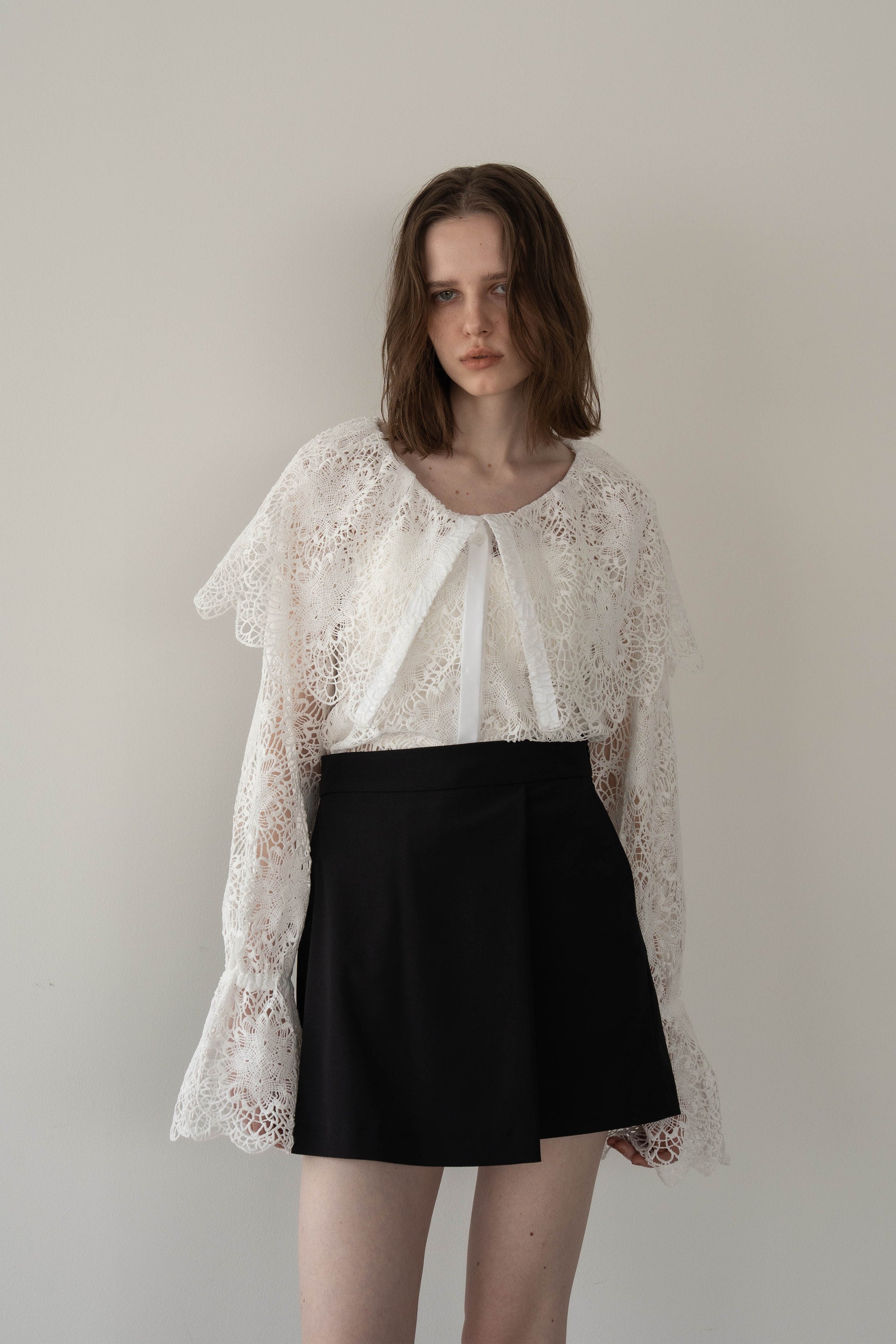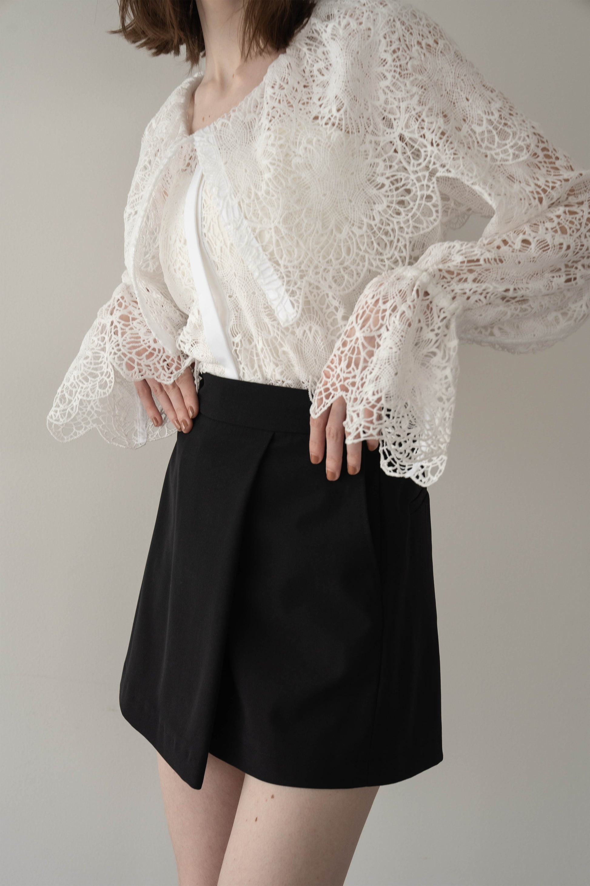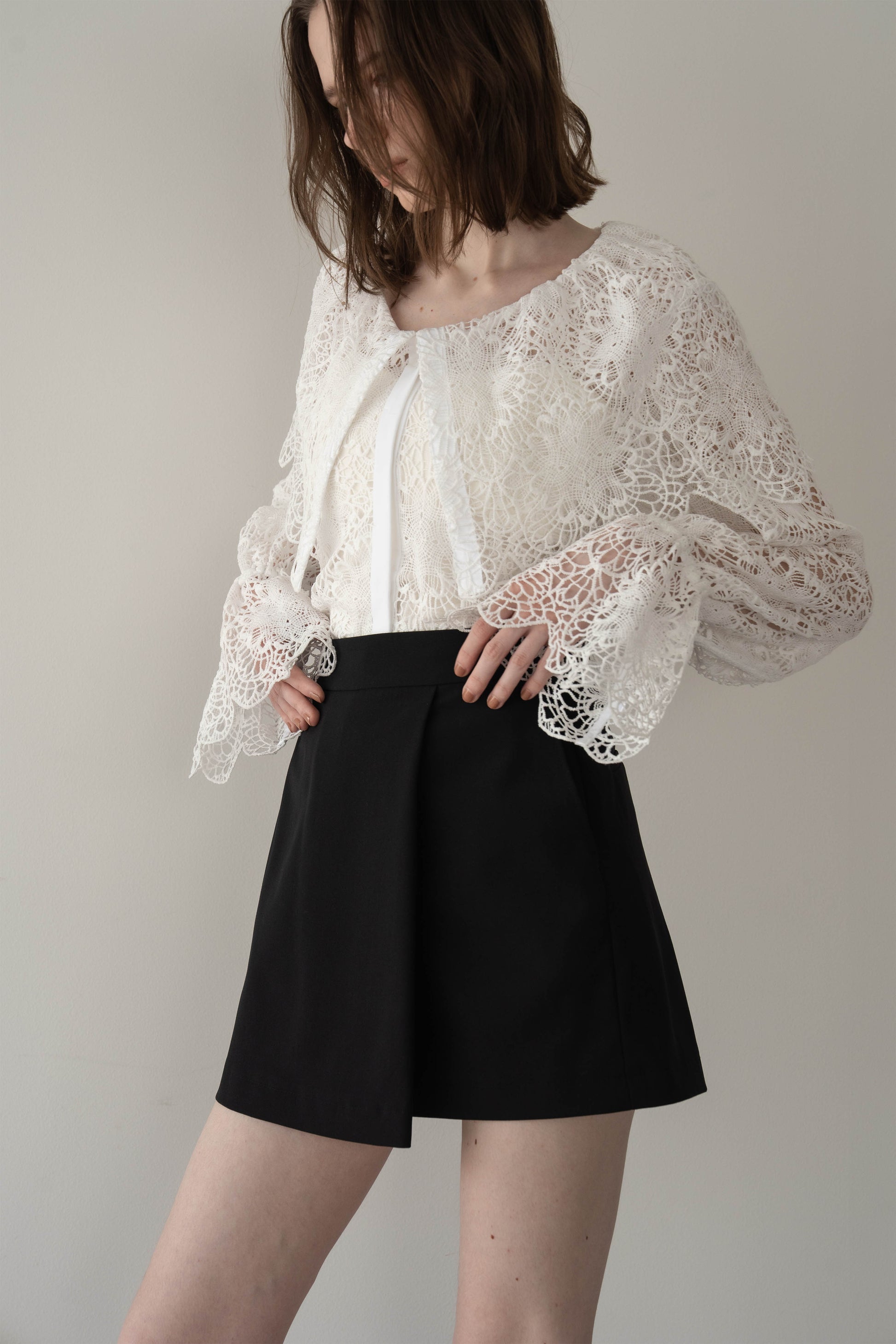 無地で仕立てたスコートは、どんなトップスとも相性がよく、毎日のワードローブに取り入れやすいアイテム。