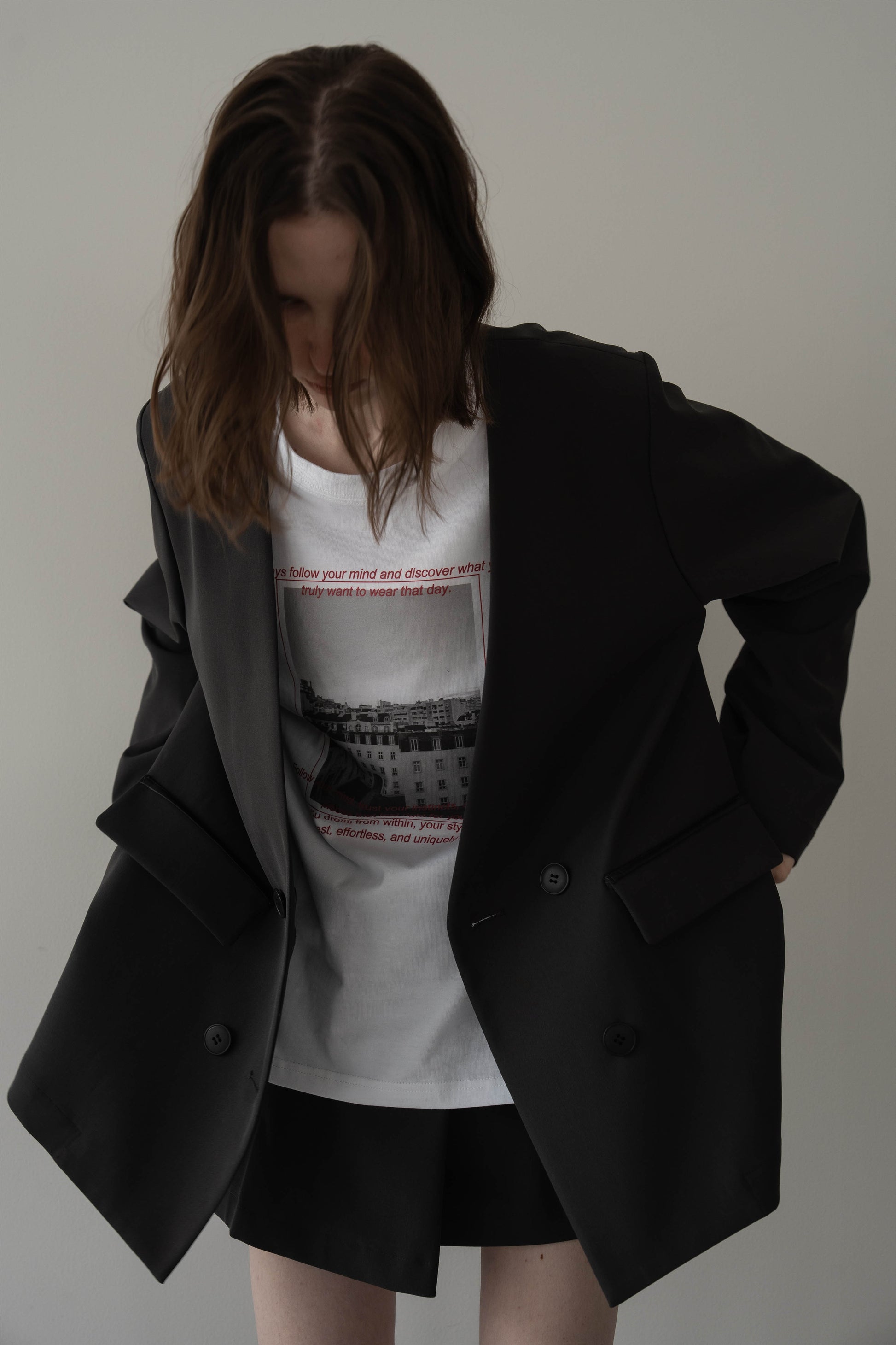 シンプルだからこそ、インナー次第で印象が変わる一着。