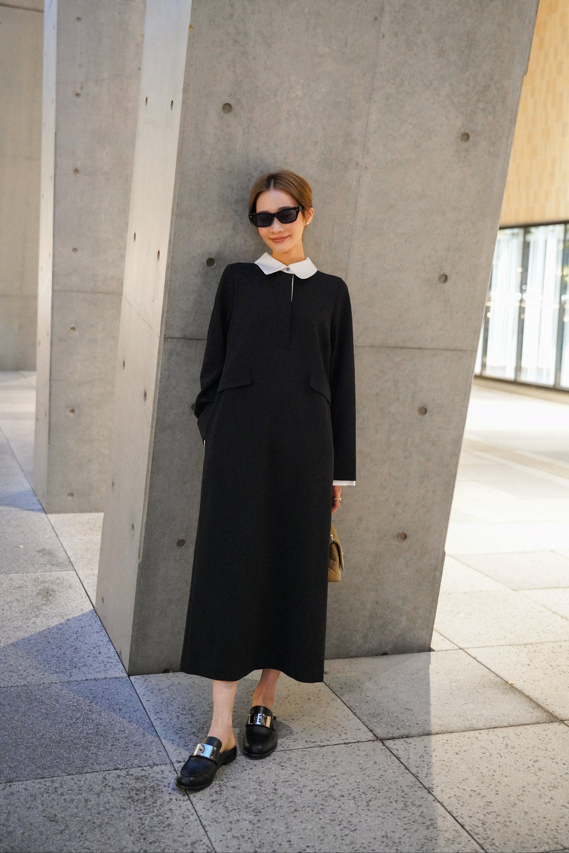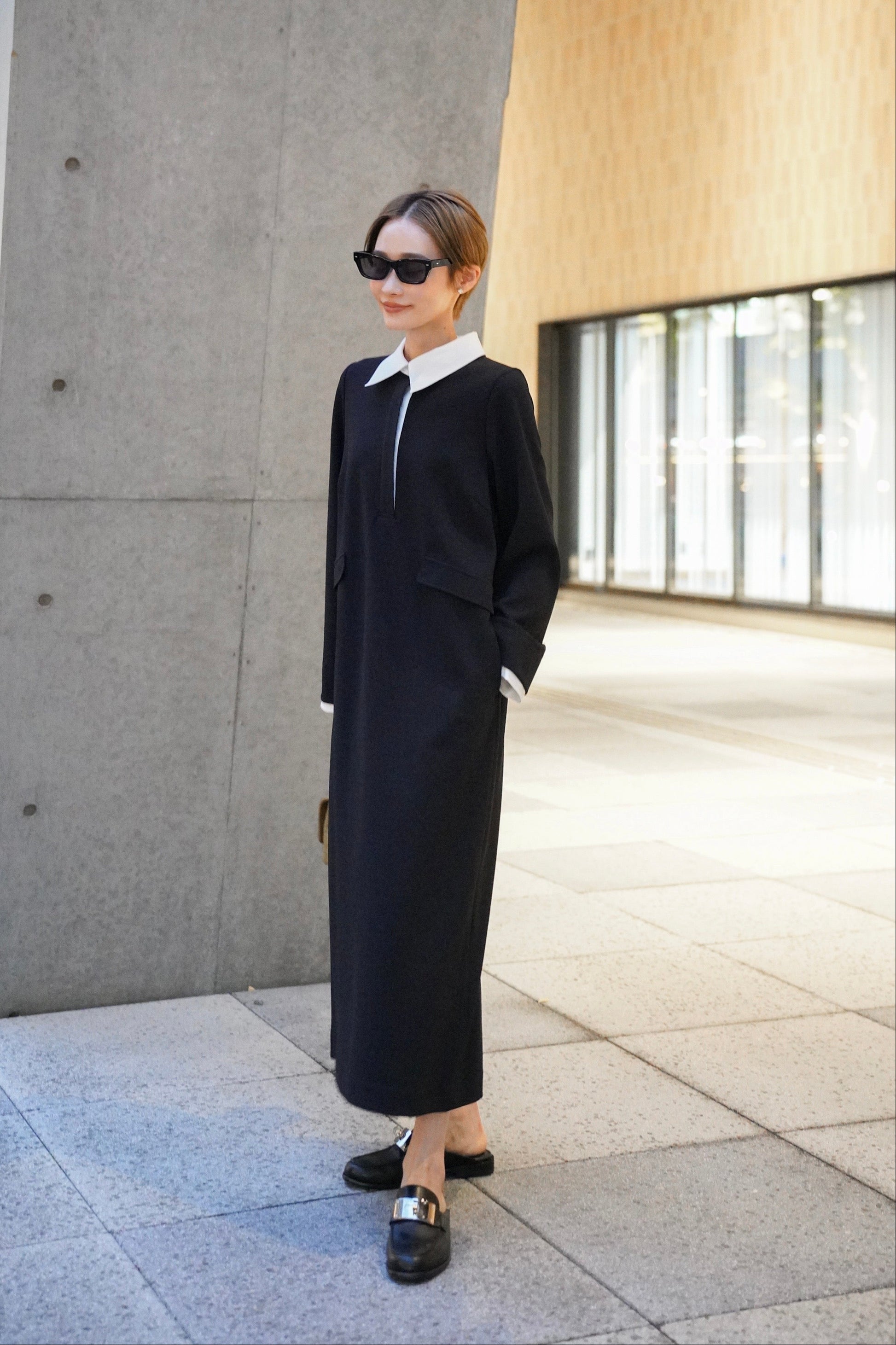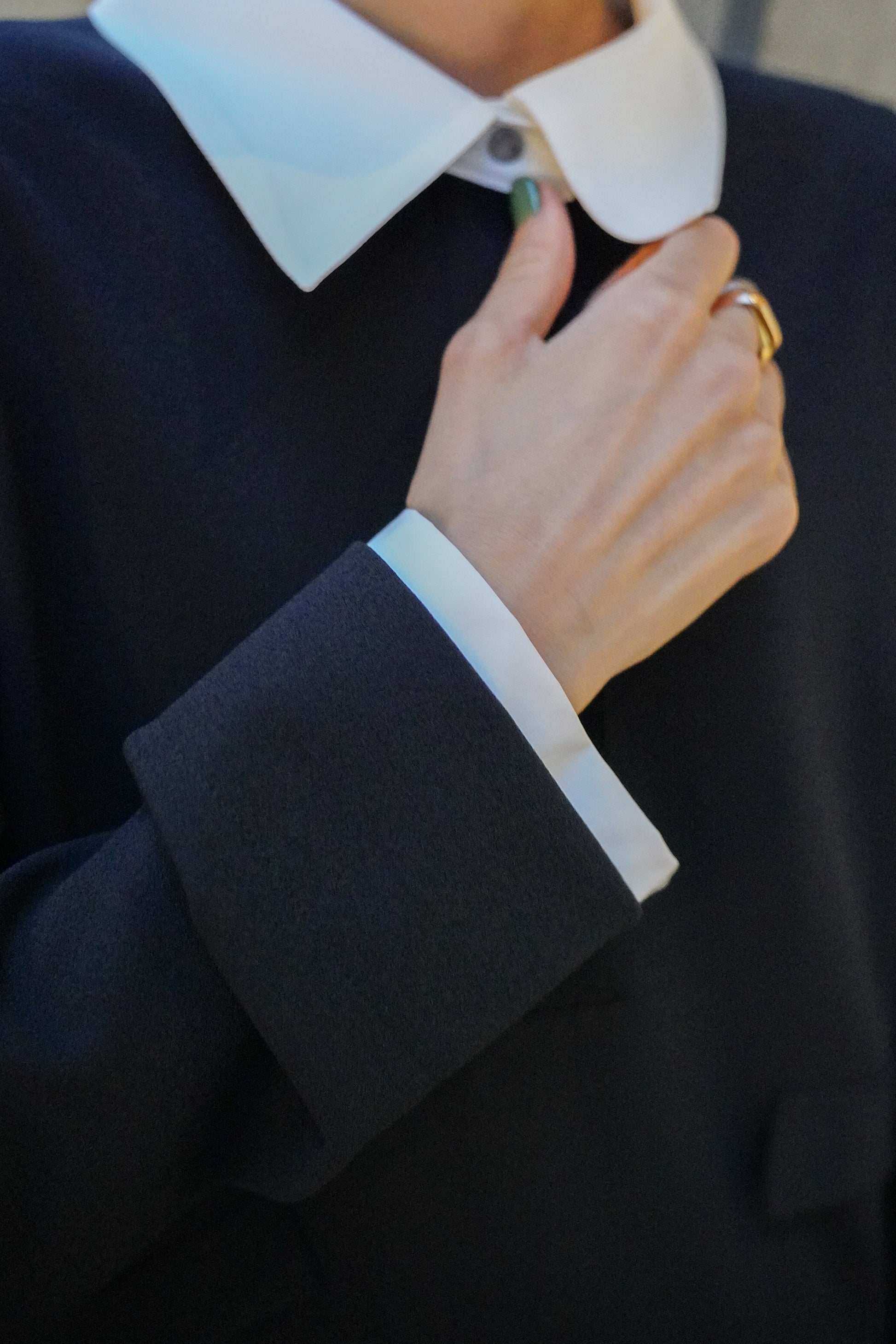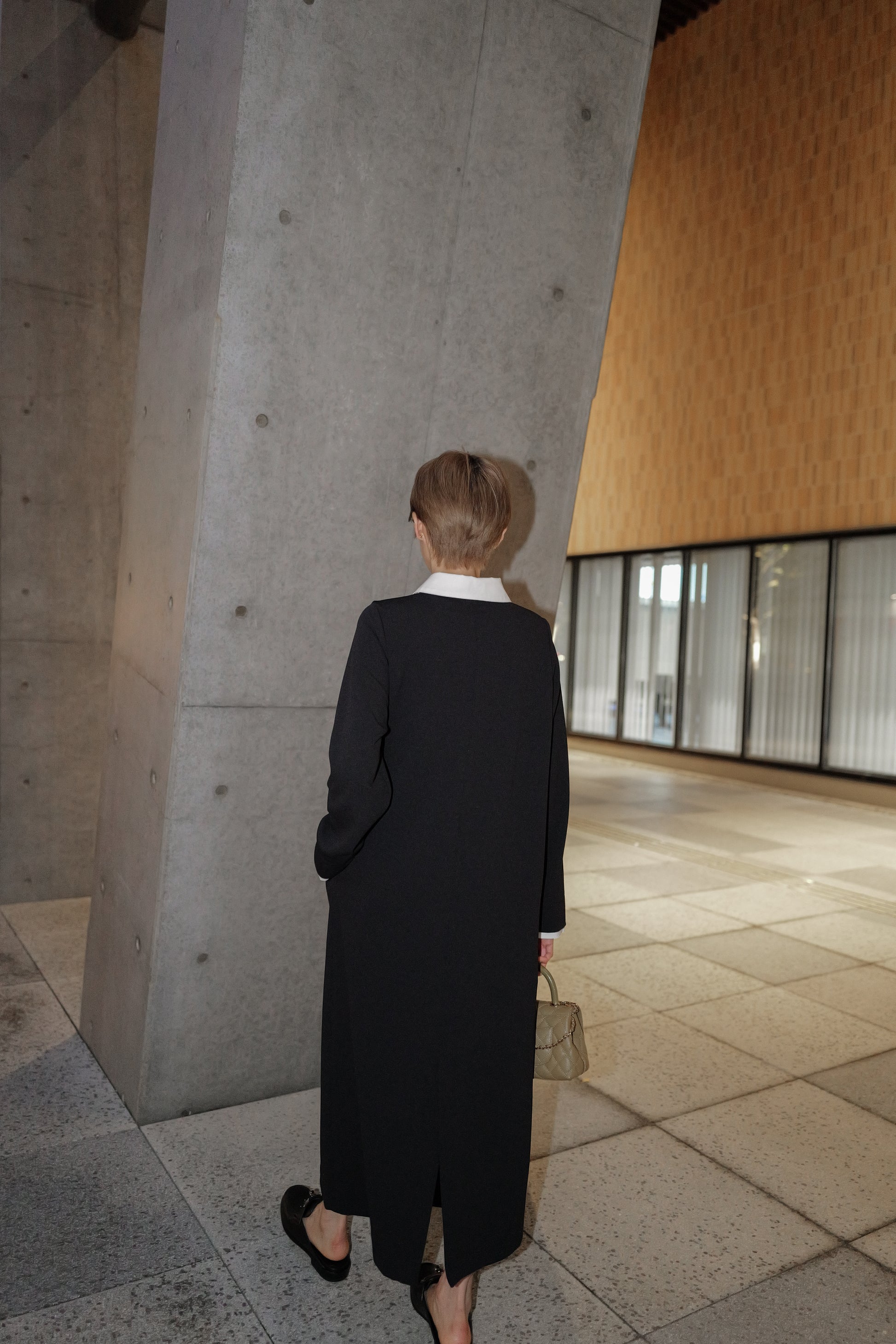 襟と袖口にあしらった配色デザインが、クラシカルな印象を引き立てます。