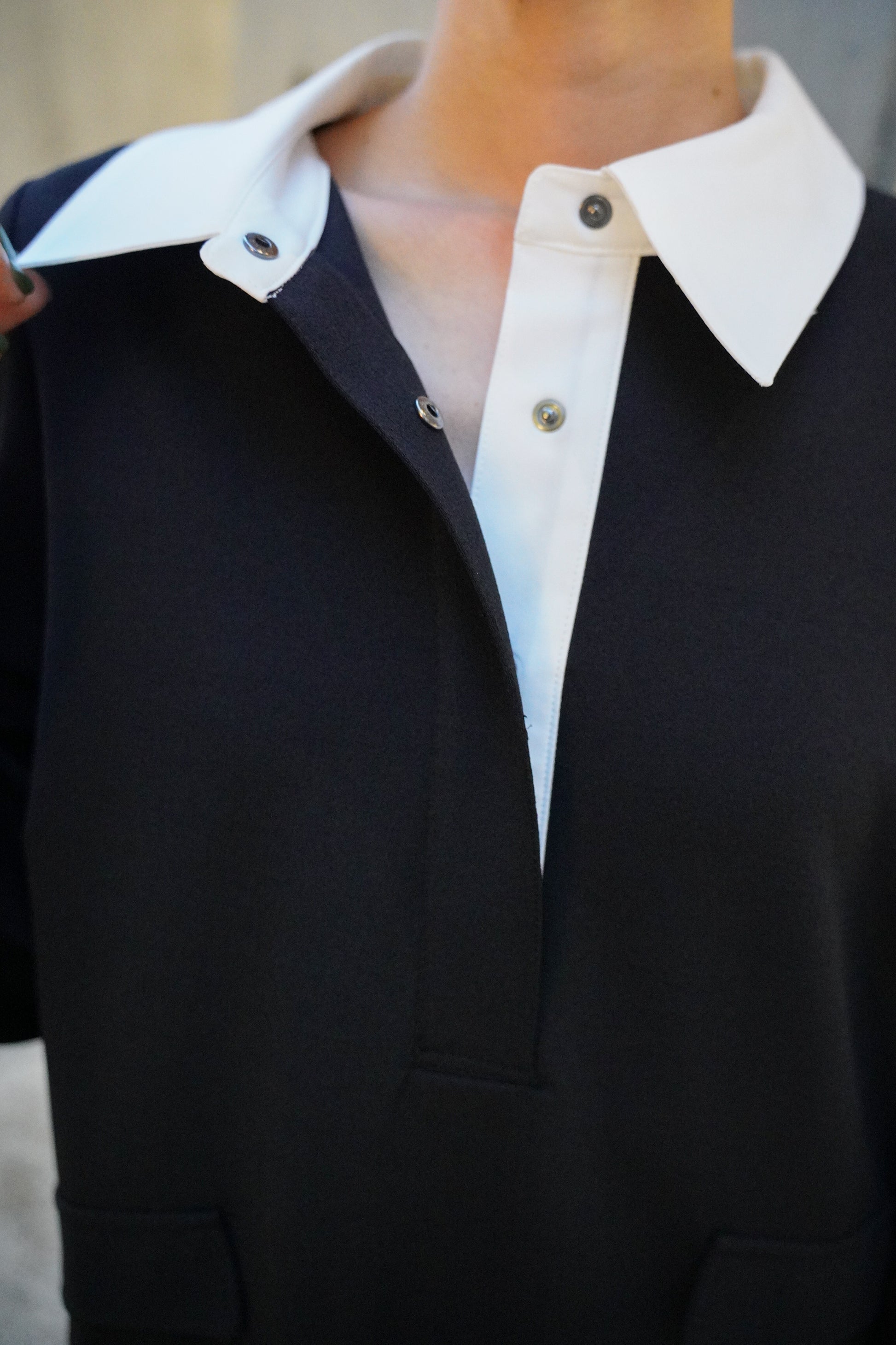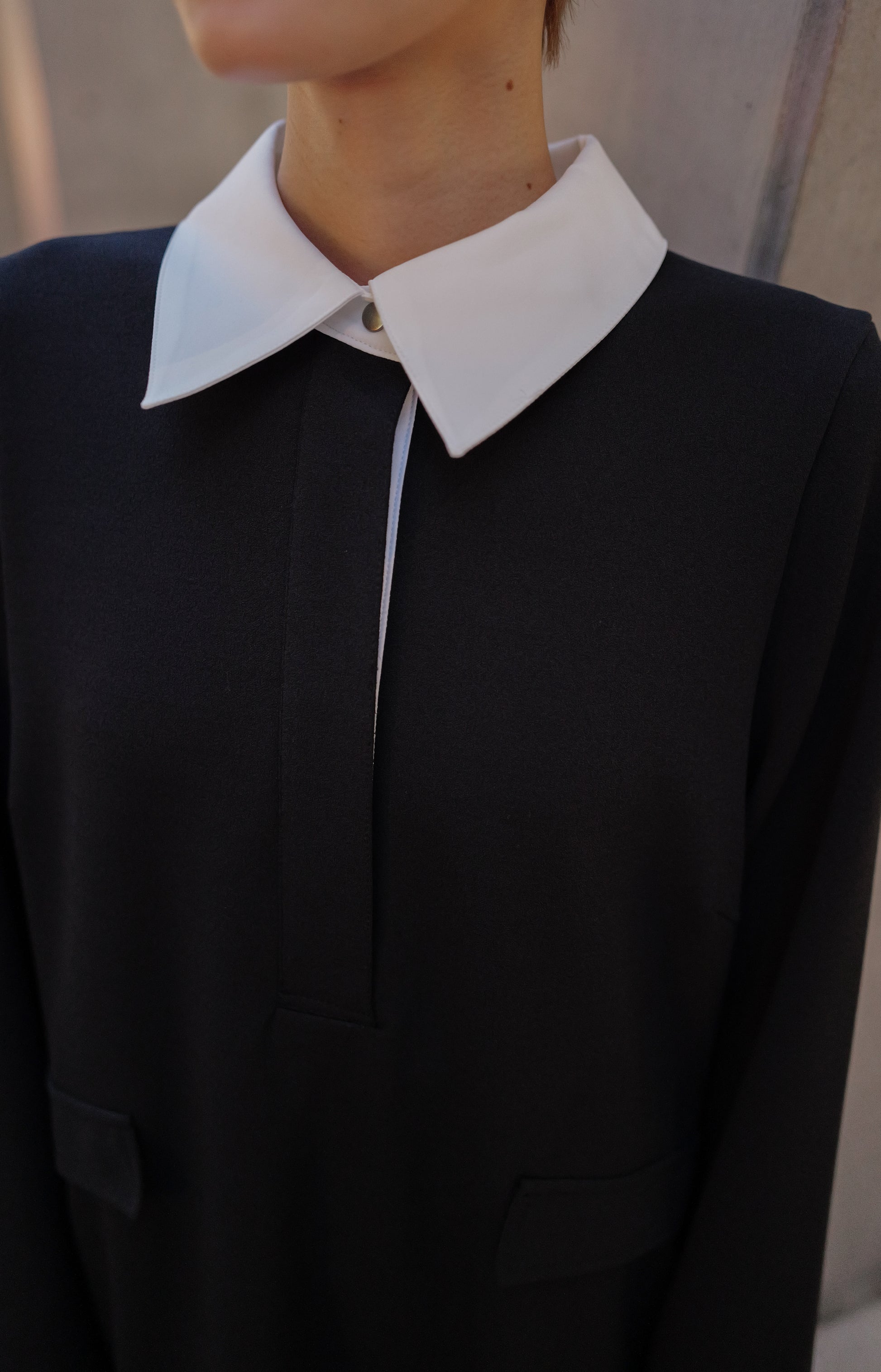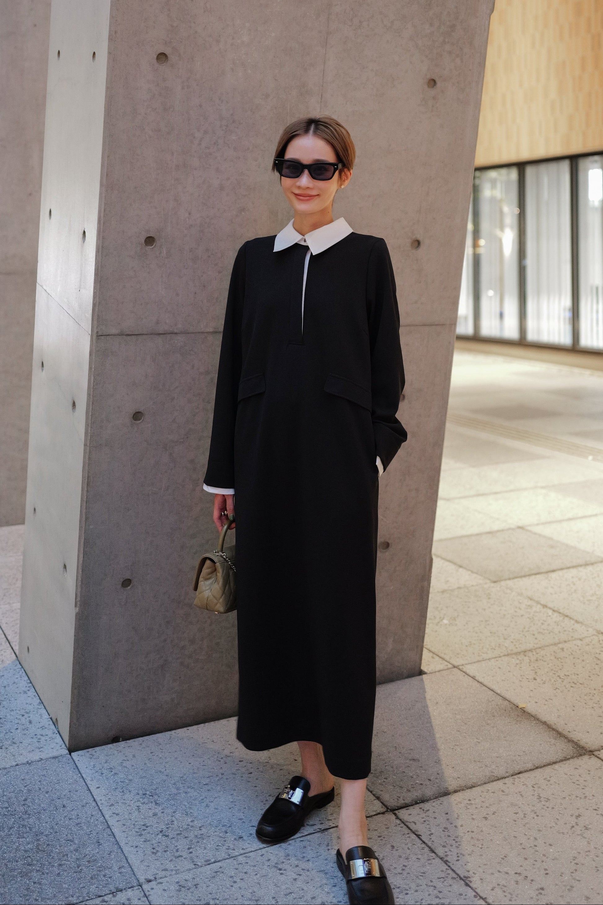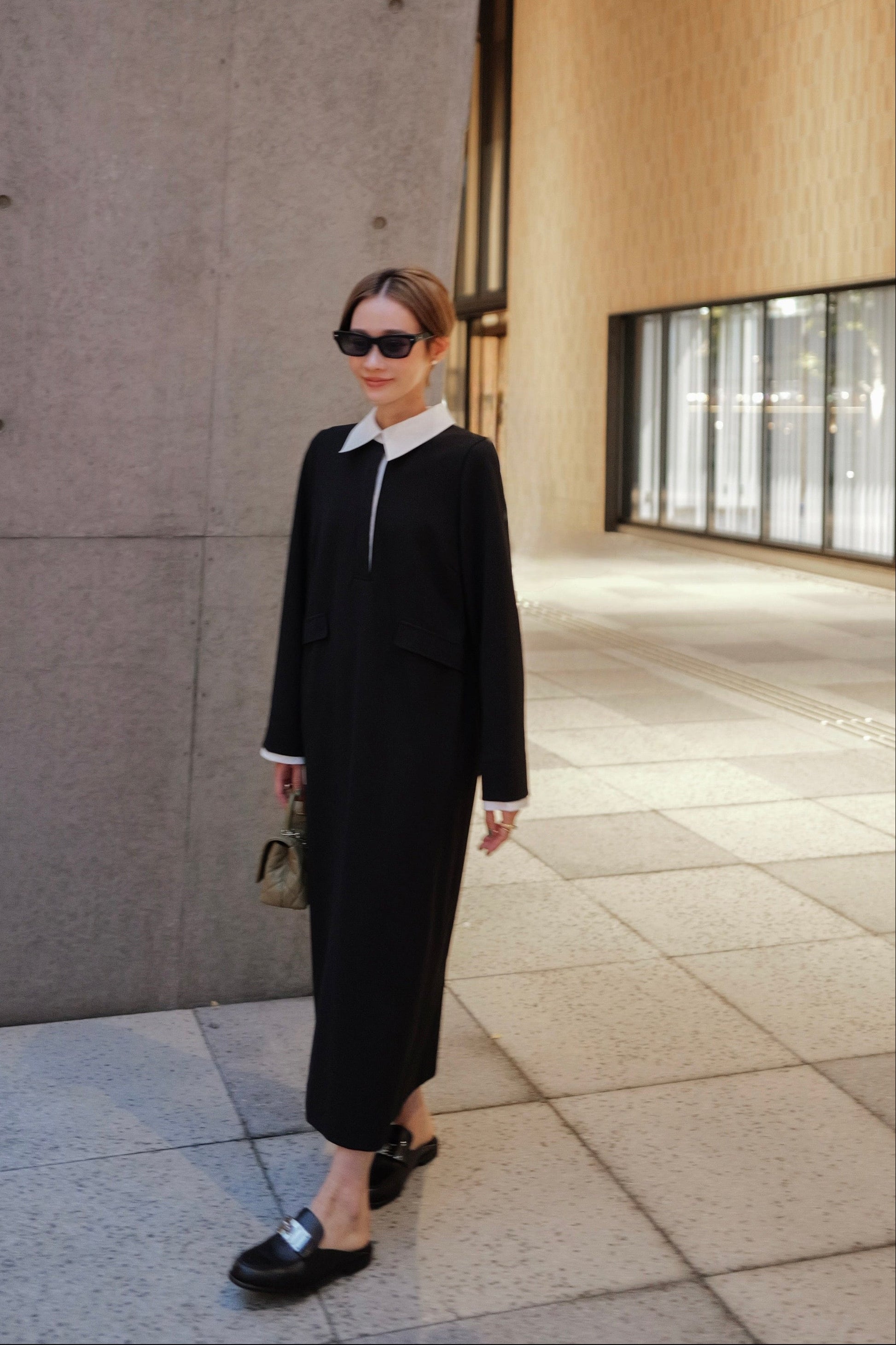 襟と袖口にあしらった配色デザインが、クラシカルな印象を引き立てます。