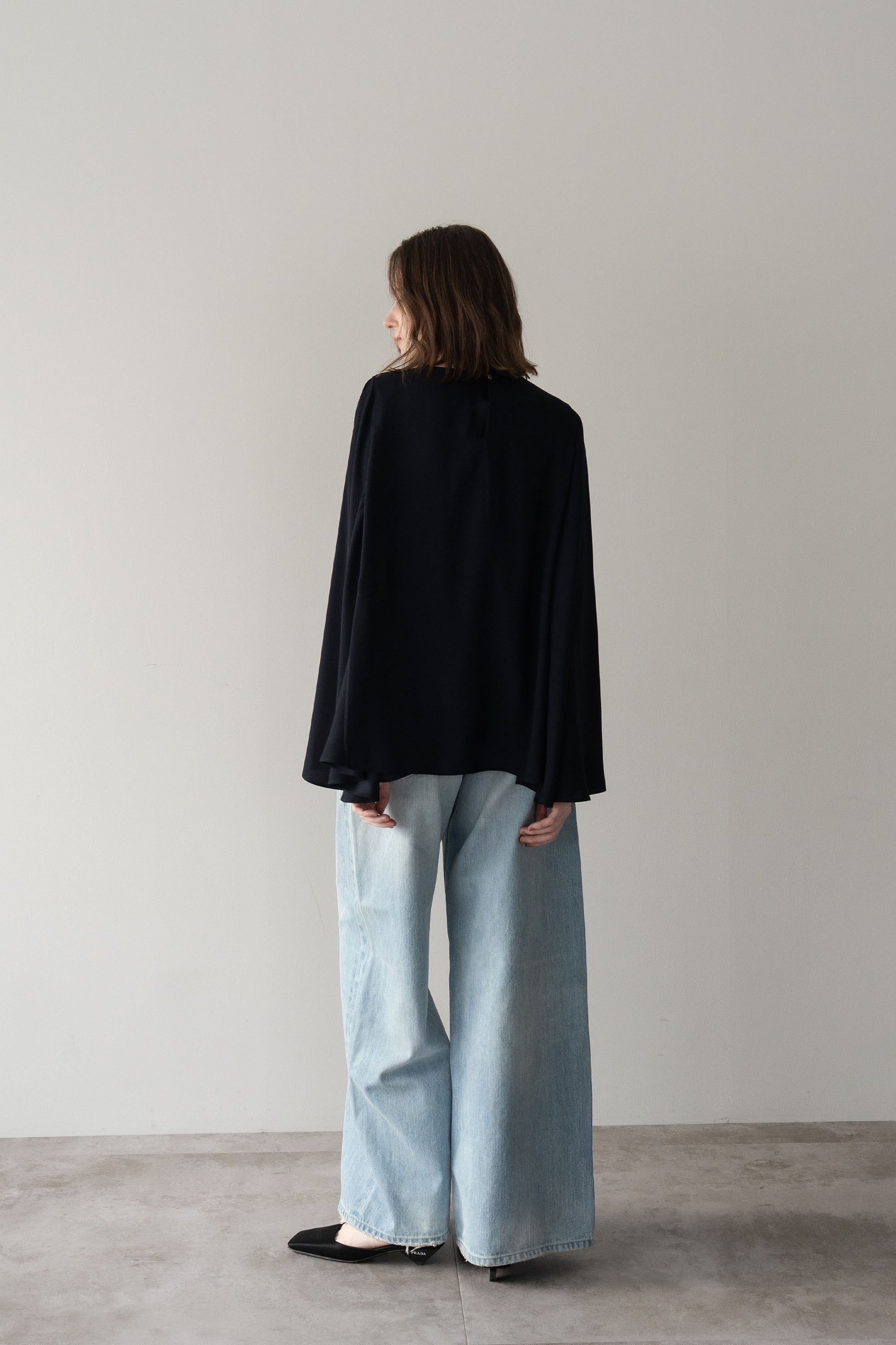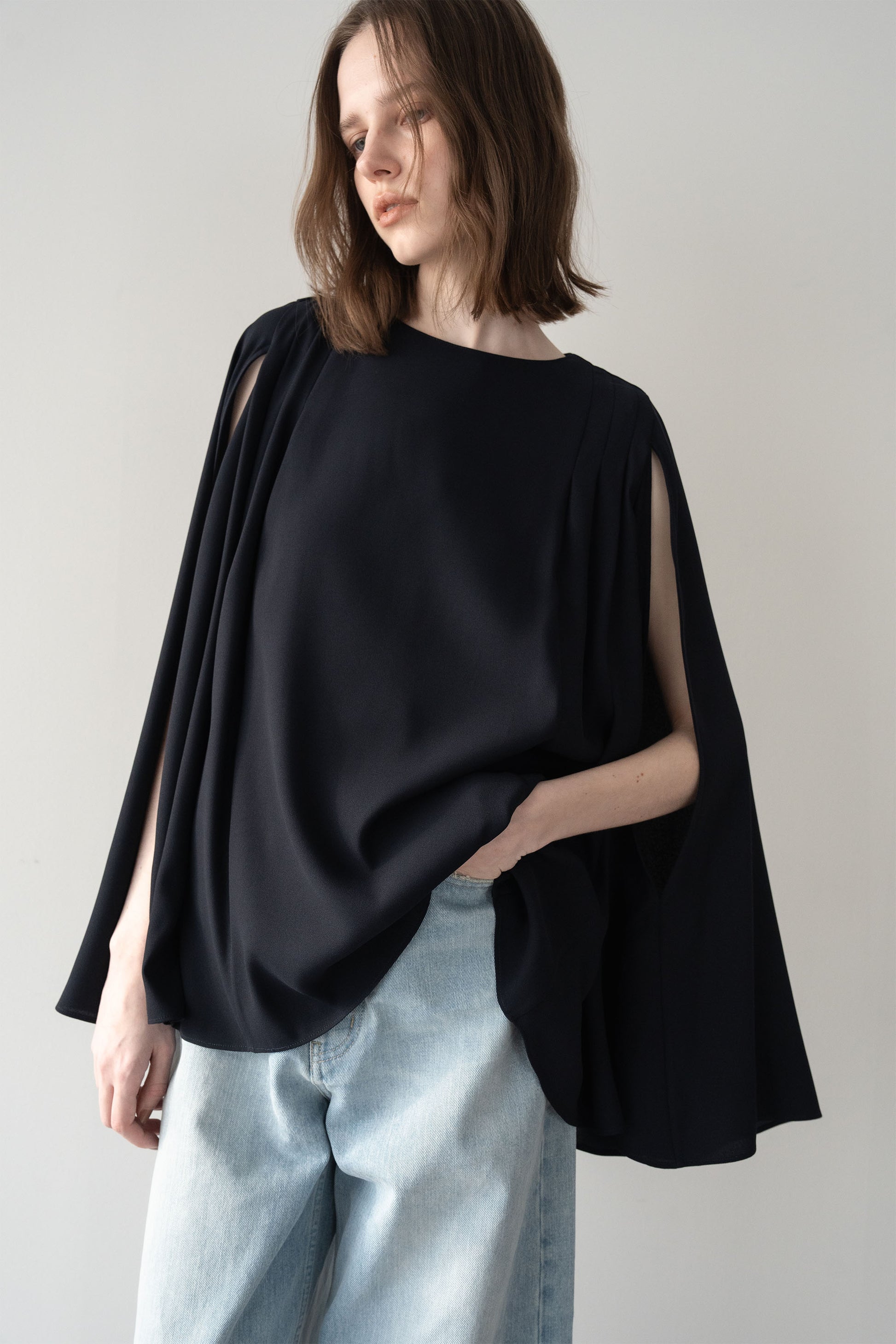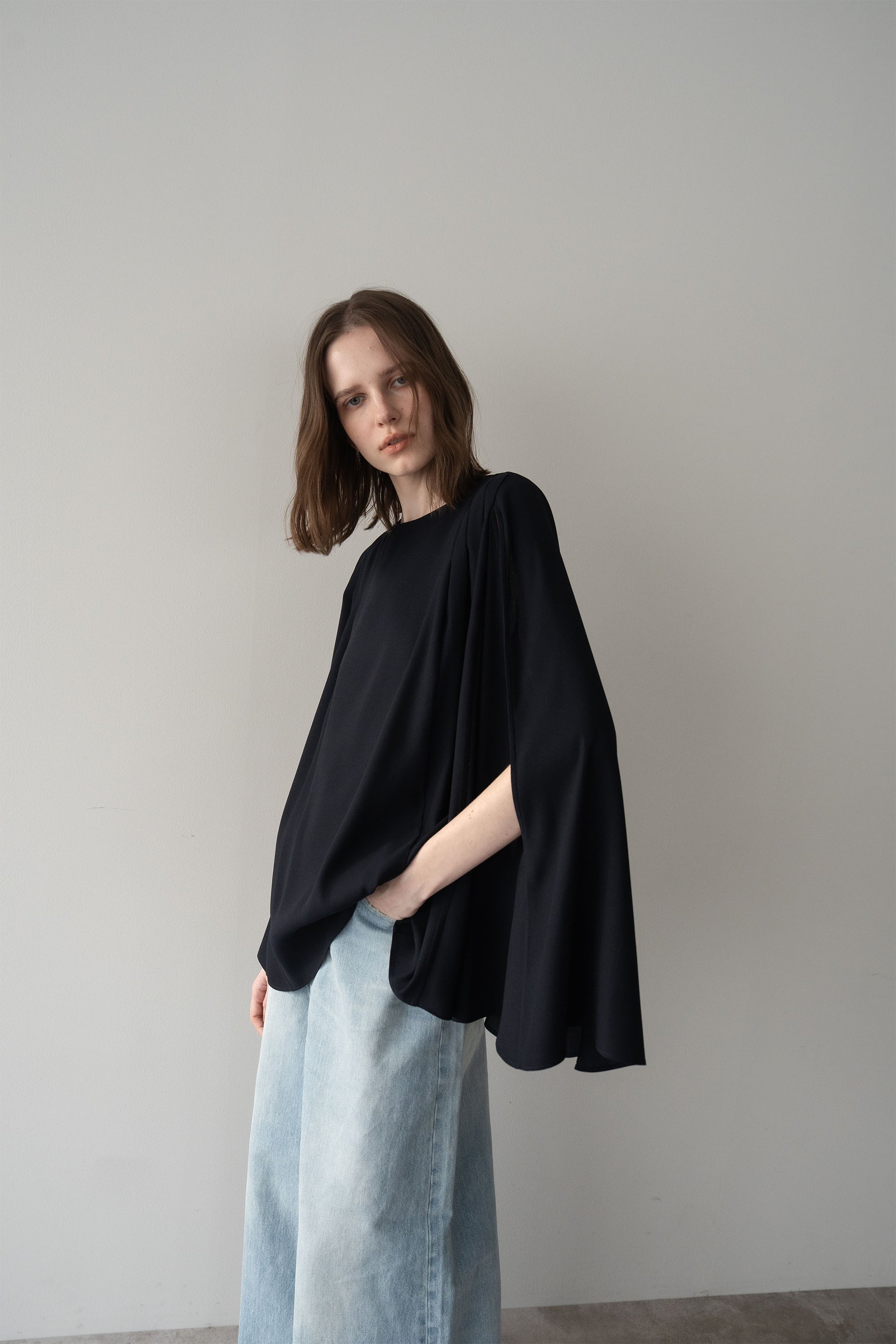“動きのあるシルエットが印象的な、ポンチョブラウス”