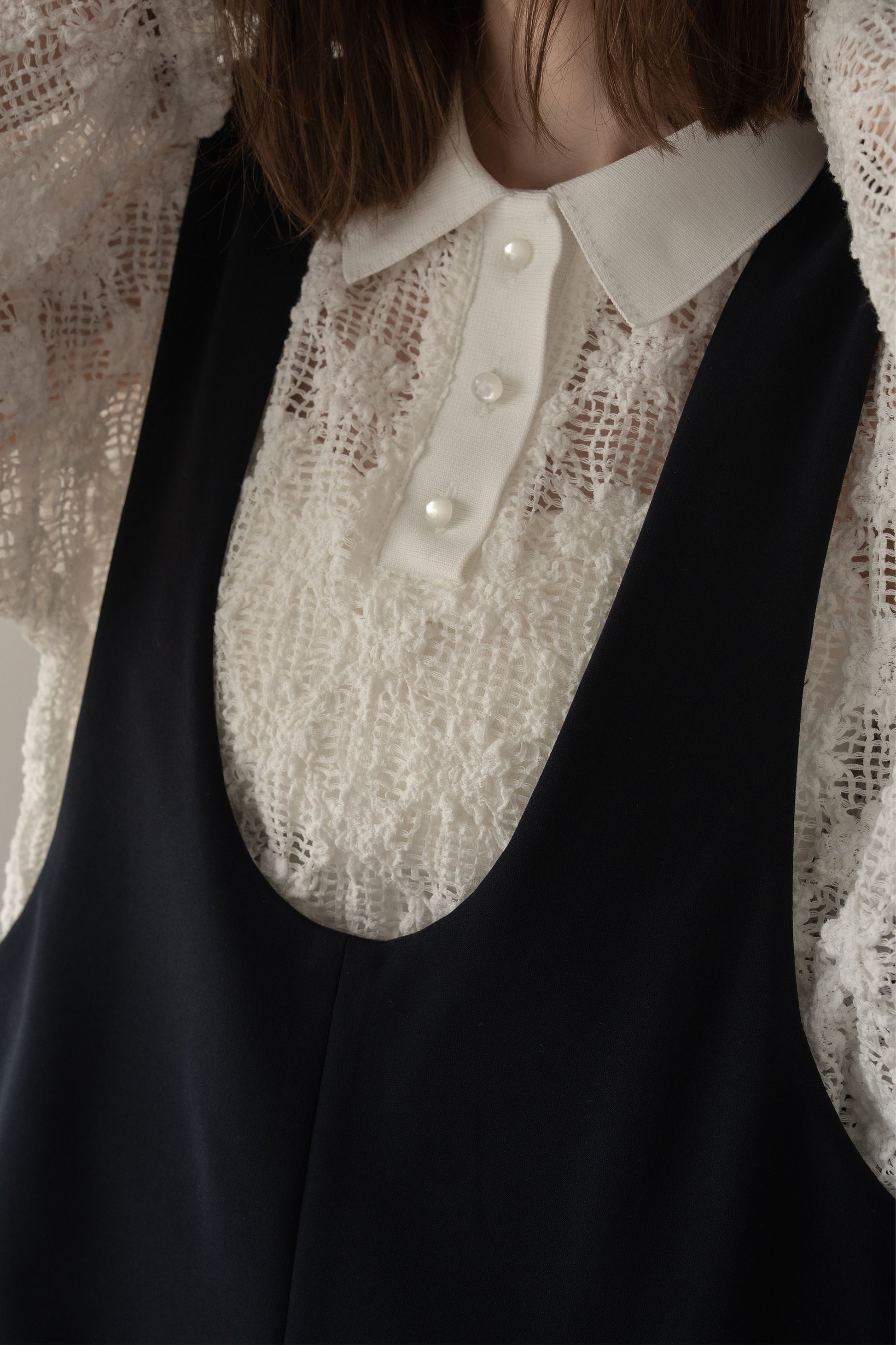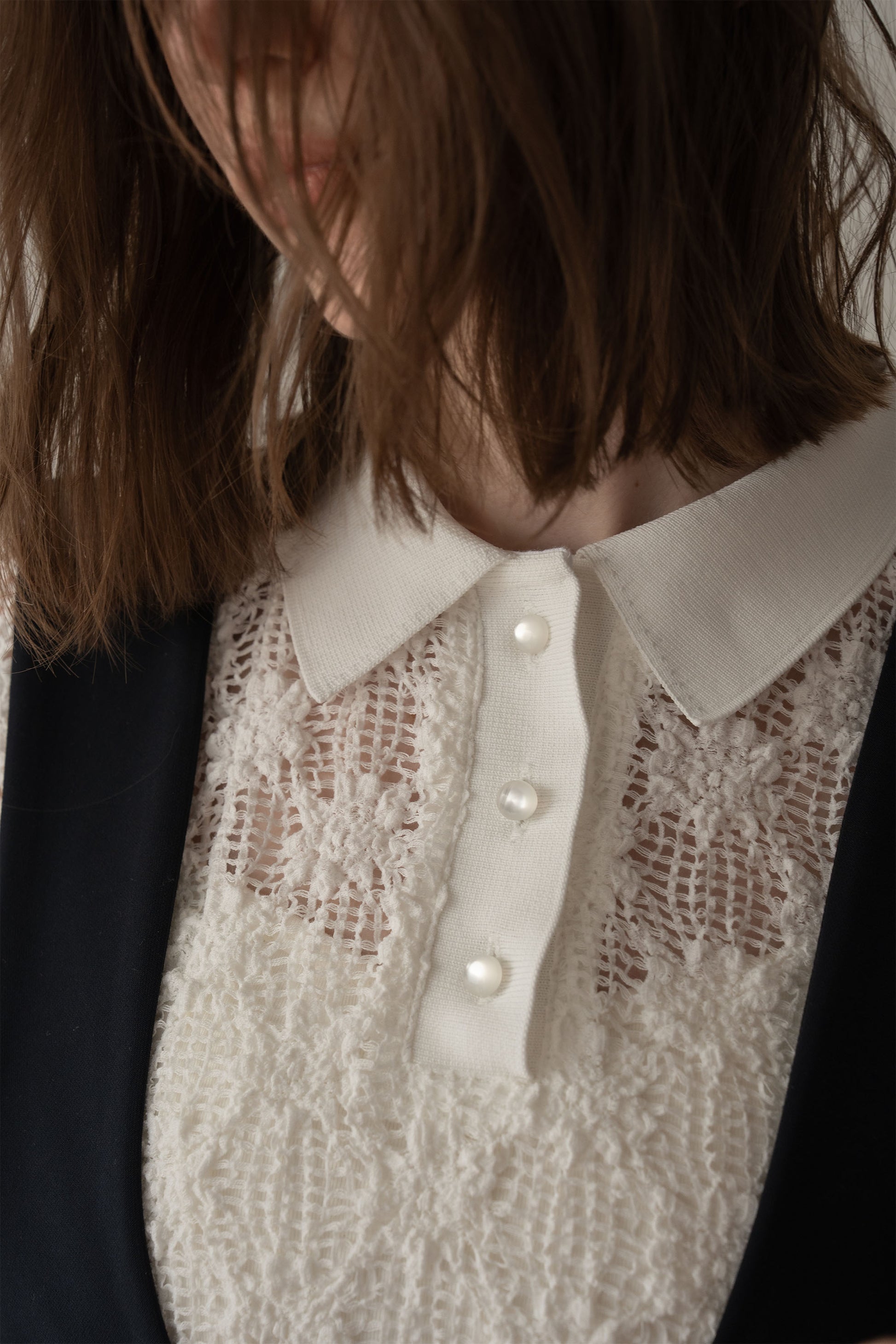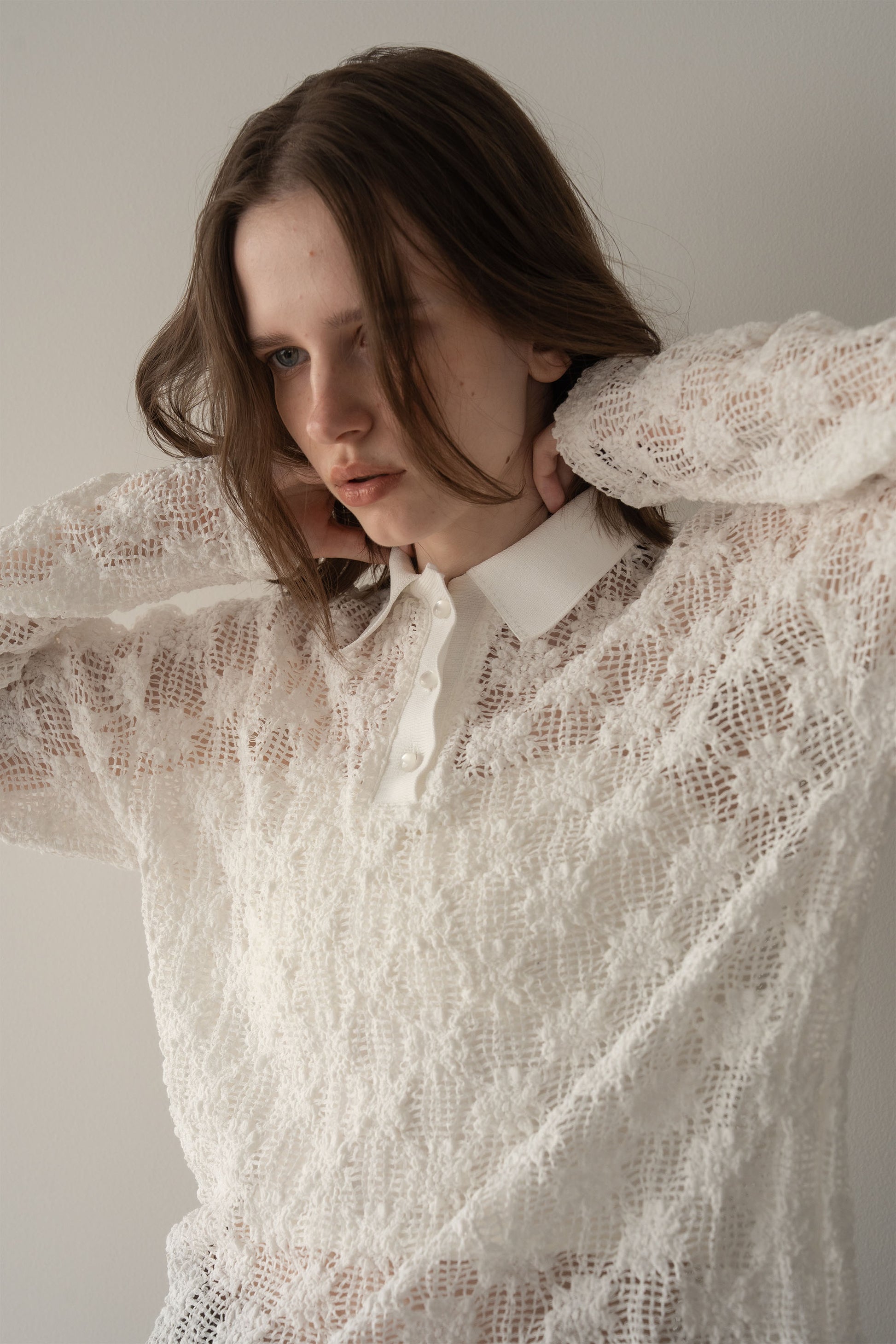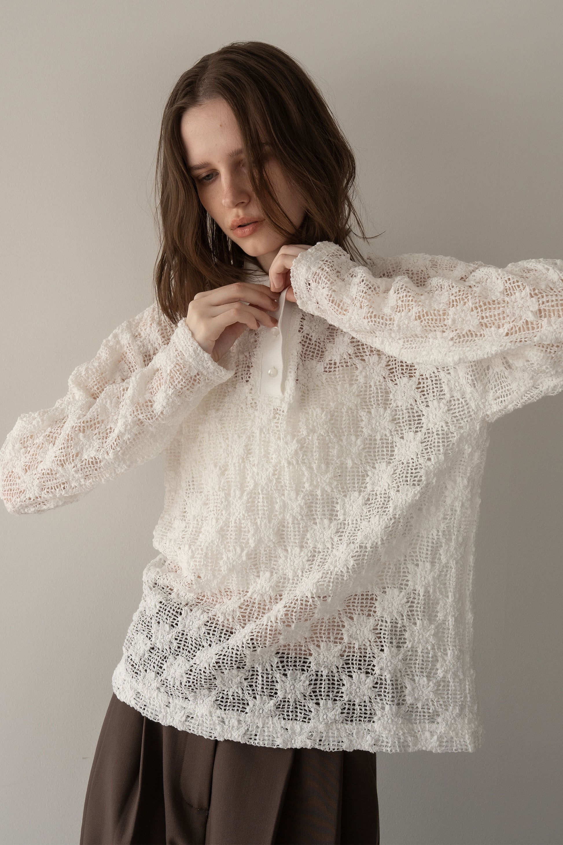 立体感のあるレース素材が印象的なポロトップス。